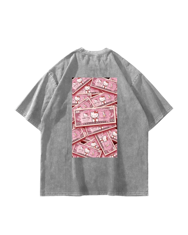Hello Kitty Money Baskılı Oversize Unisex Yıkamalı Beyaz Tshirt