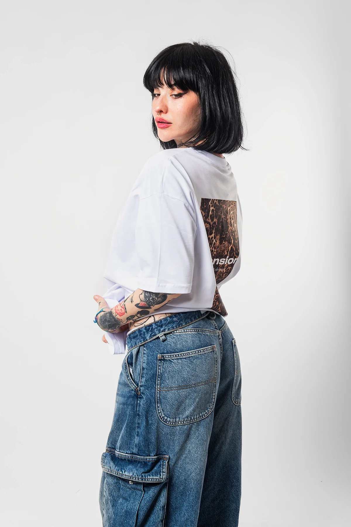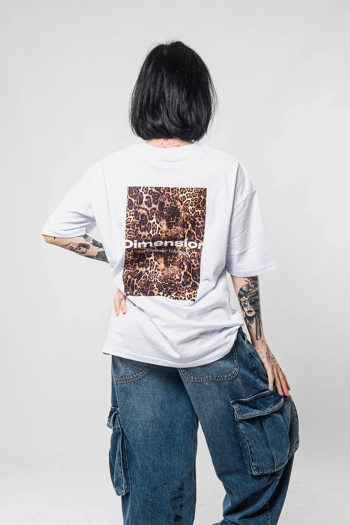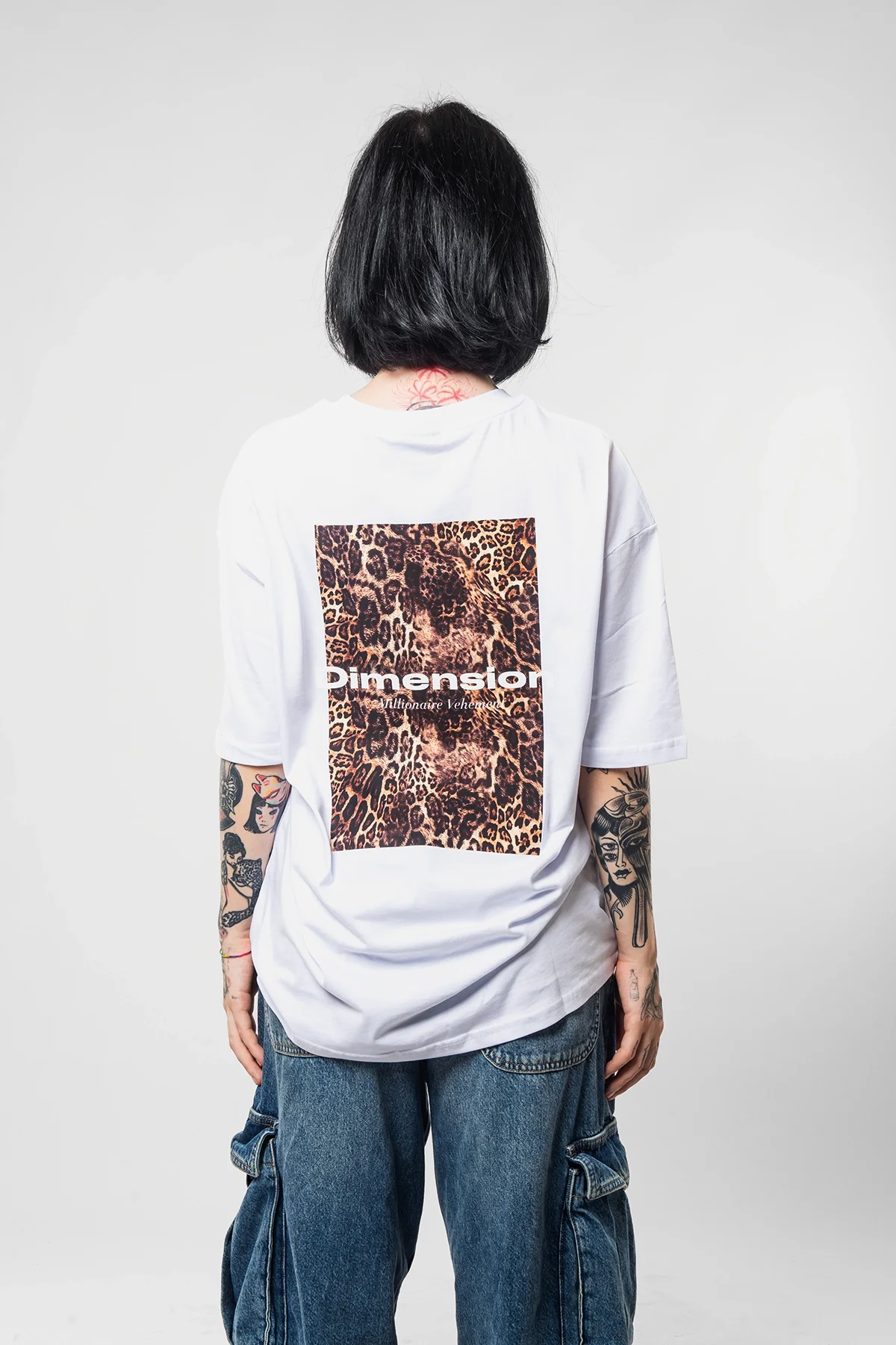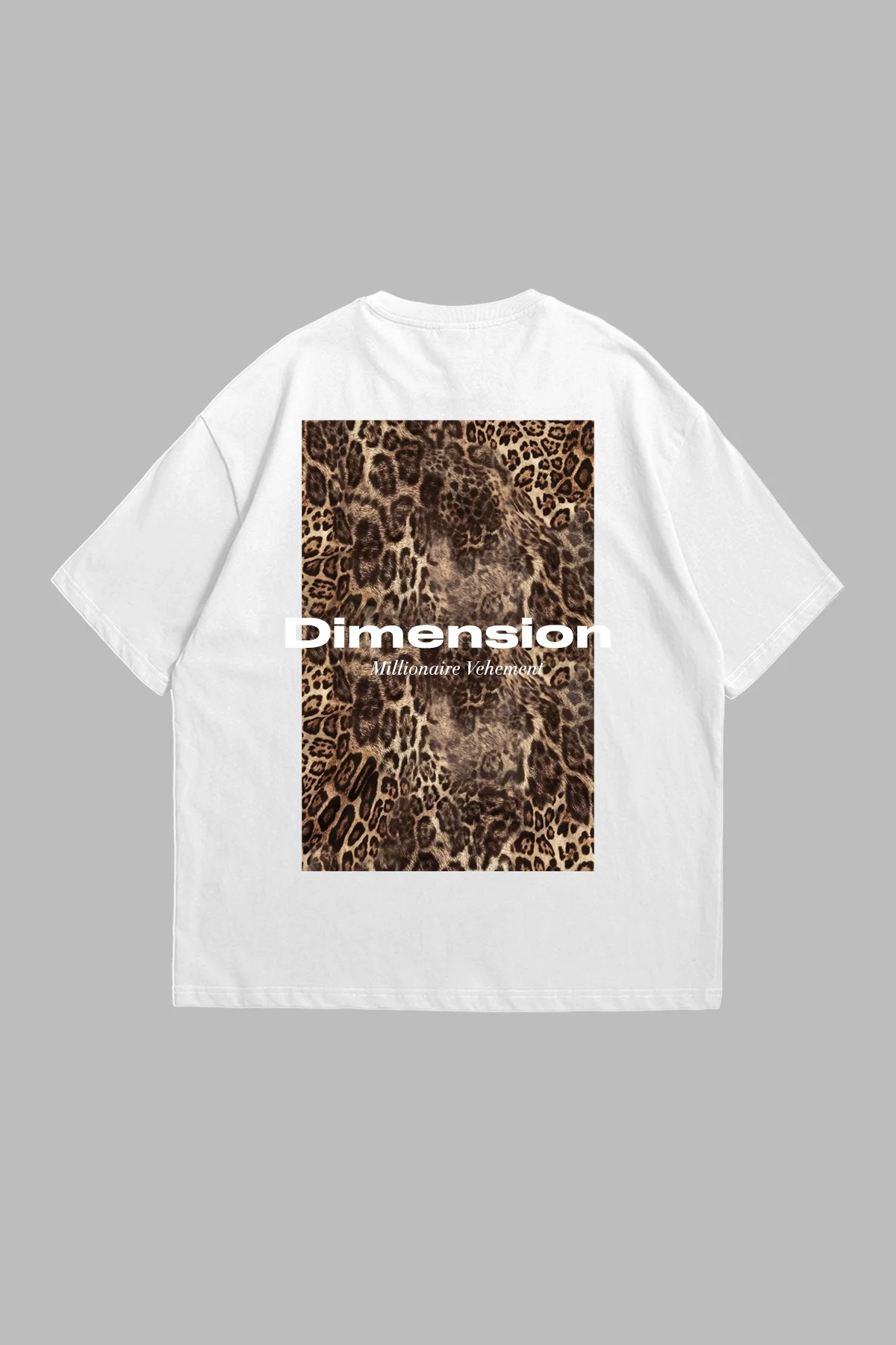 DİMENSİON BASKILI LEOPAR DESENLİ 24/1 OVERSİZE UNİSEX BEYAZ TSHİRT
