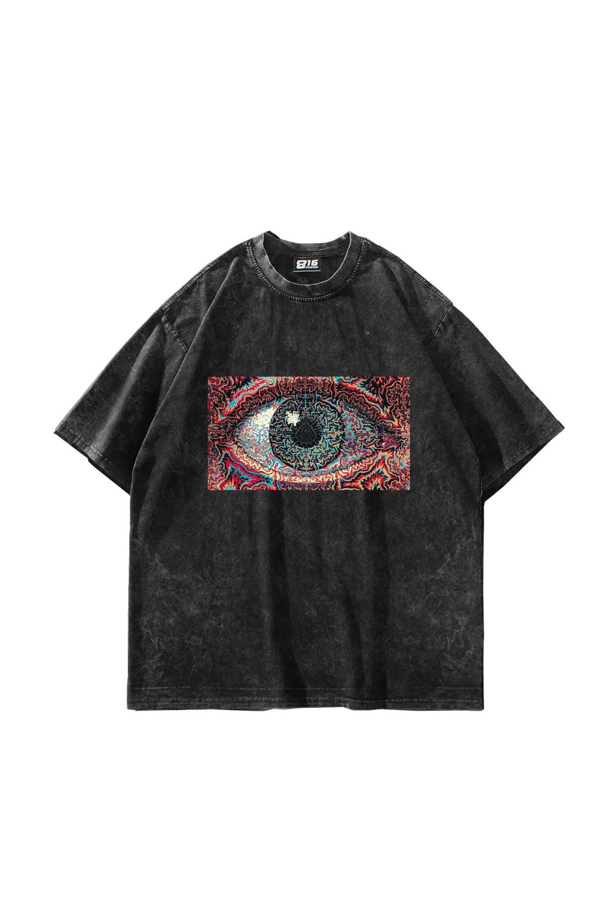 Eye Hallucination baskılı oversize unisex yıkanmış siyah tshirt ile sokak modasına uyum sağlayın, Bak Moda kalitesiyle şıklığı keşfedin!