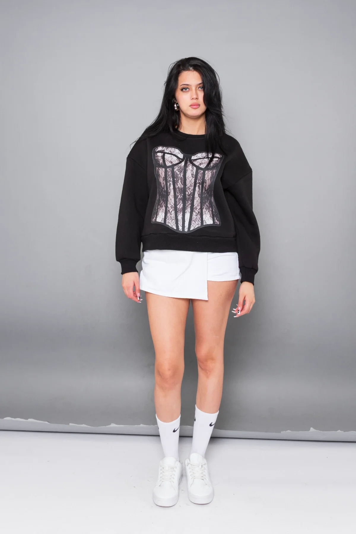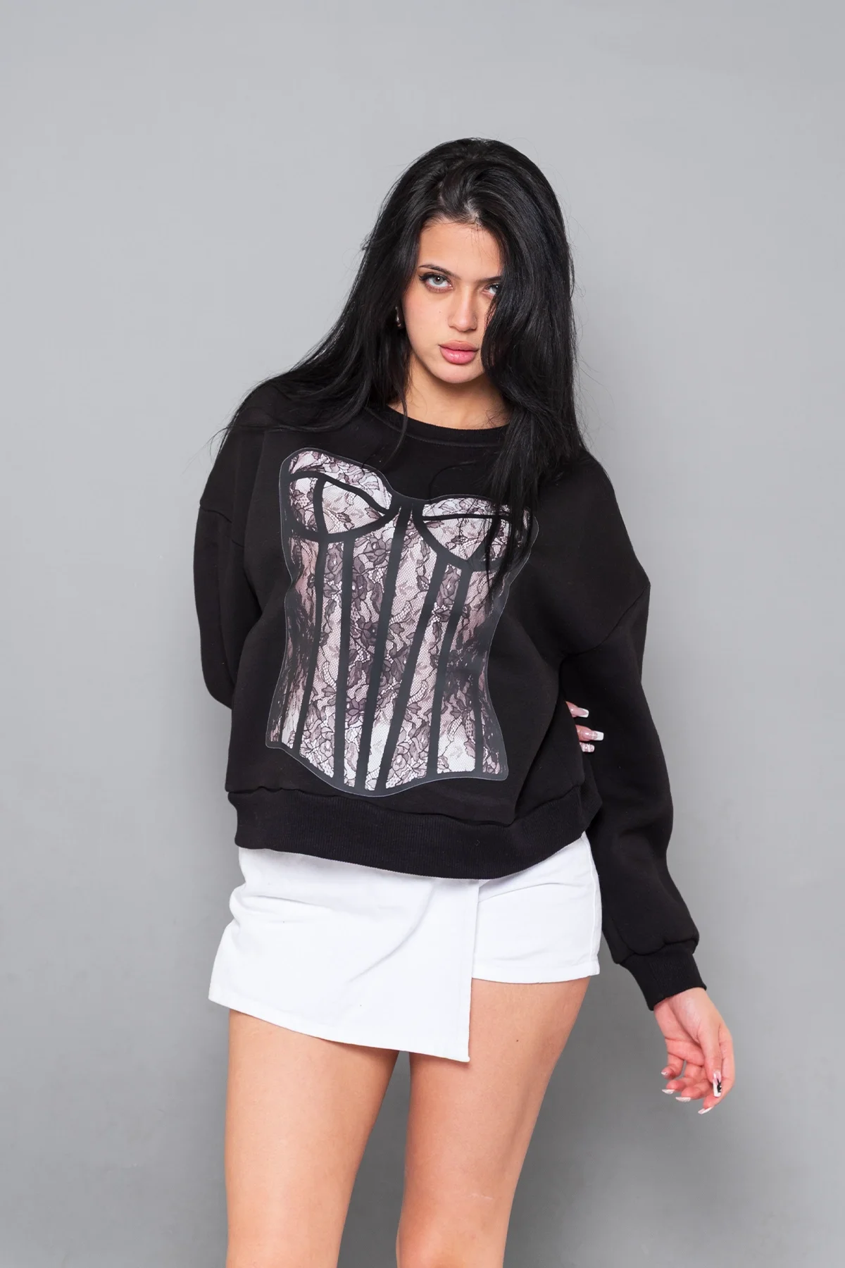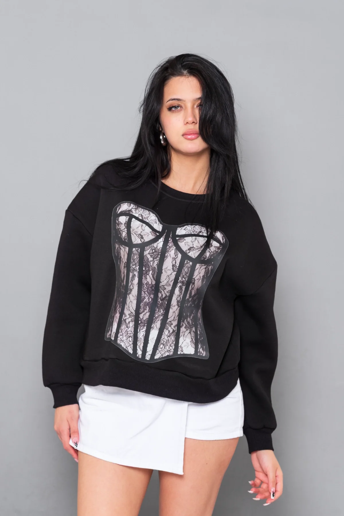 Fit Corset Baskılı Kapüşonsuz Relaxed Fit Kadın Siyah Sweatshirt