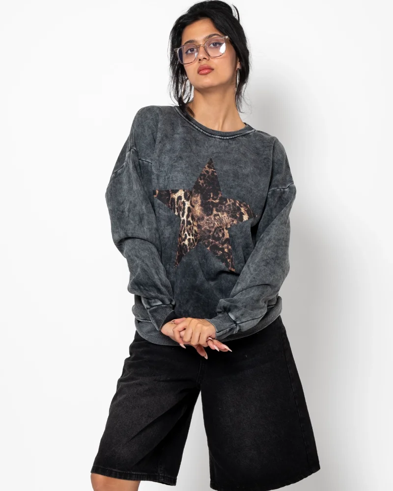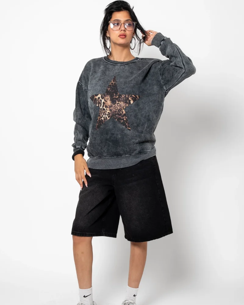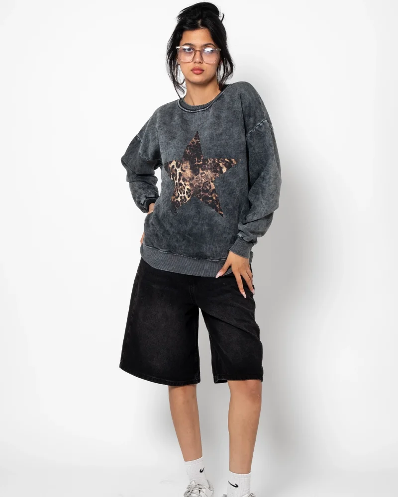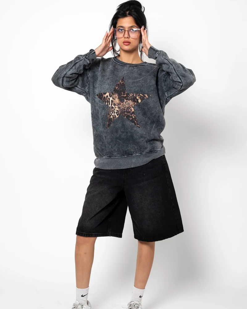Starz Leopar Baskılı Yıkamalı Siyah Oversize Unisex Sweatshirt