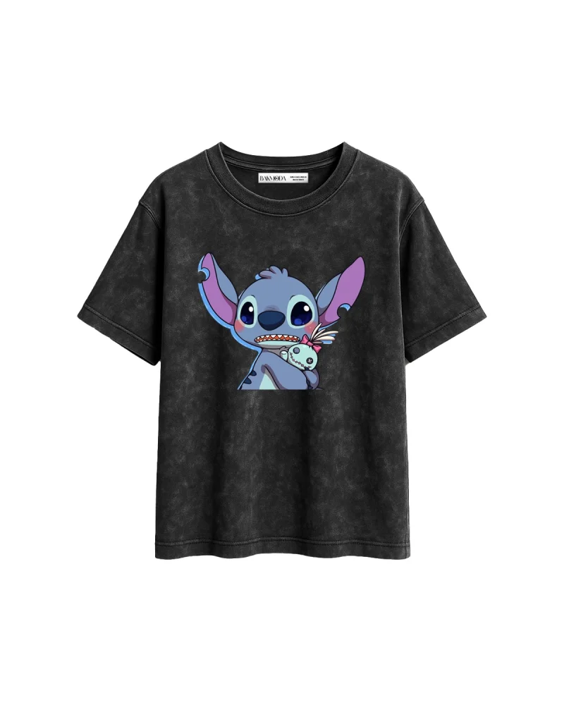 Stitch Baby Baskılı Relaxed Fit Yıkamalı Siyah Kadın Tshirt