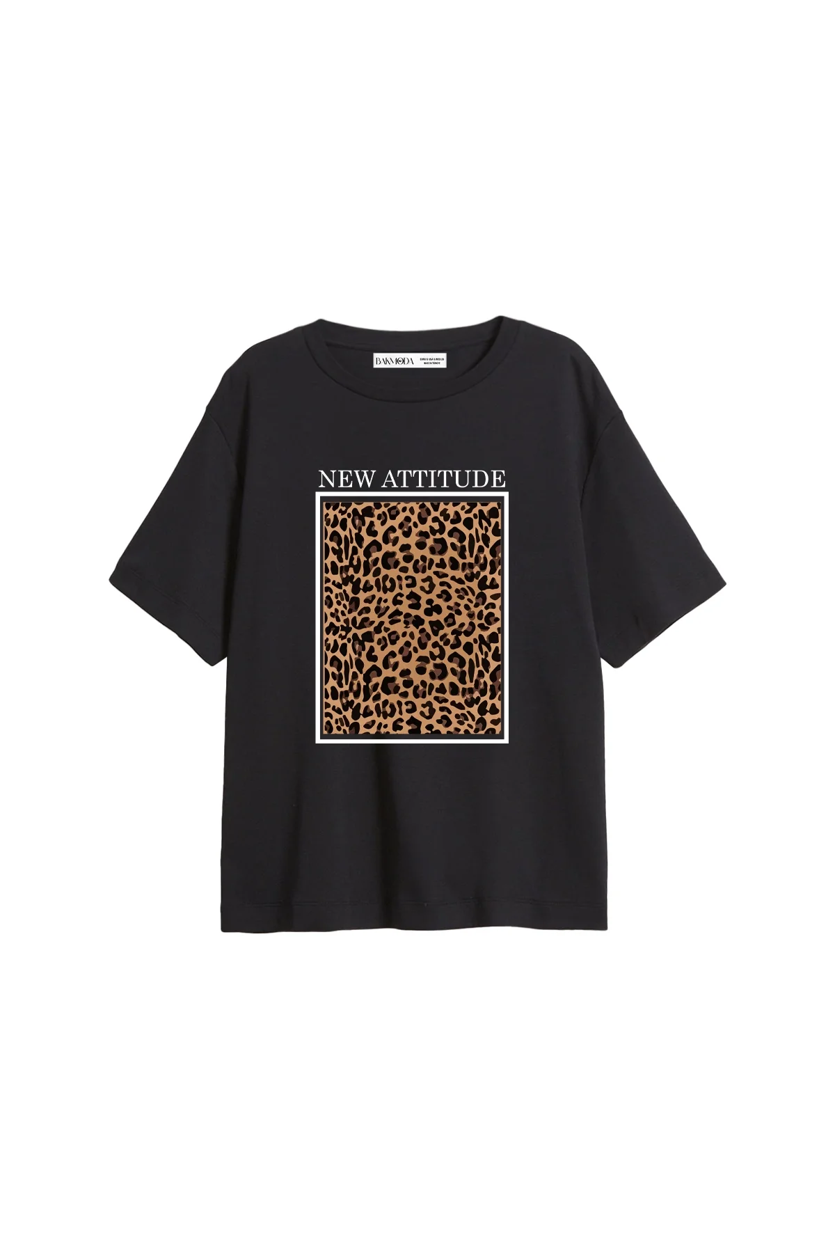 NEW ATTITUDE BASKILI RELAXED FİT SİYAH KADIN TSHİRT