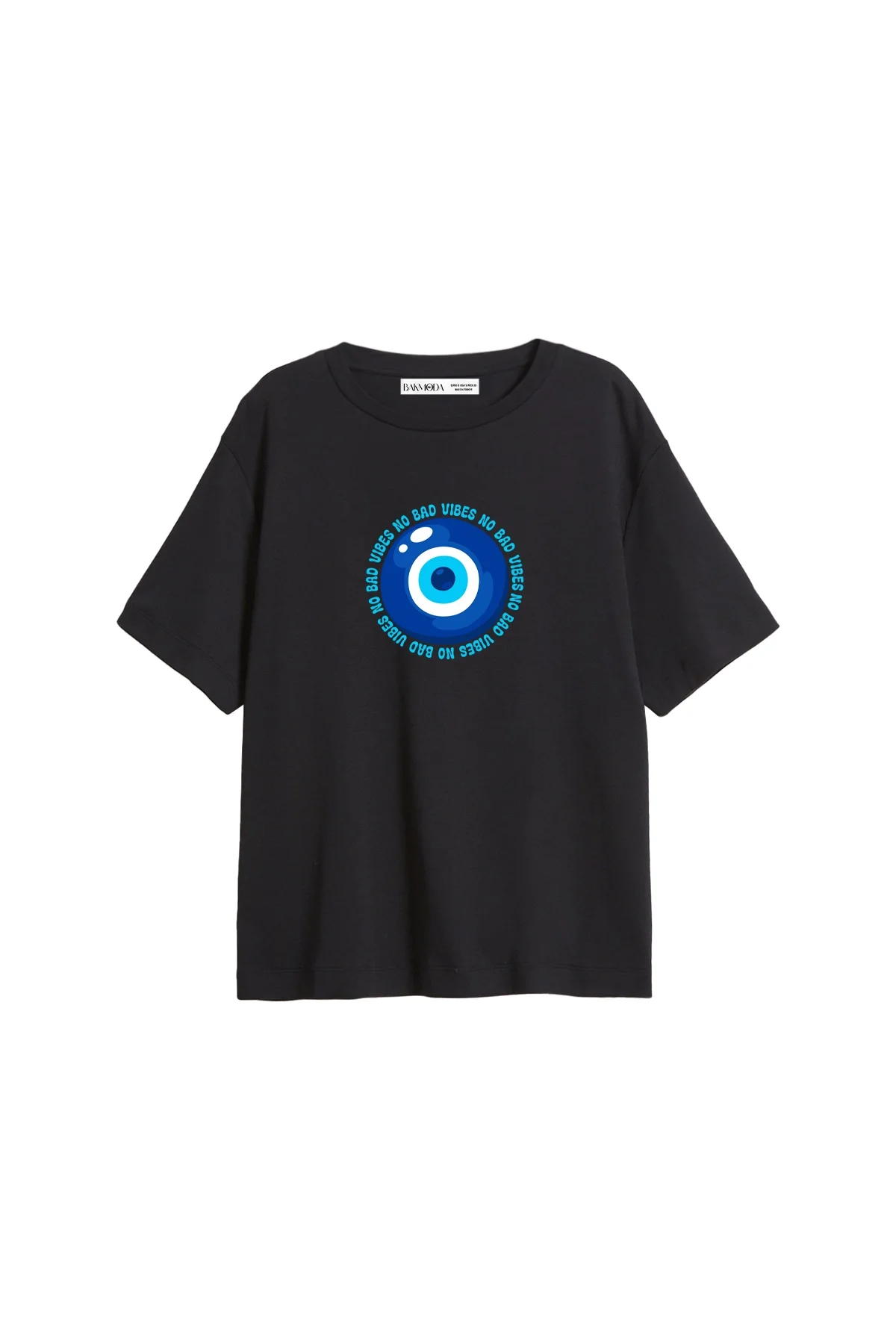 NO BAD VİBES BASKILI RELAXED FİT SİYAH KADIN TSHİRT