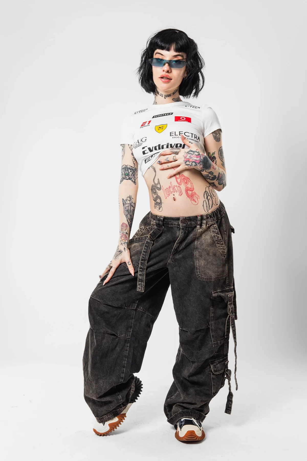 RACİNG LOGO BASKILI KADIN KISA KOLLU BEYAZ CROP