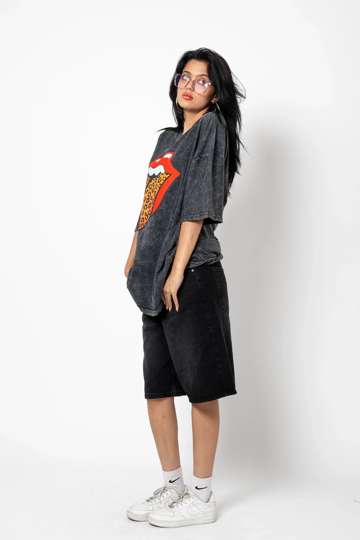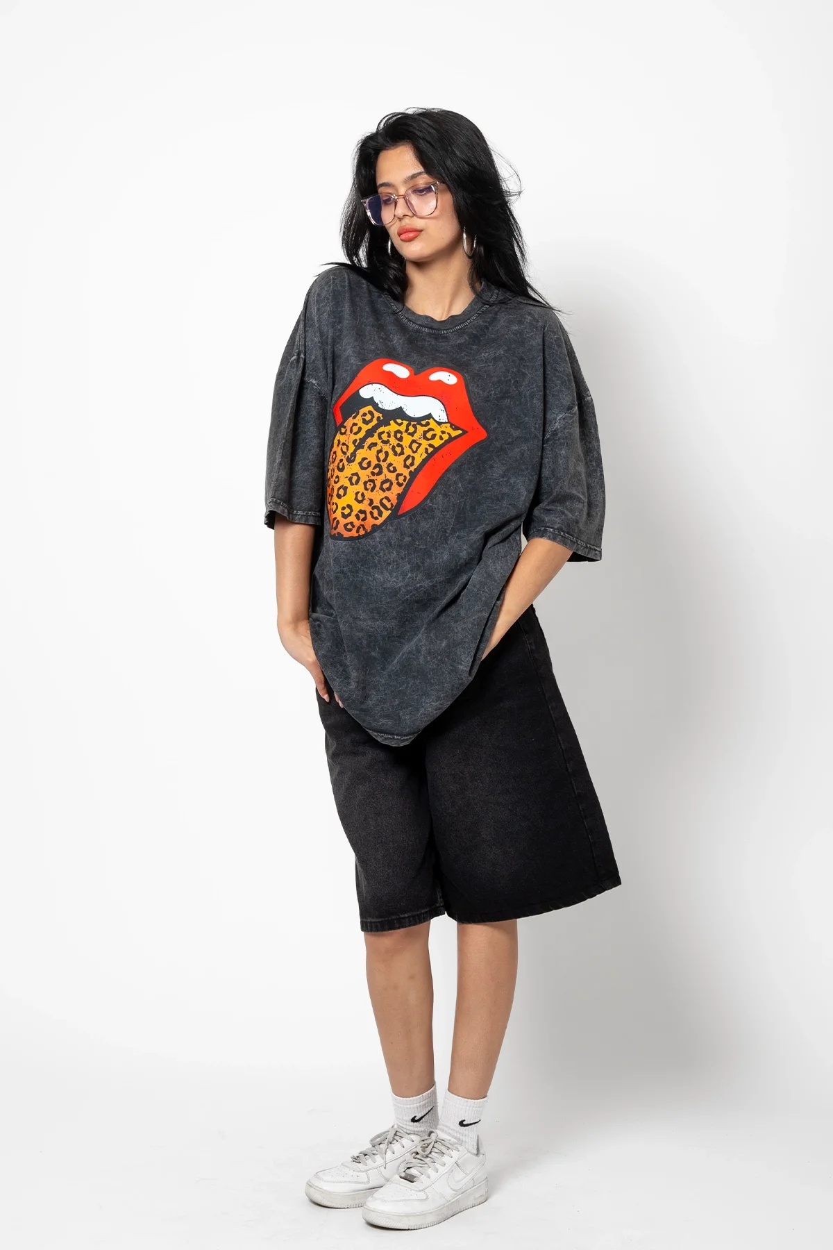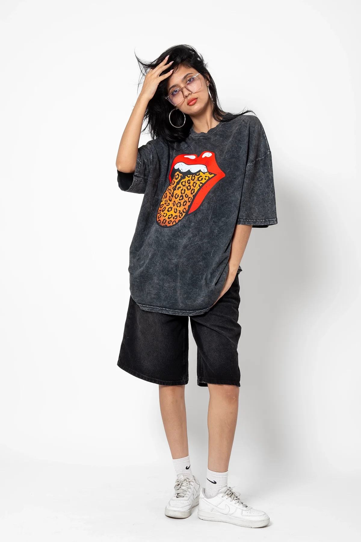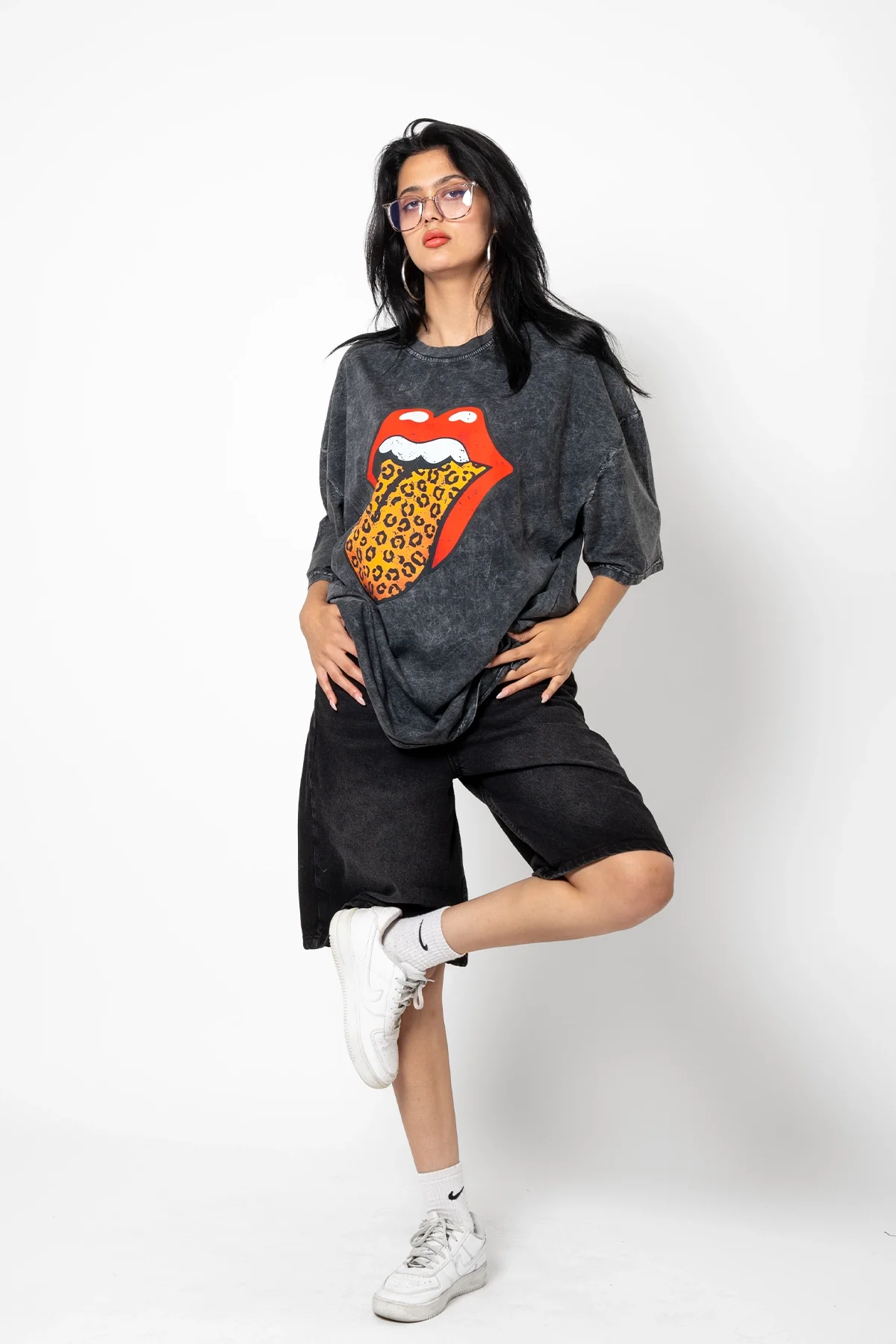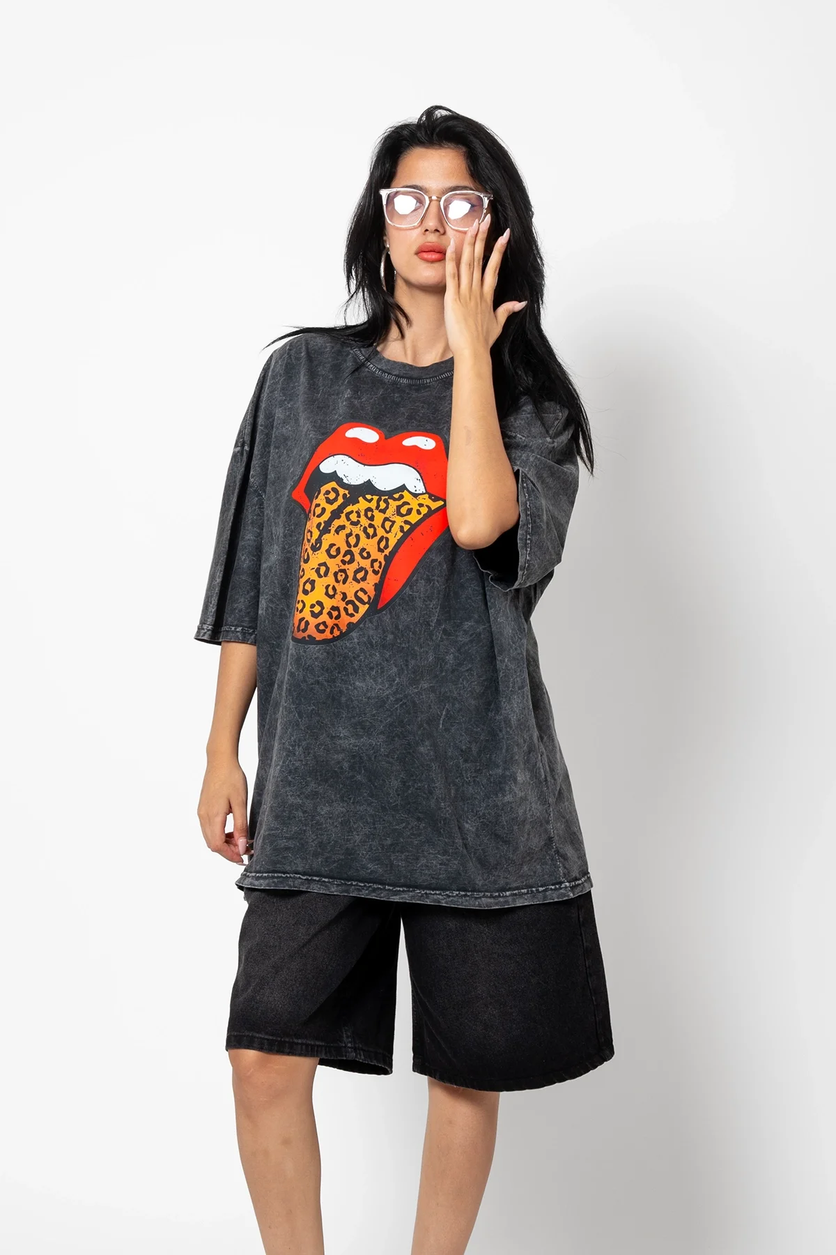 ROLLİNG STONES LEOPAR BASKILI OVERSİZE UNİSEX PREMİUM YIKAMALI SİYAH TSHİRT
