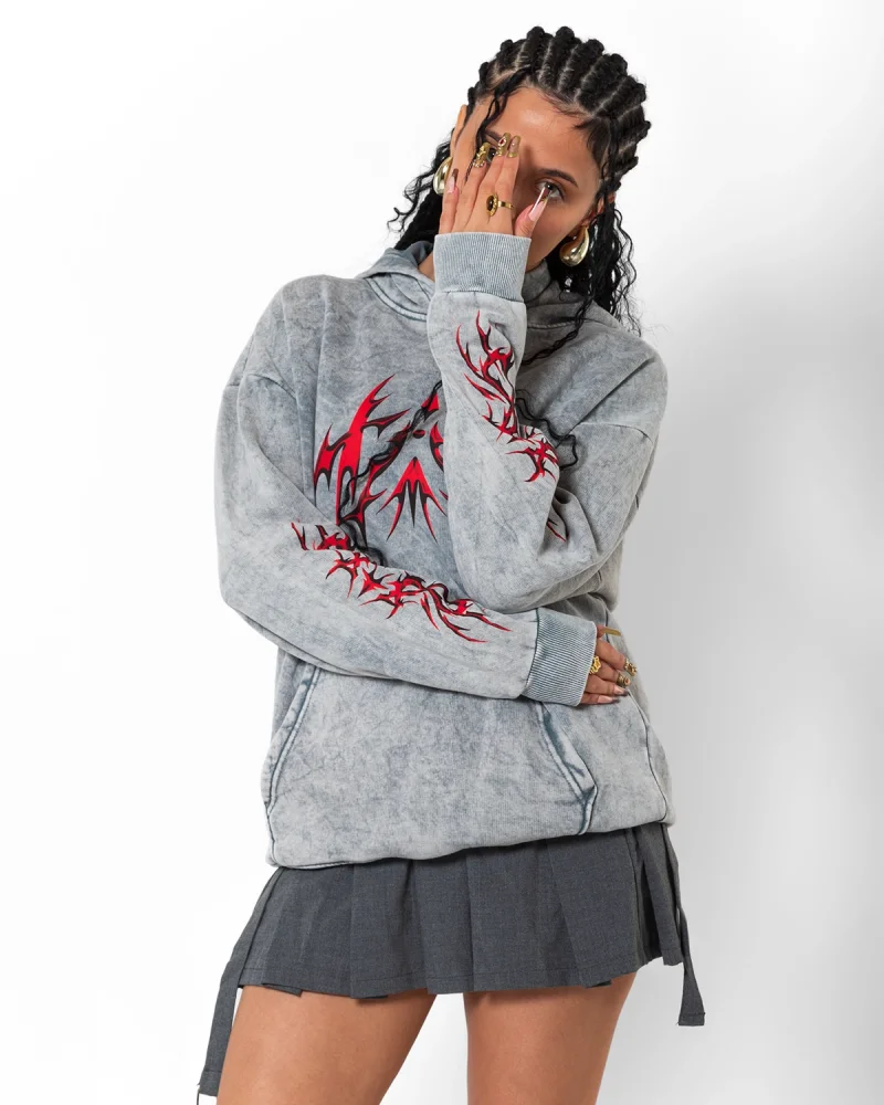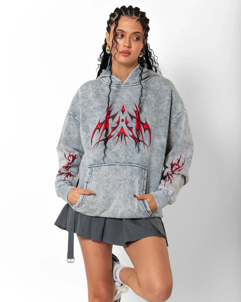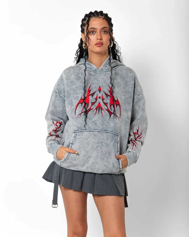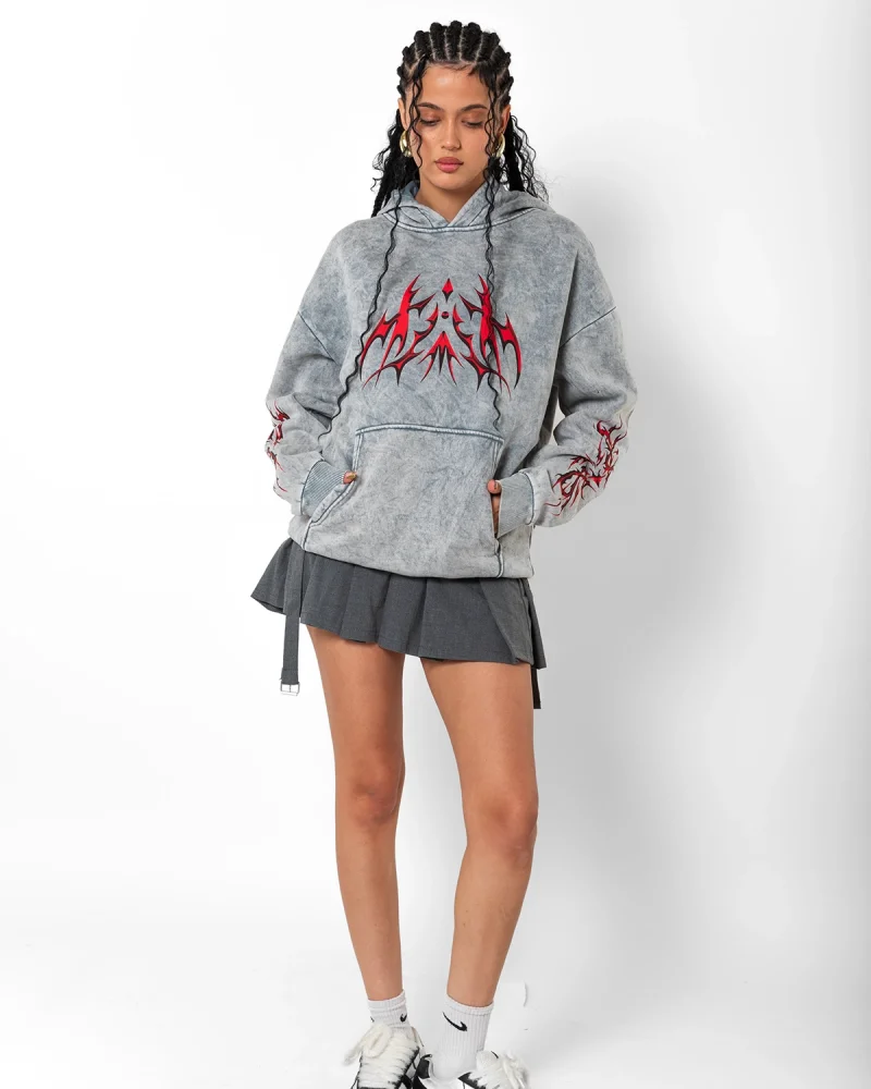 Holographic Red Baskılı Oversize Unisex Premium Yıkamalı Beyaz Hoodie