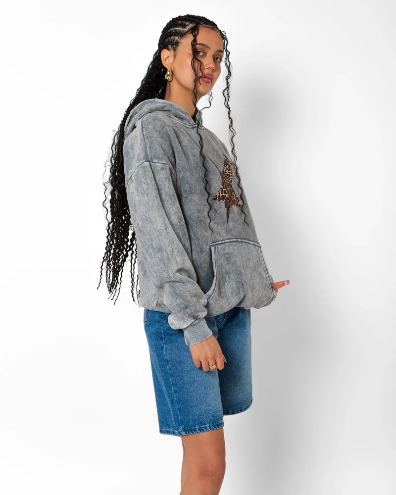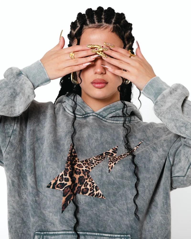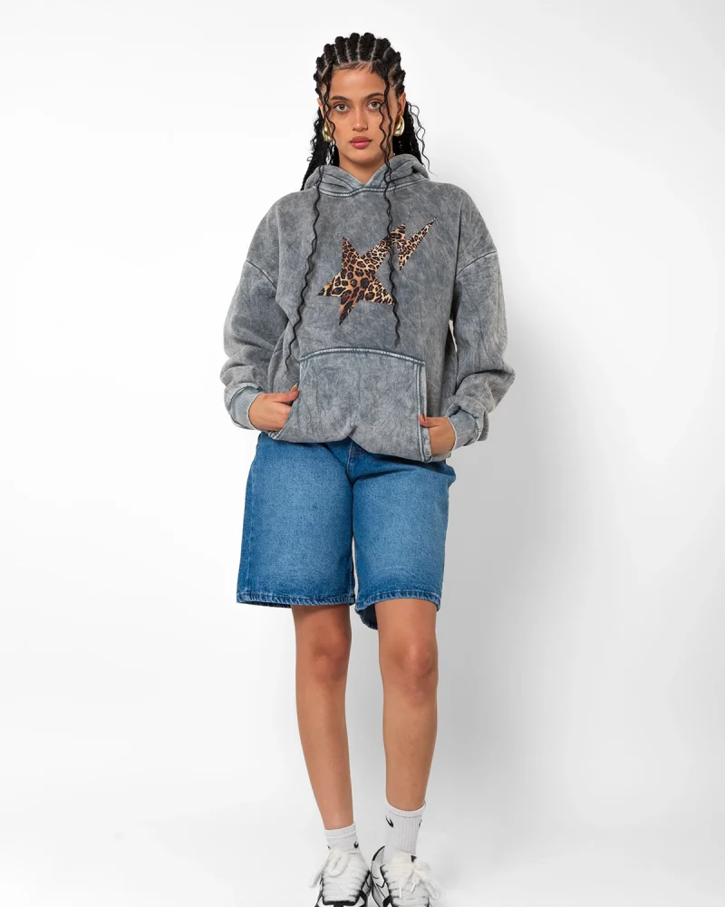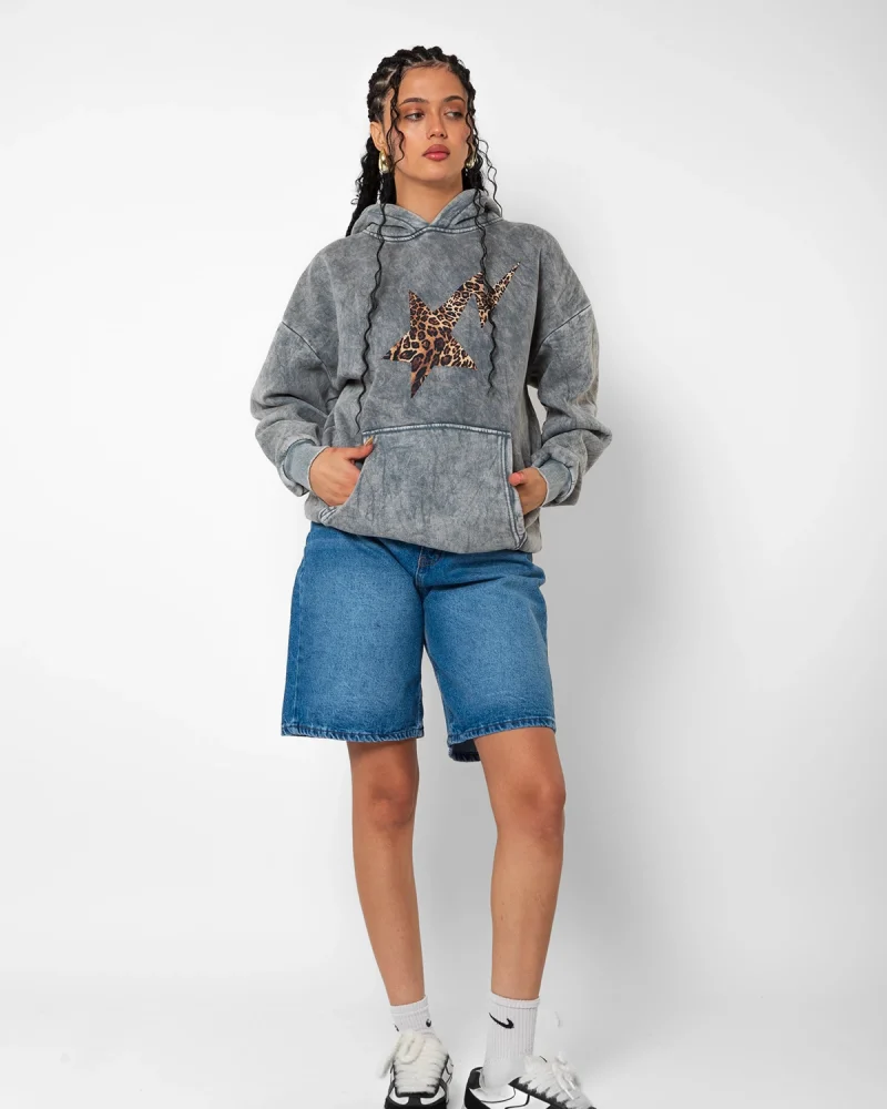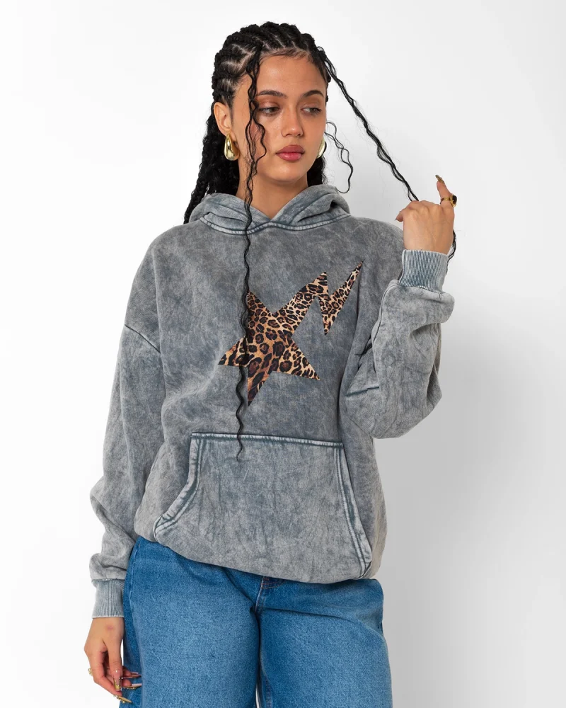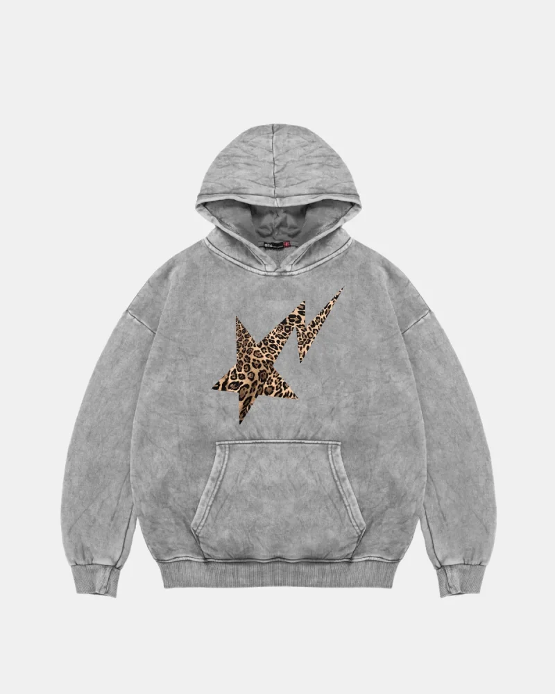 Leopar Falling Star Baskılı Oversize Unisex Premium Yıkamalı Beyaz Hoodie