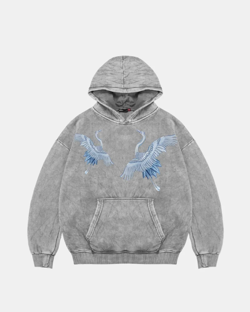 Mavi Turna Baskılı Oversize Unisex Premium Yıkamalı Beyaz Hoodie