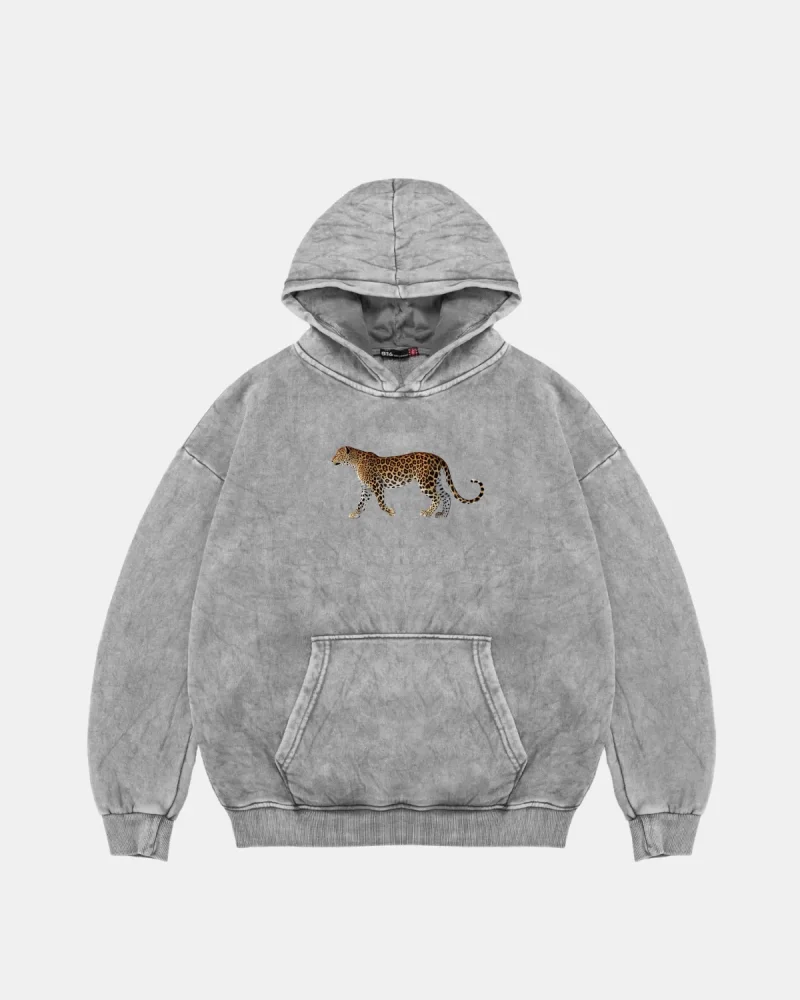 Walking Leopard Baskılı Oversize Unisex Premium Yıkamalı Beyaz Hoodie