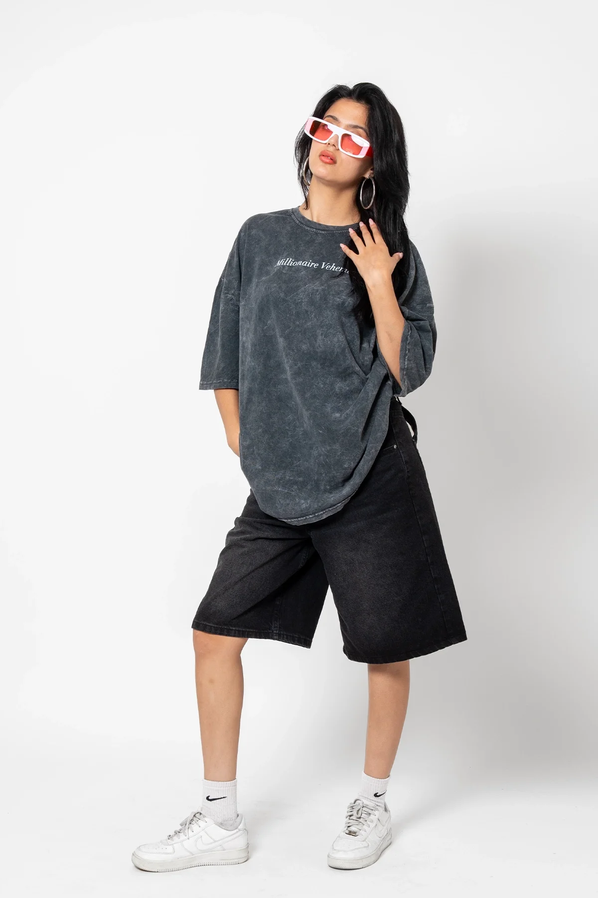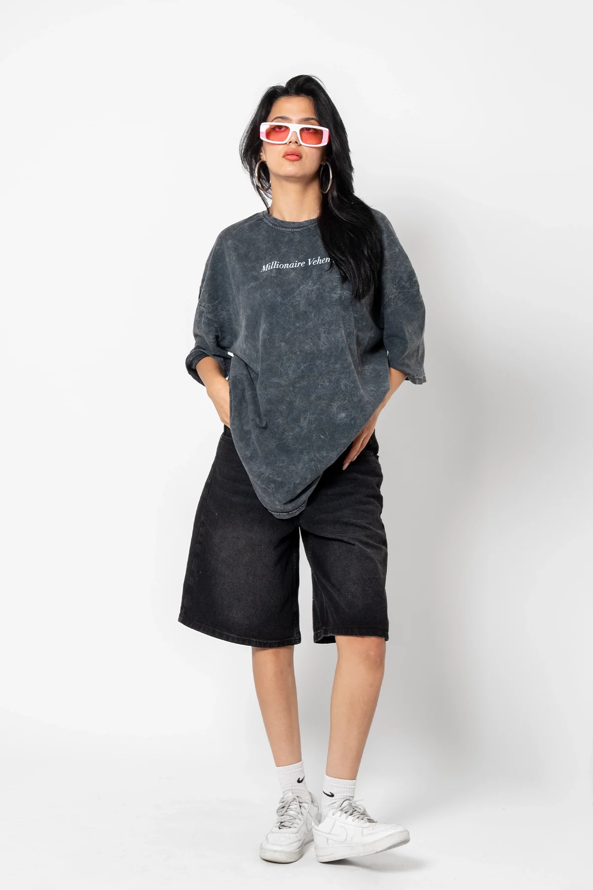 Polished Rose Baskılı Oversize Unisex Yıkamalı Siyah Tshirt