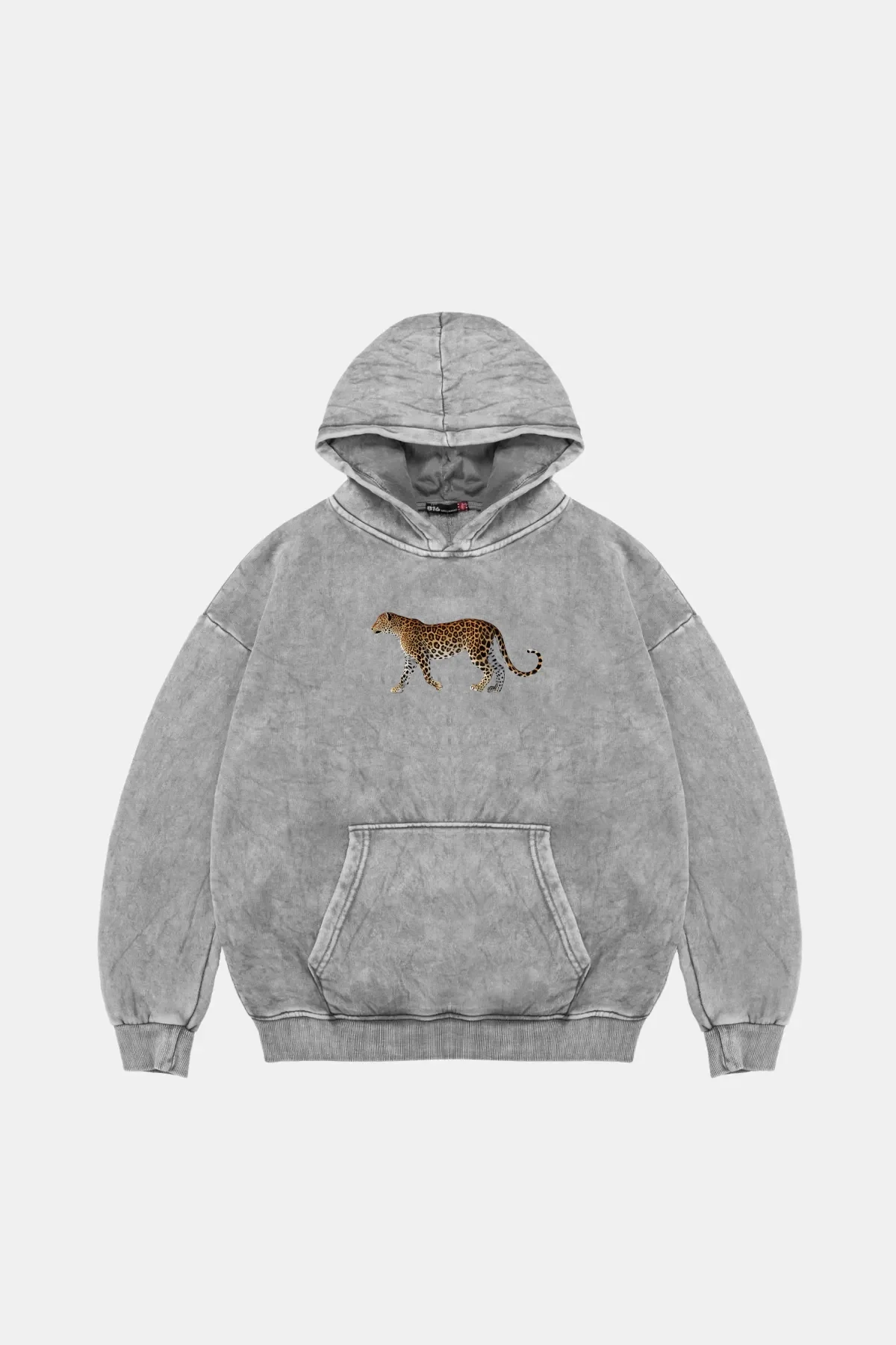 WALKİNG LEOPARD BASKILI OVERSİZE UNİSEX PREMİUM YIKAMALI BEYAZ HOODİE