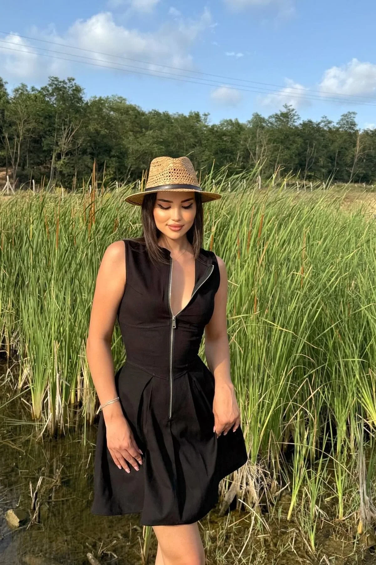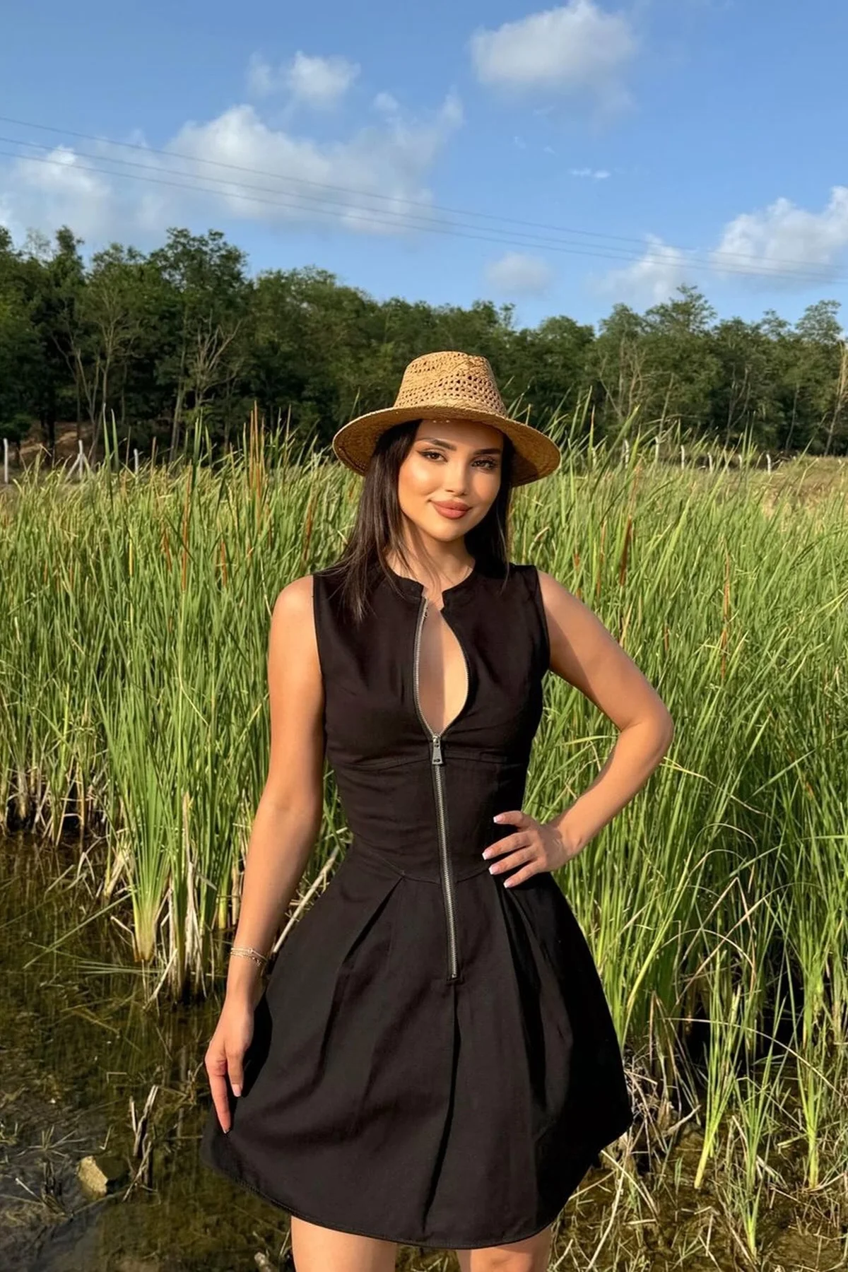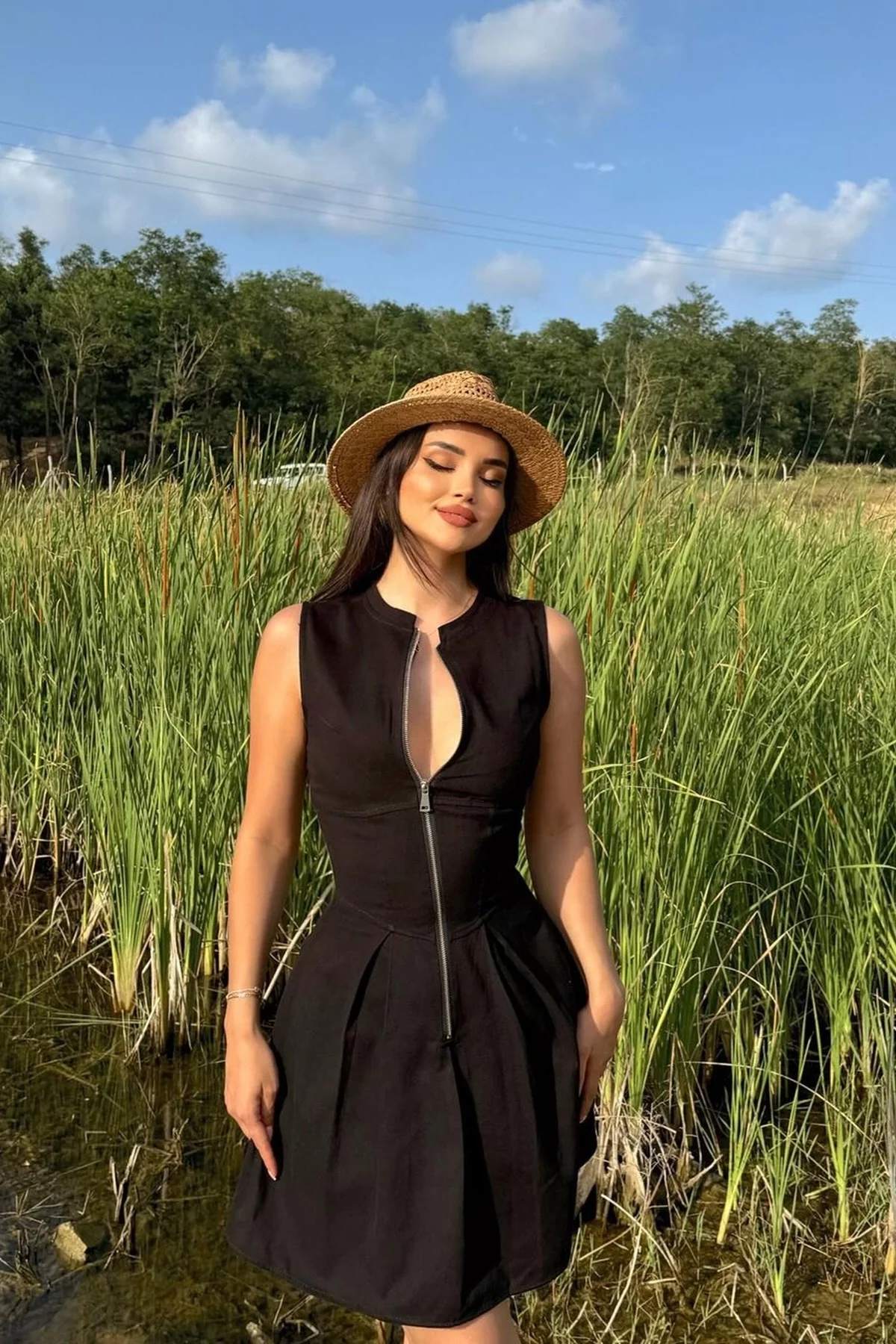 YARIM FERMUARLI SIFIR KOLLU SİYAH MİNİ ELBİSE