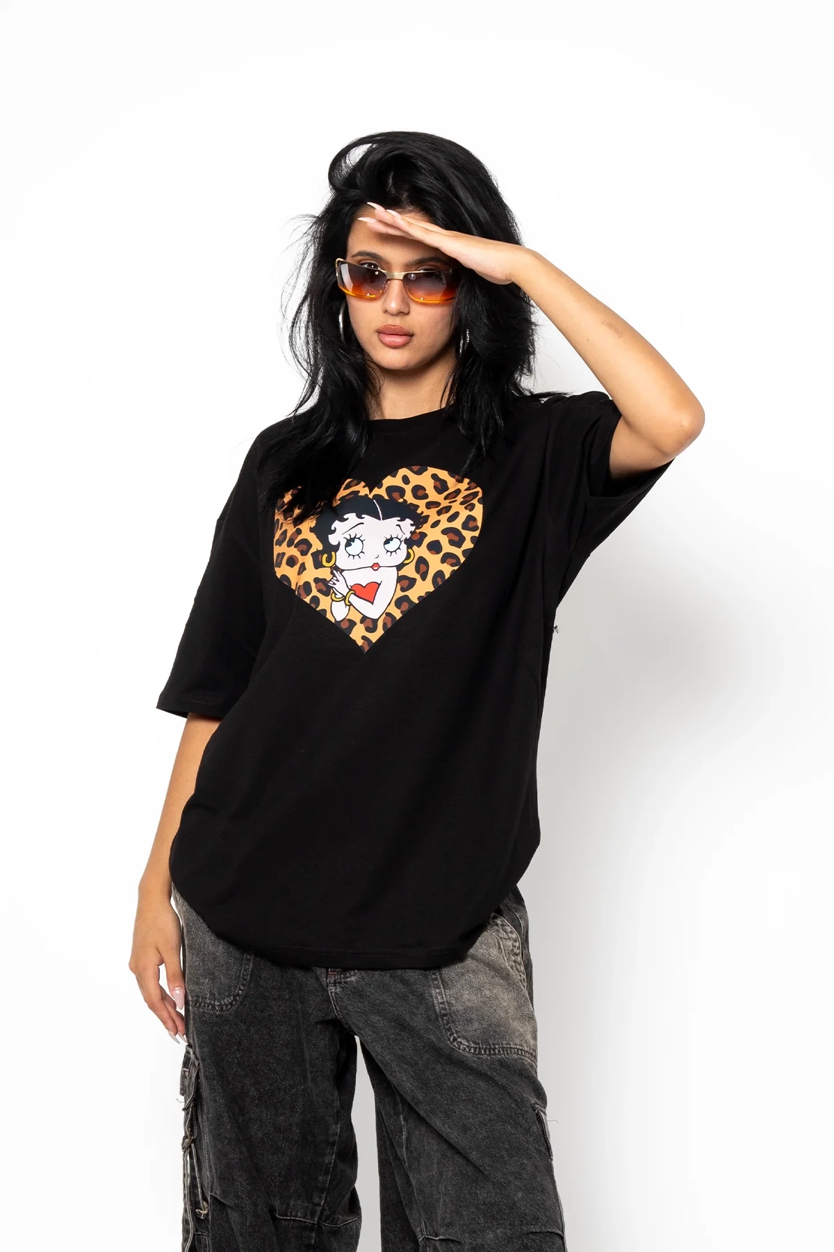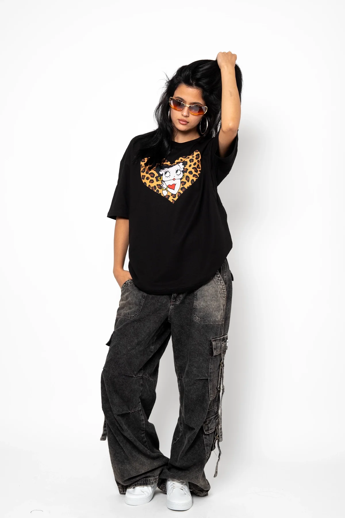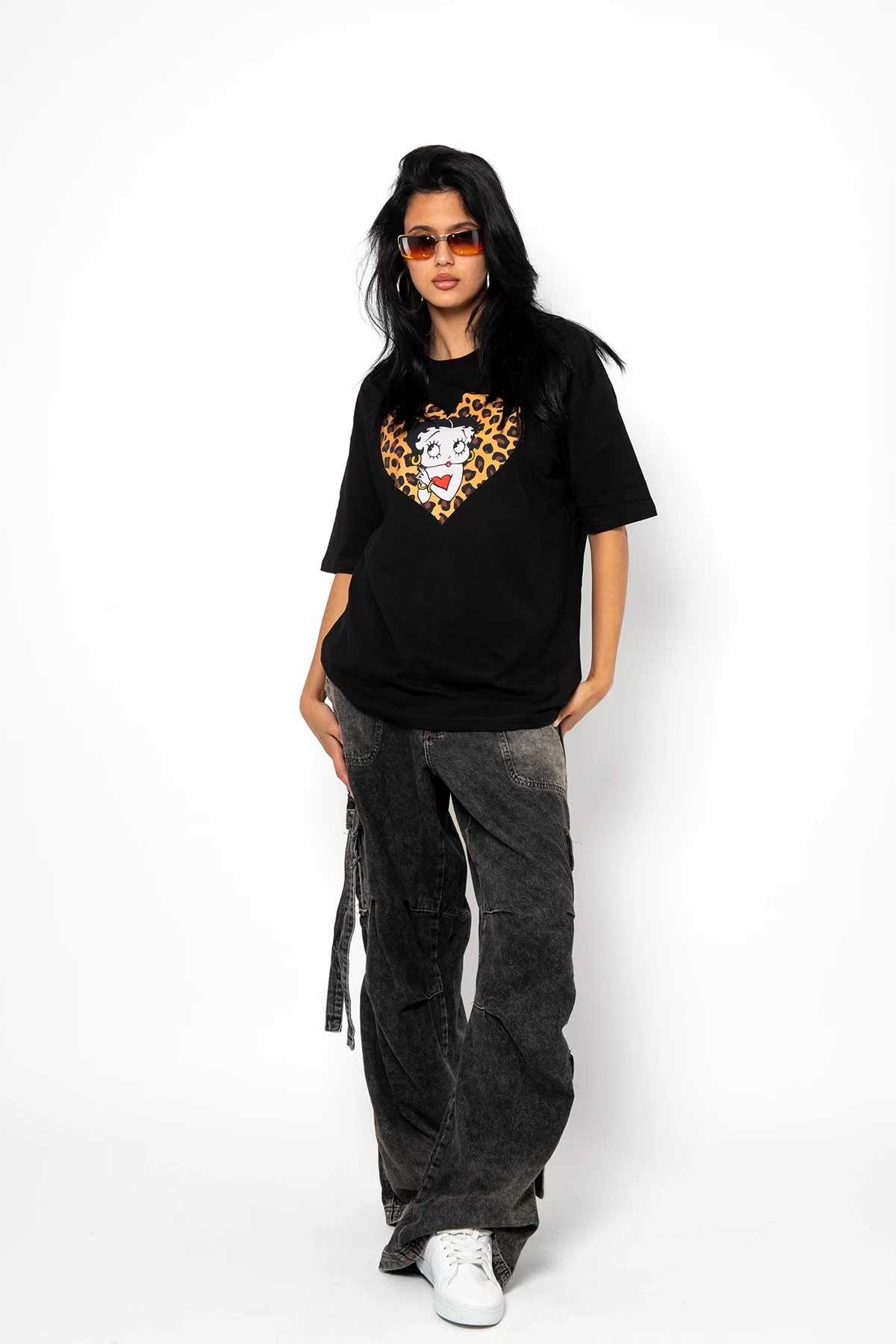 B. BOOPS LEOPAR BASKILI OVERSİZE UNİSEX PREMİUM SİYAH TSHİRT