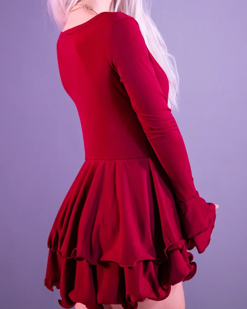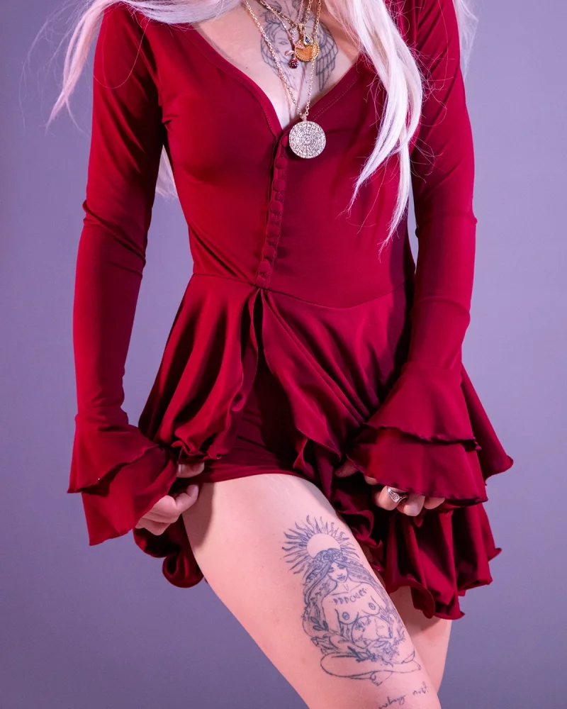 Poplin Düğmeli Pileli Mini Bordo Elbise