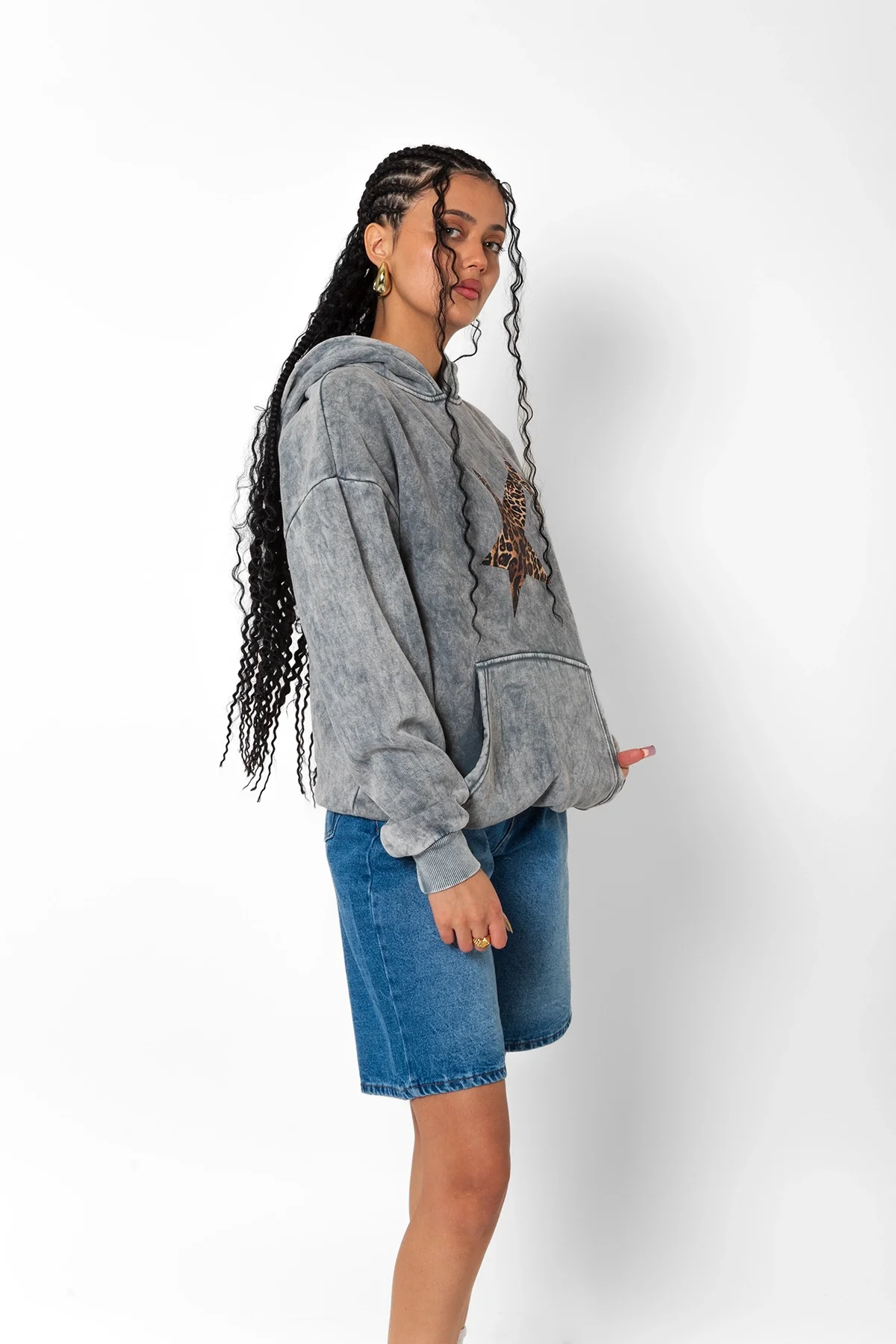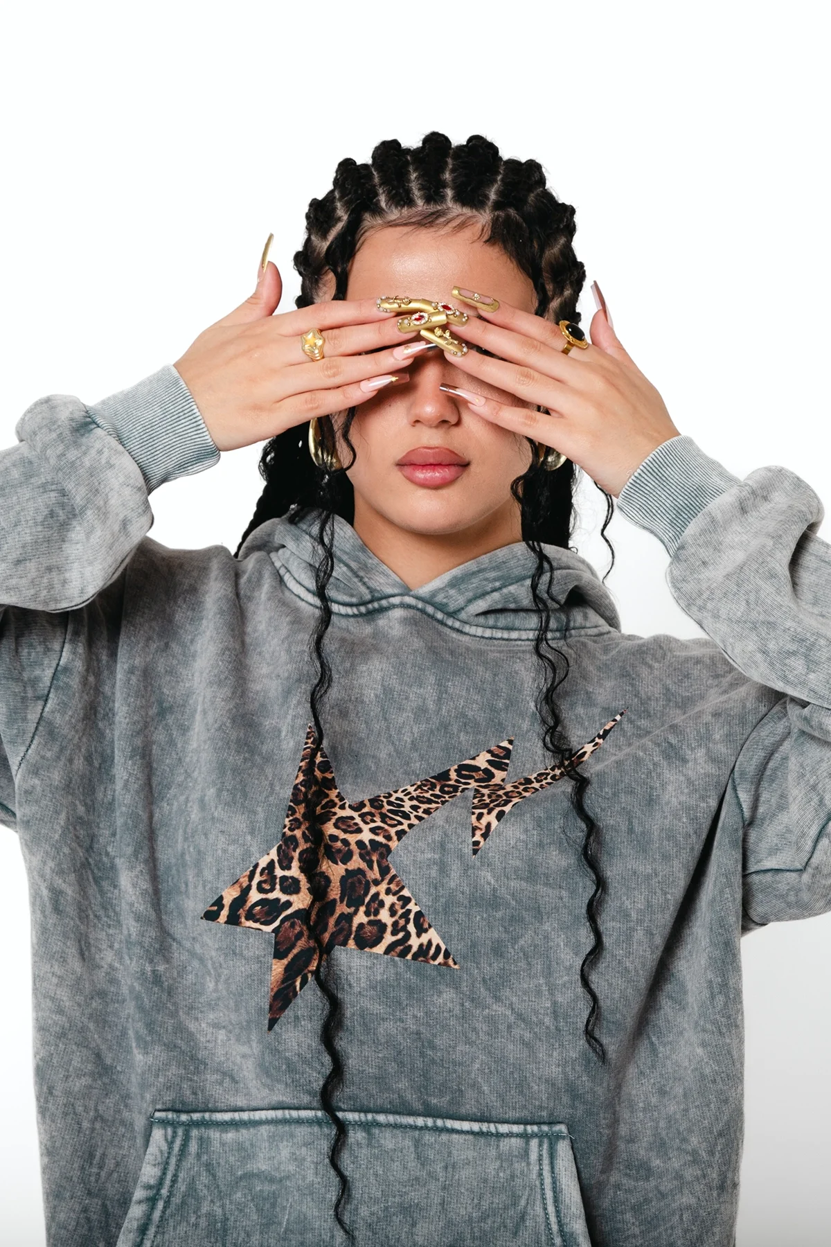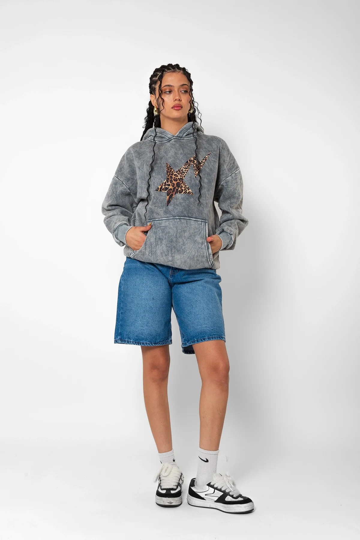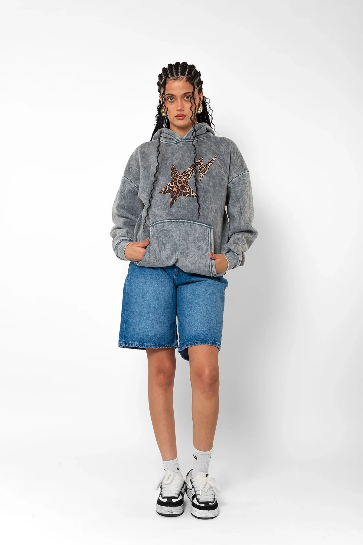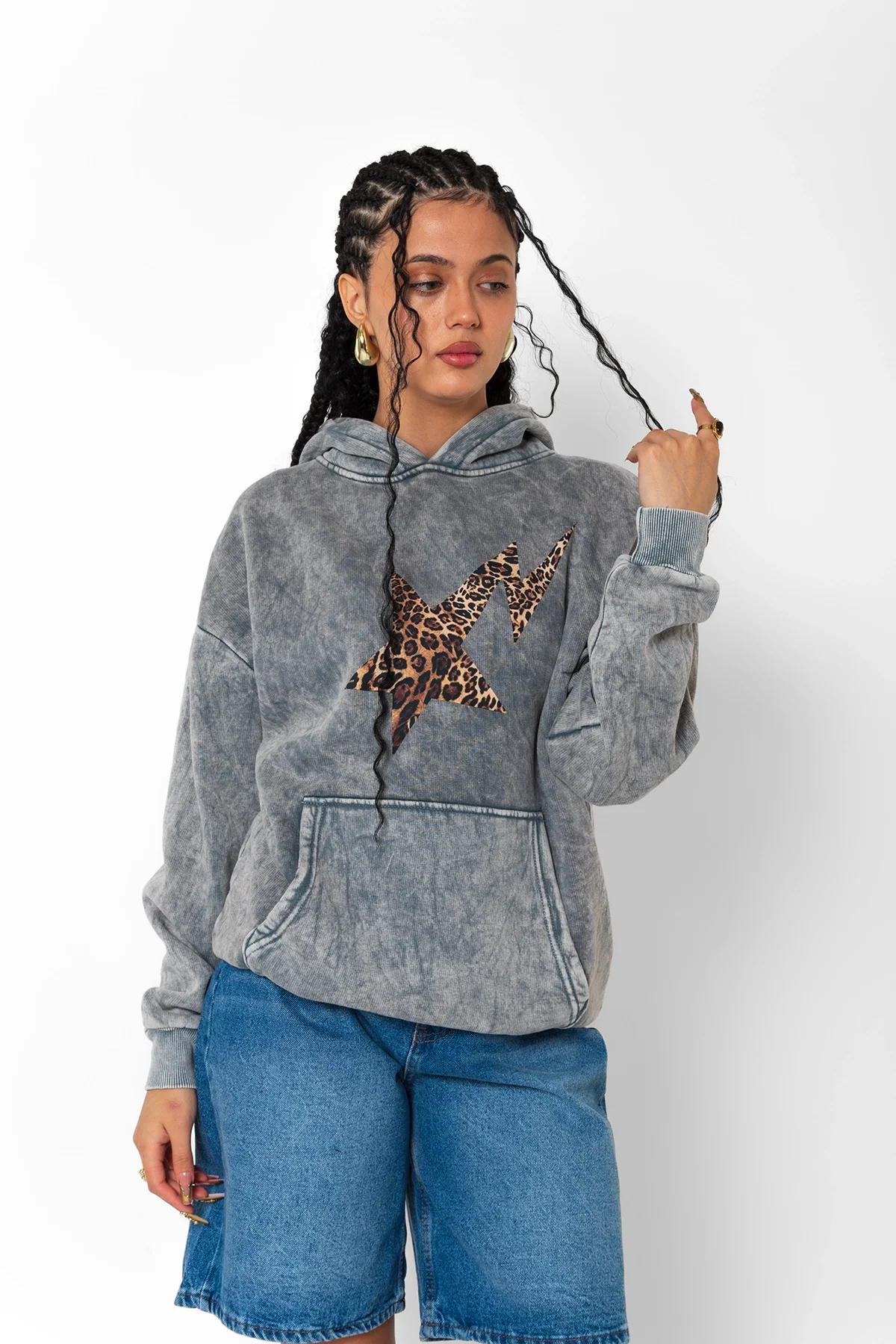 LEOPAR FALLİNG STAR BASKILI OVERSİZE UNİSEX PREMİUM YIKAMALI BEYAZ HOODİE