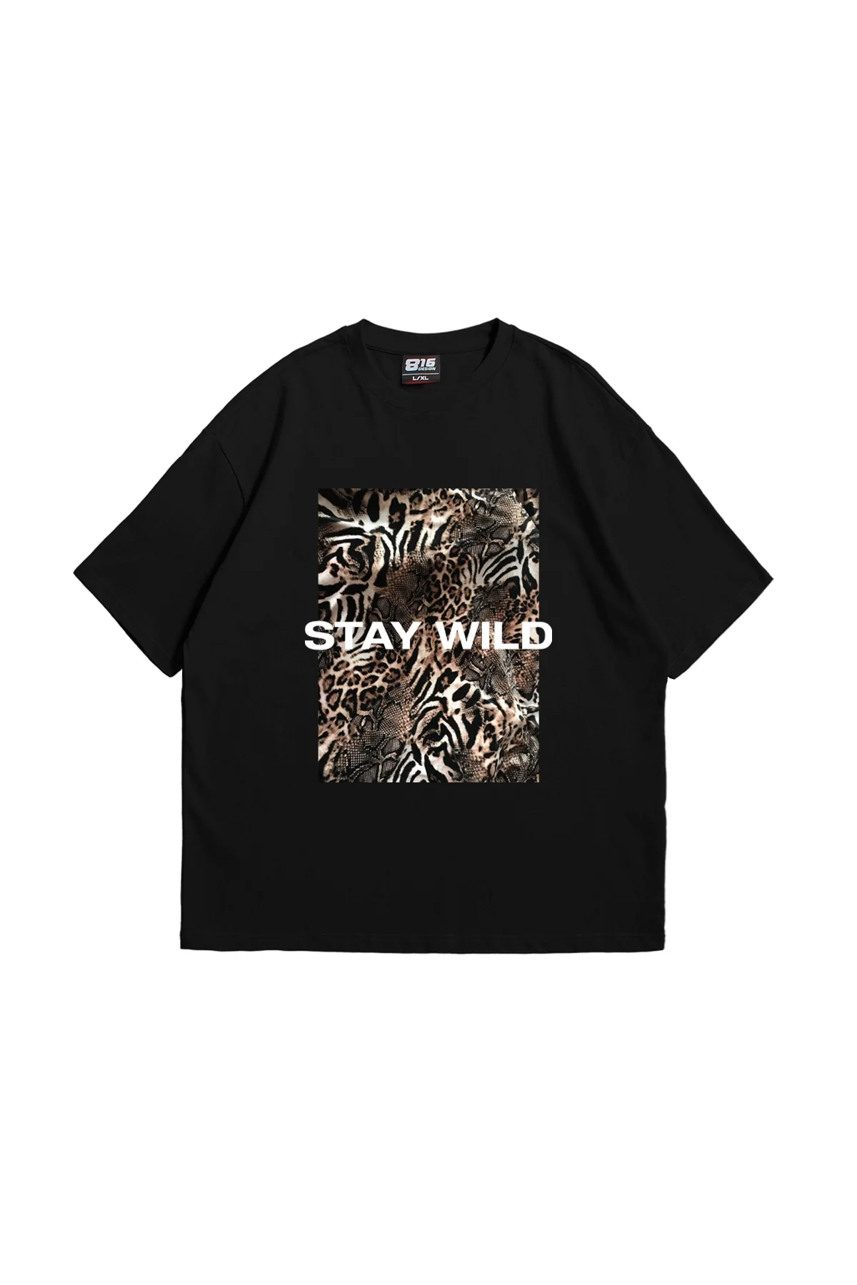 PANO BASKI STAY WİLD LEOPAR BASKILI 24/1 OVERSİZE UNİSEX SİYAH TSHİRT