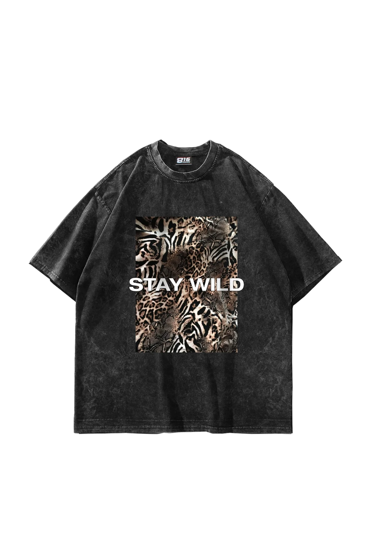 PANO BASKI STAY WİLD LEOPAR BASKILI 24/1 OVERSİZE UNİSEX YIKAMALI SİYAH TSHİRT