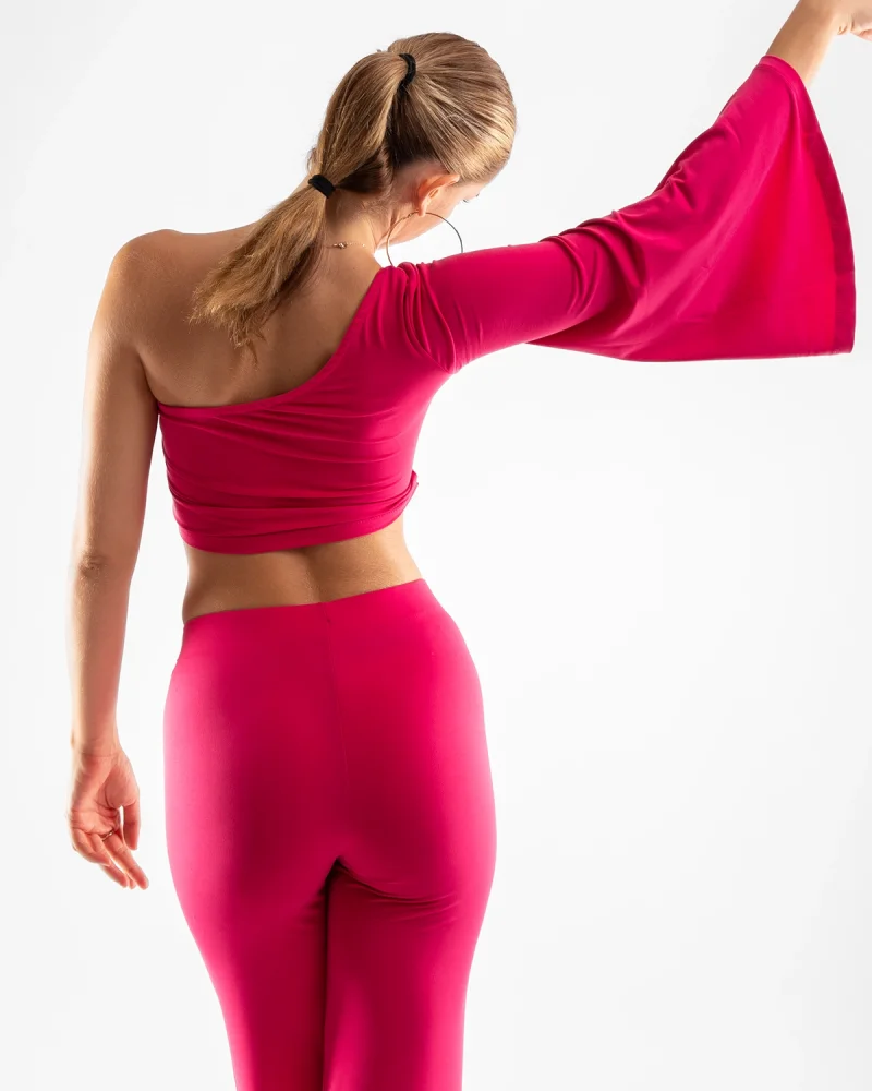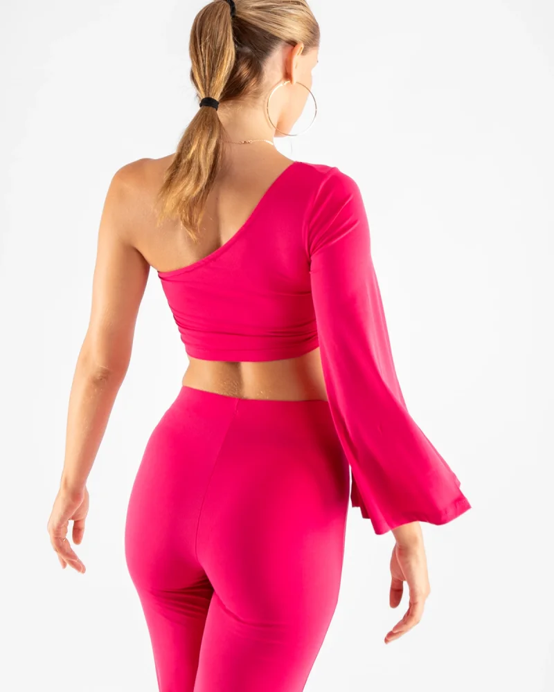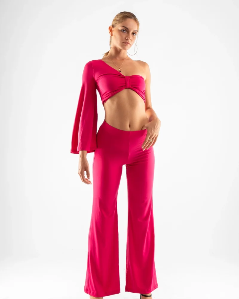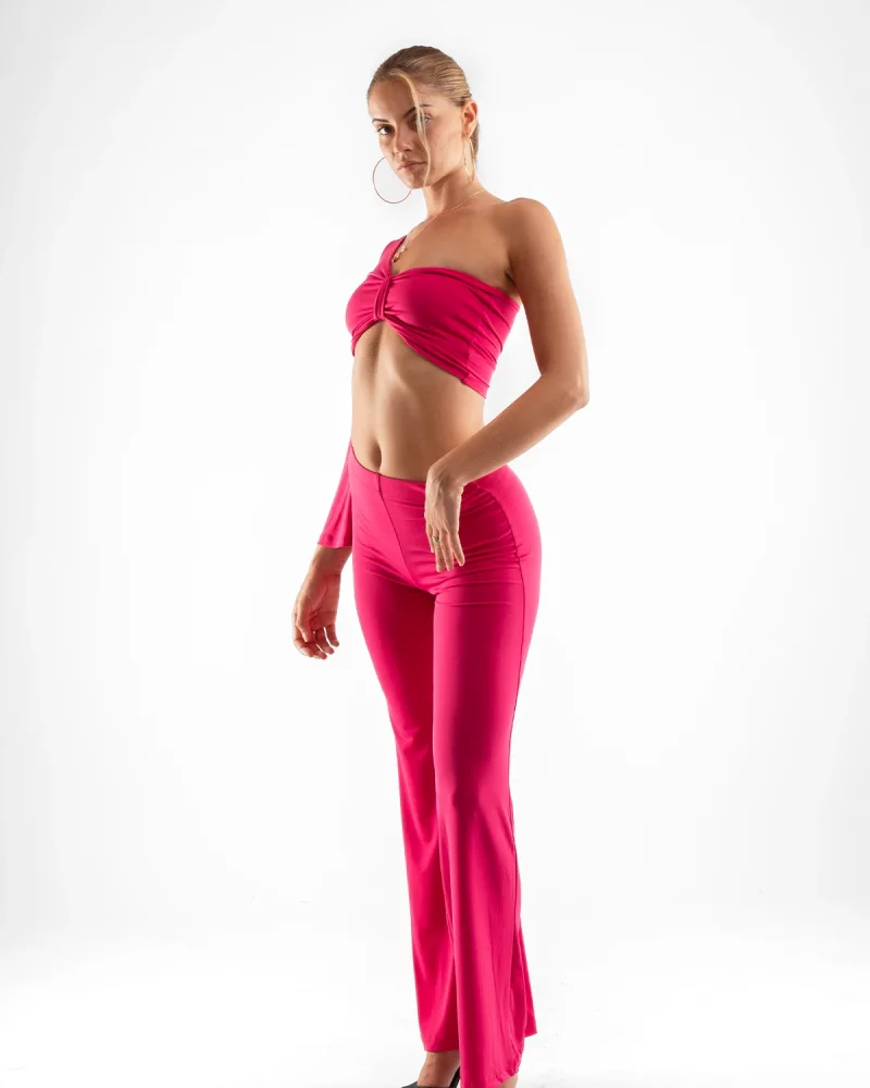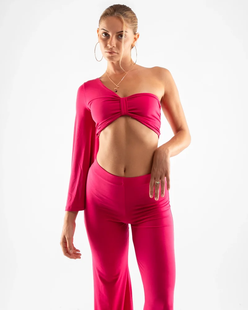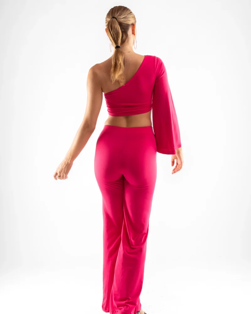Tek Kollu Omuz Detaylı İspanyol Paça Fuşya Takım