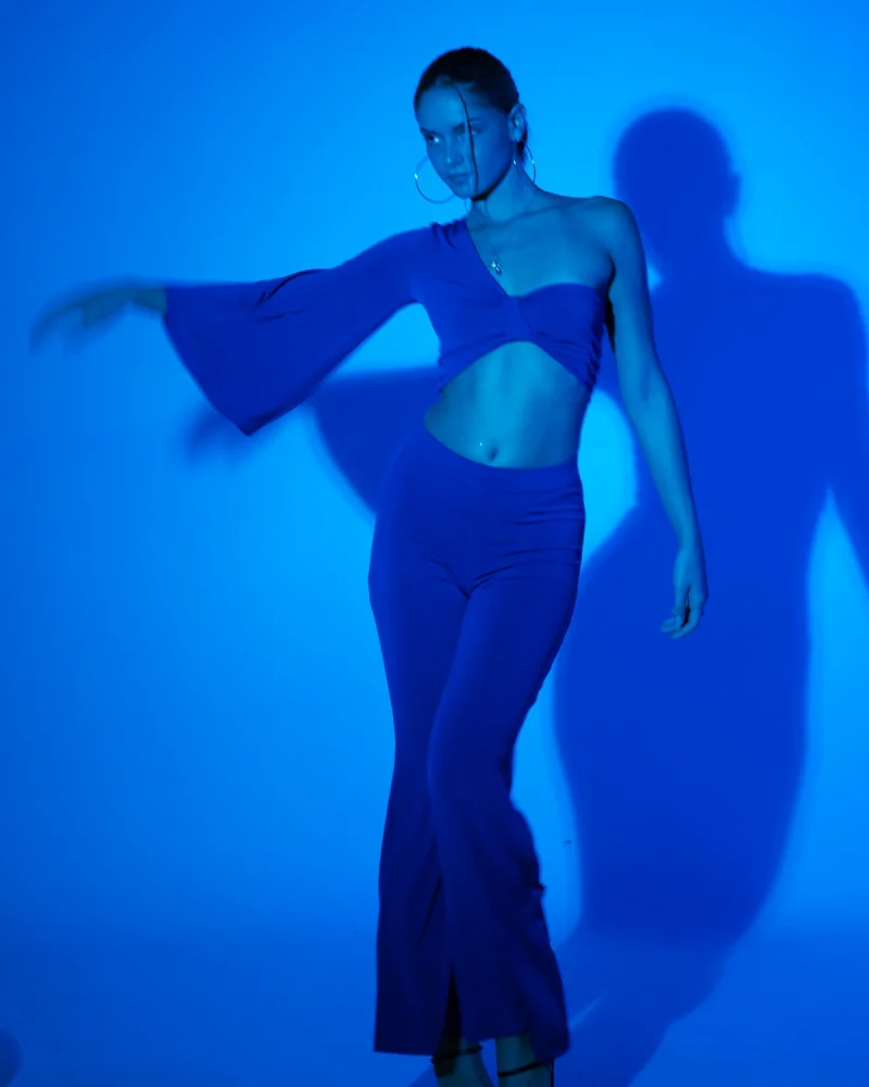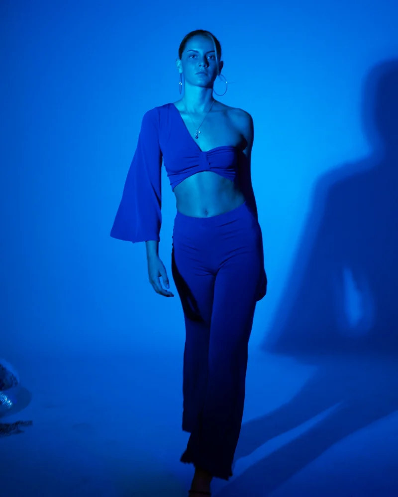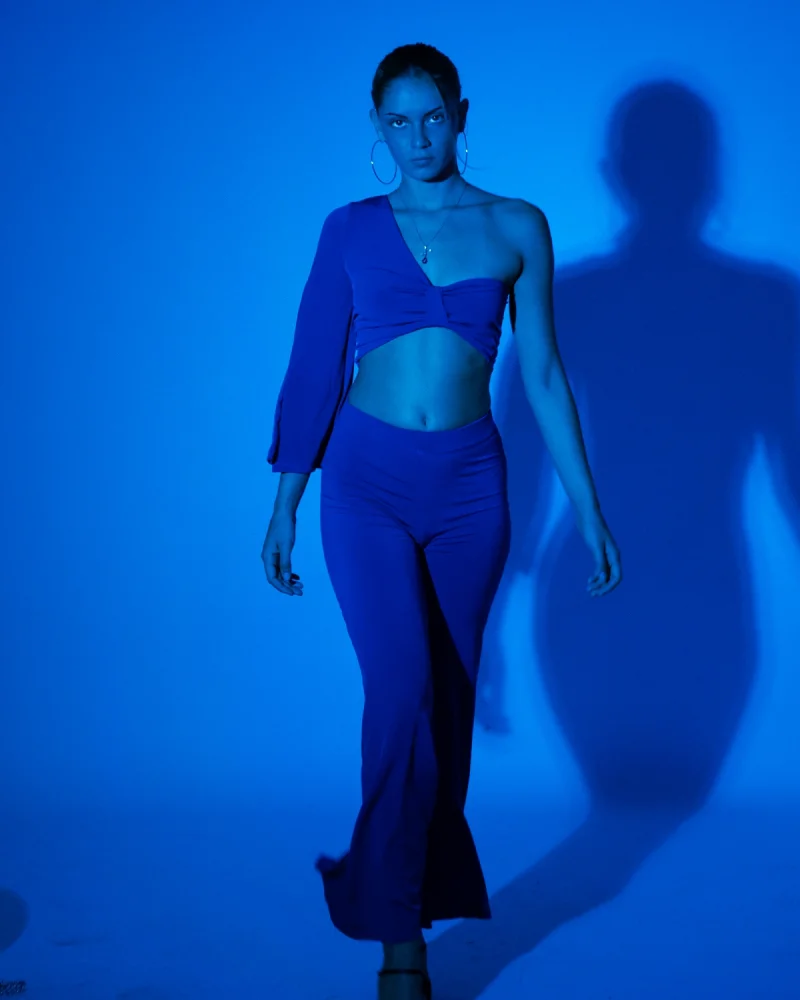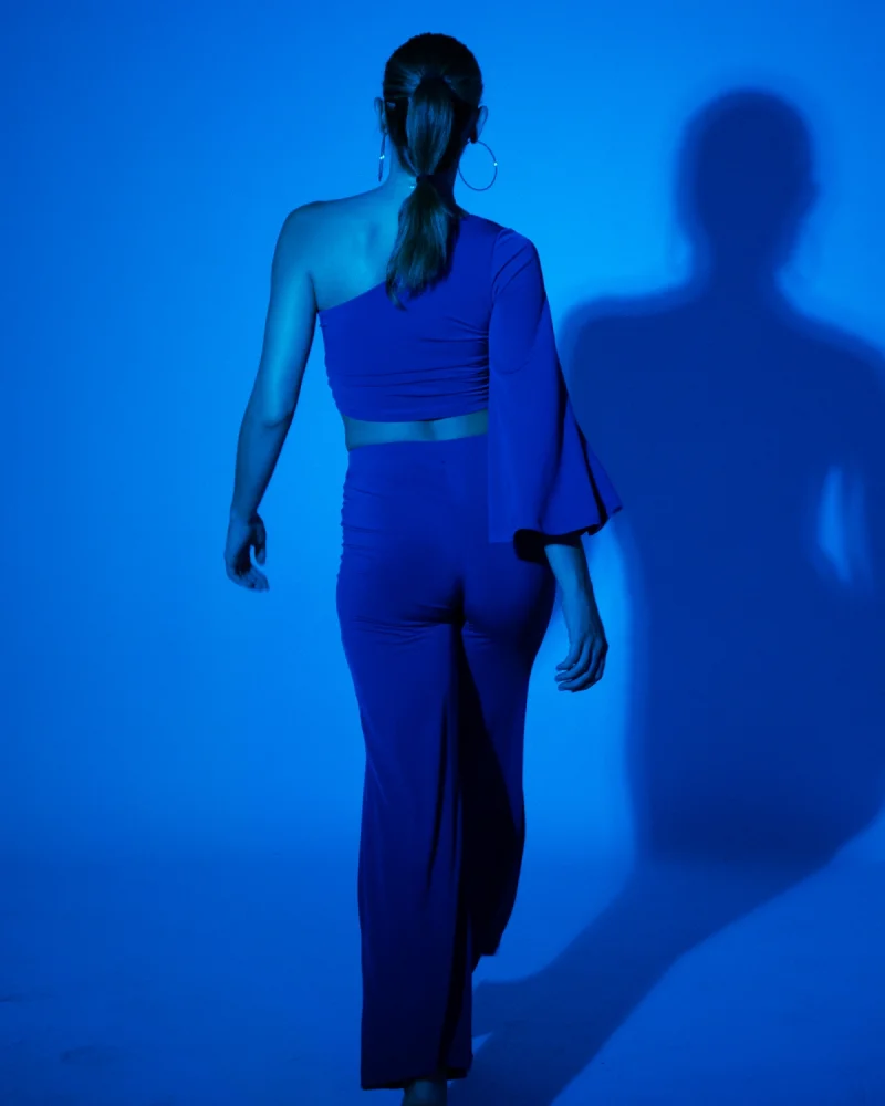 Tek Kollu Omuz Detaylı İspanyol Paça Lacivert Takım