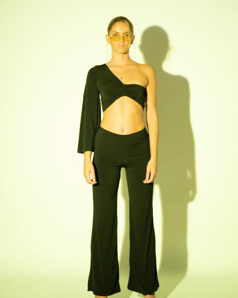 Tek Kollu Omuz Detaylı İspanyol Paça Siyah Takım