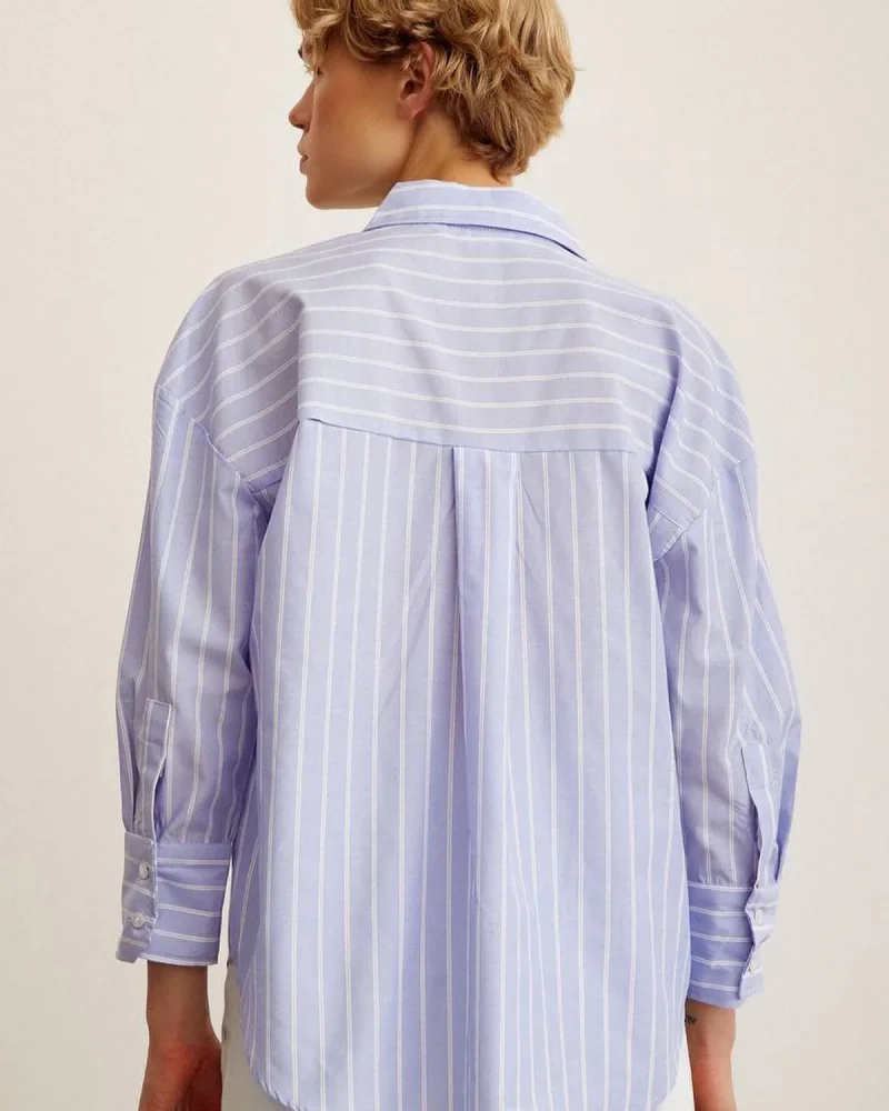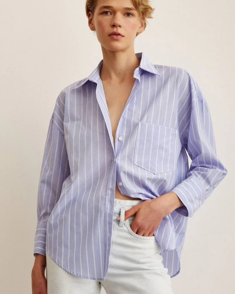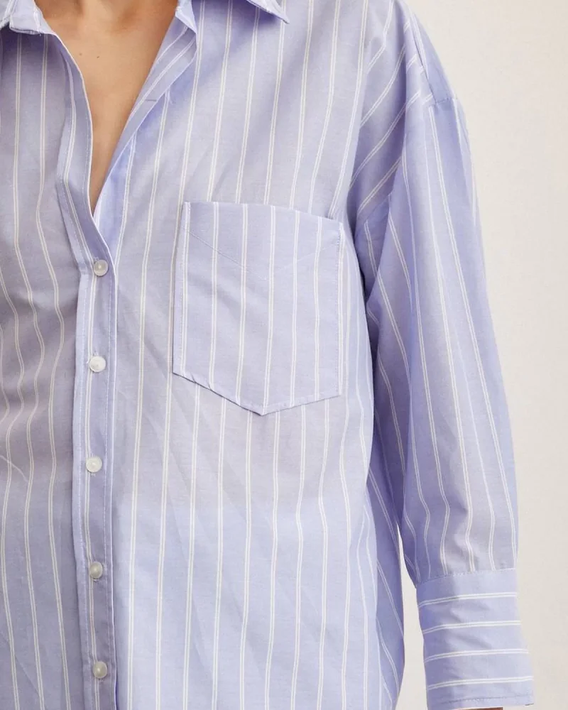Basic Çizgi Oversize Kadın Mavi Gömlek