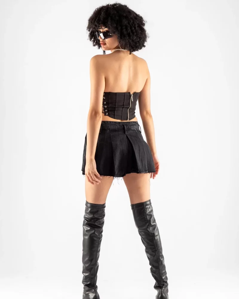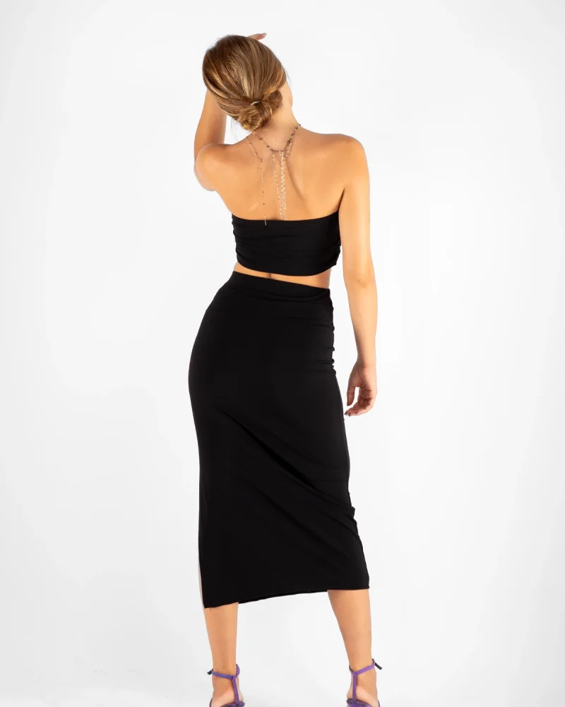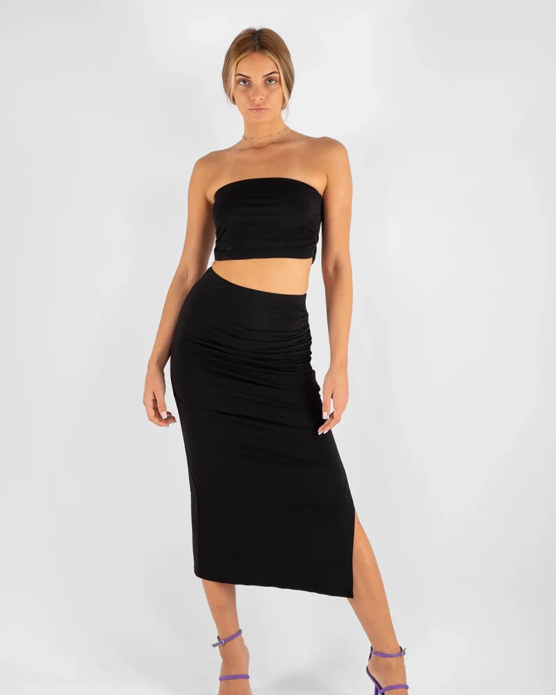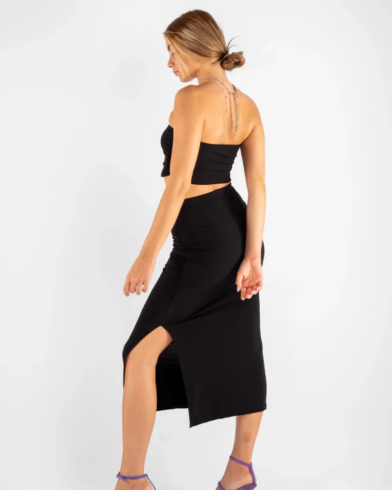 Yırtmaç Detaylı Straplez Etek Siyah Takım