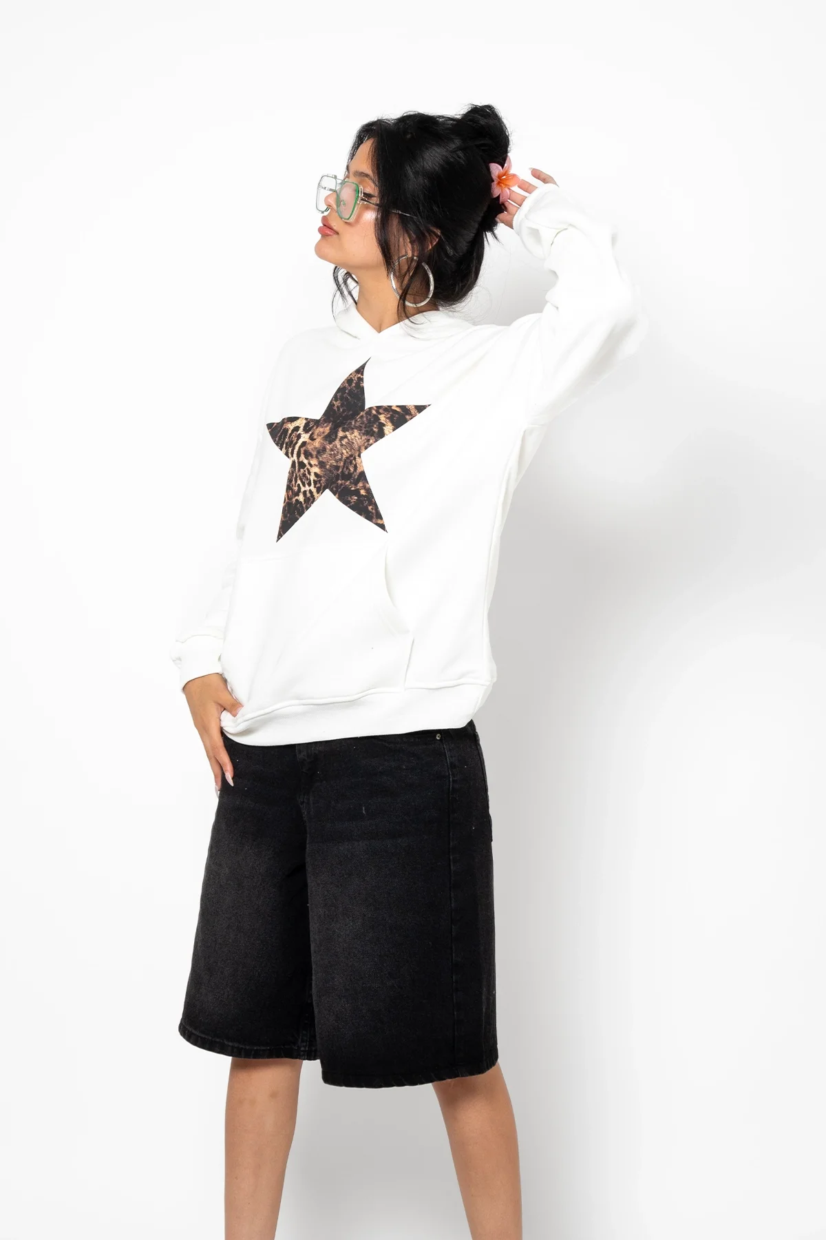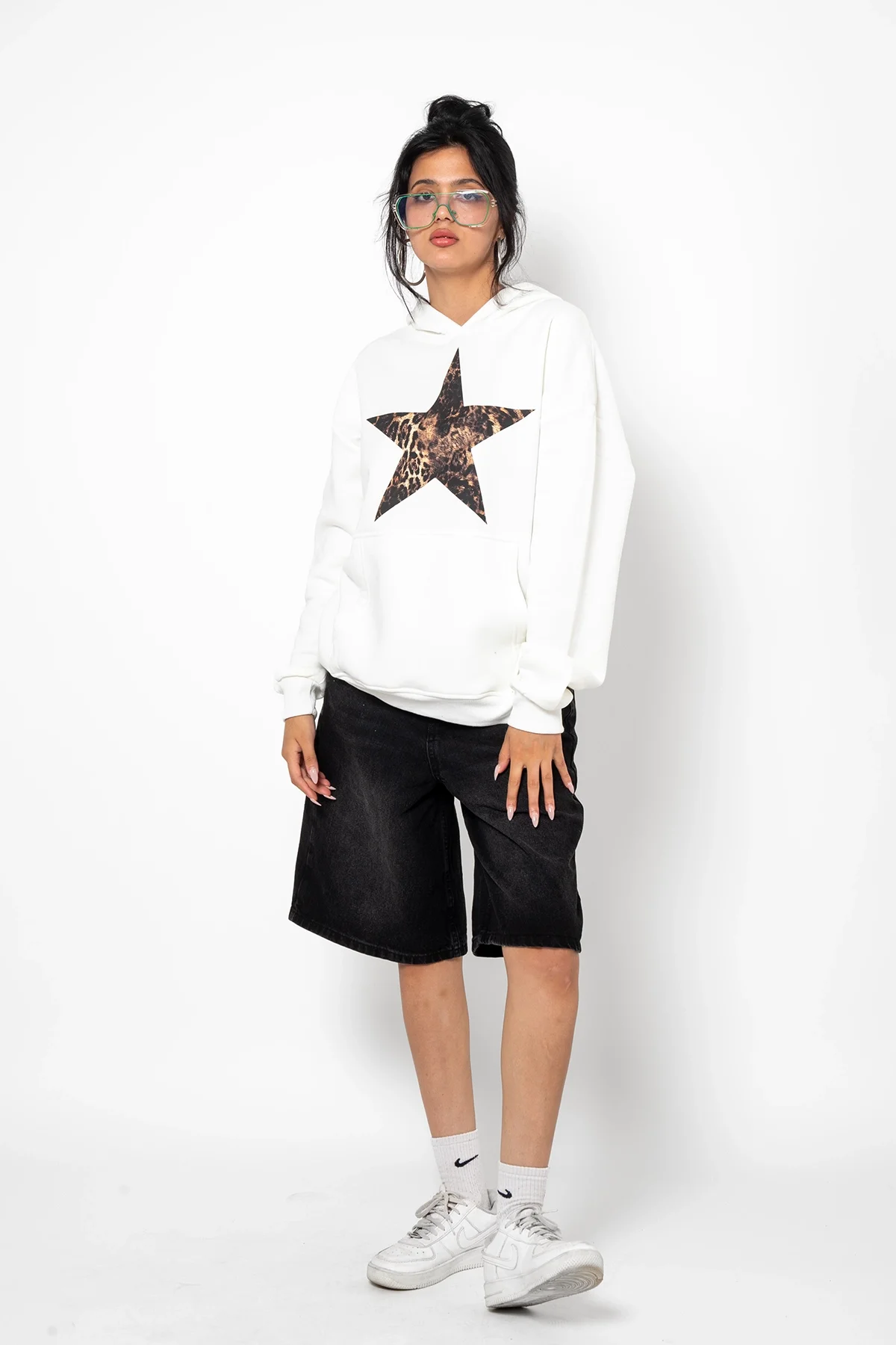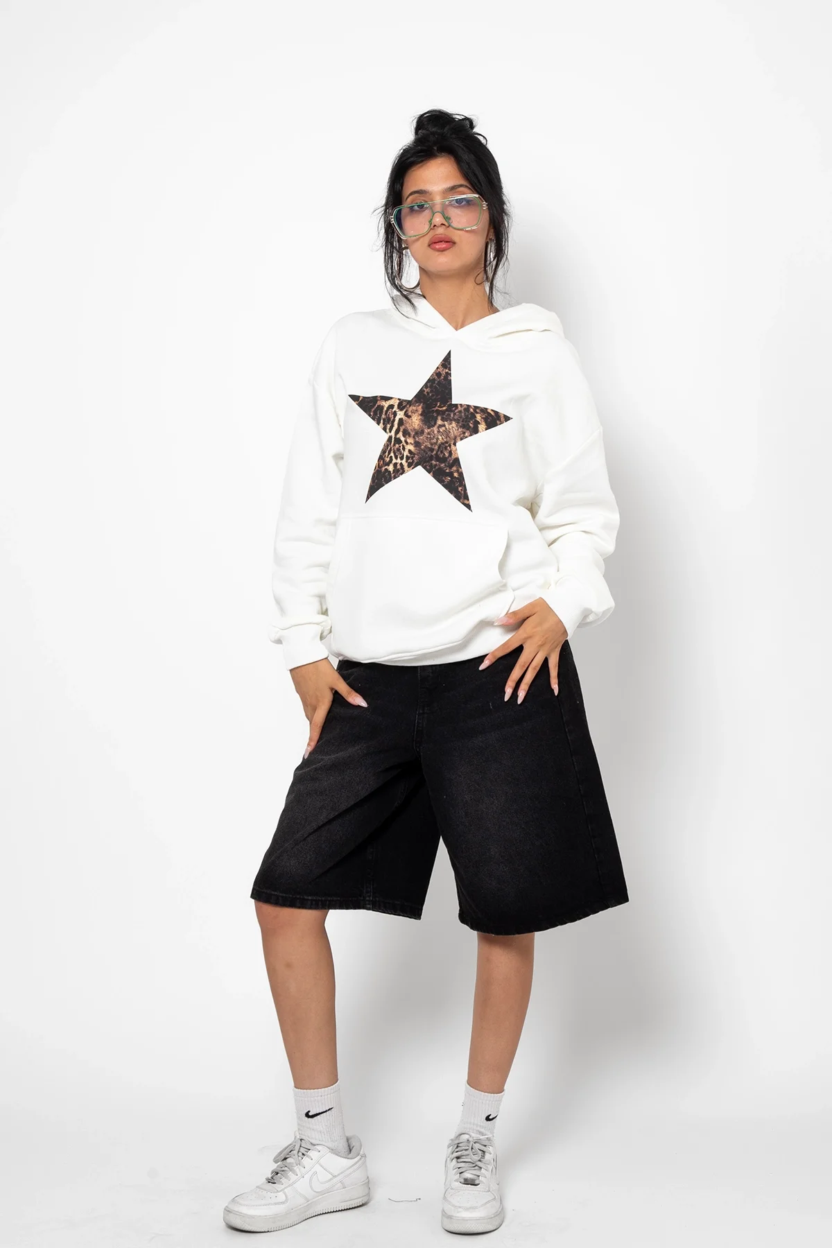 LEOPAR STARZ BASKILI OVERSİZE UNİSEX PREMİUM BEYAZ HOODİE