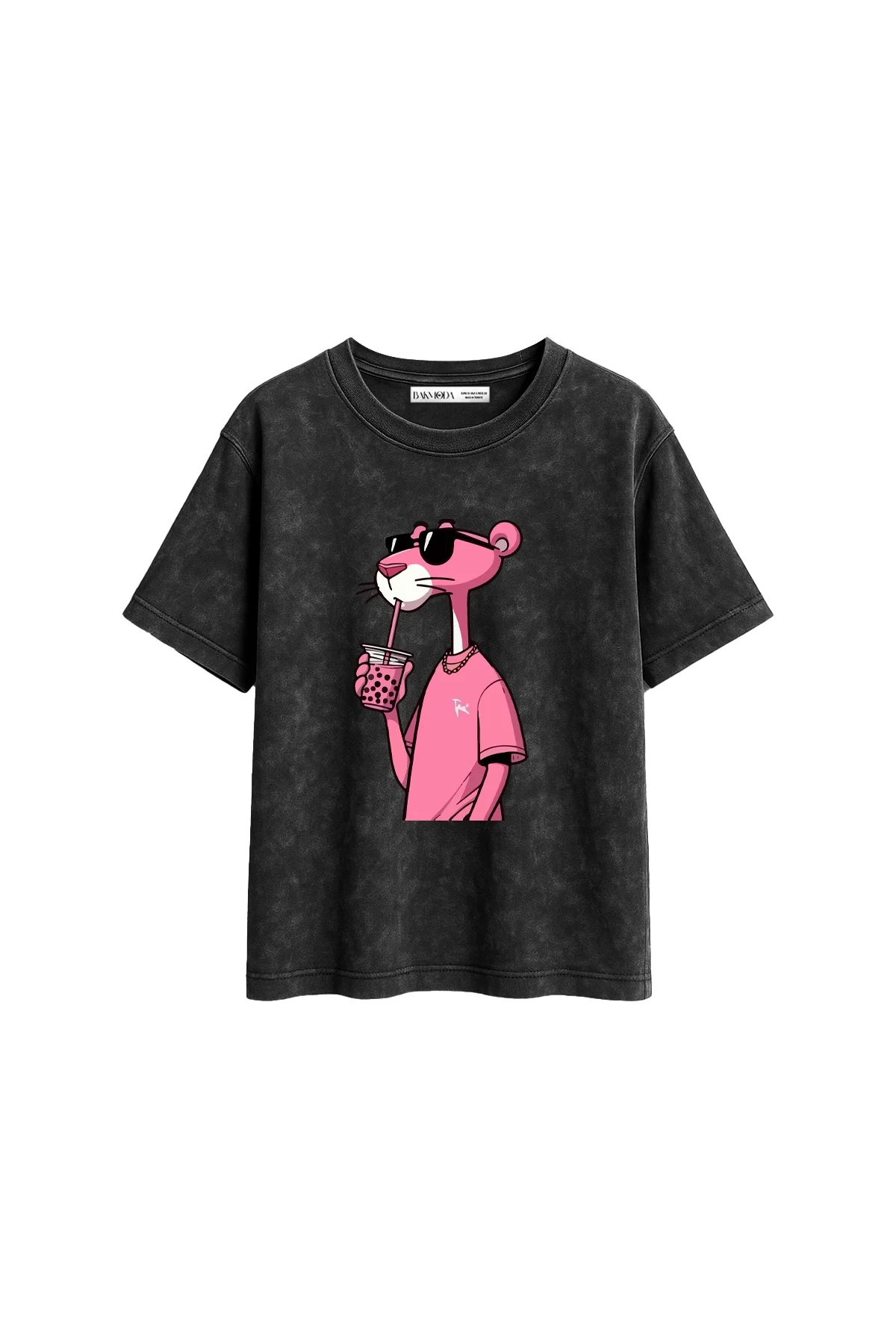 Pink Panther V2 Baskılı Relaxed Fit Yıkamalı Siyah Kadın Tshirt, Bak Moda'nın kendine özgü tasarımı ile stilinizi tamamlayacak mükemmel bir seçenektir.