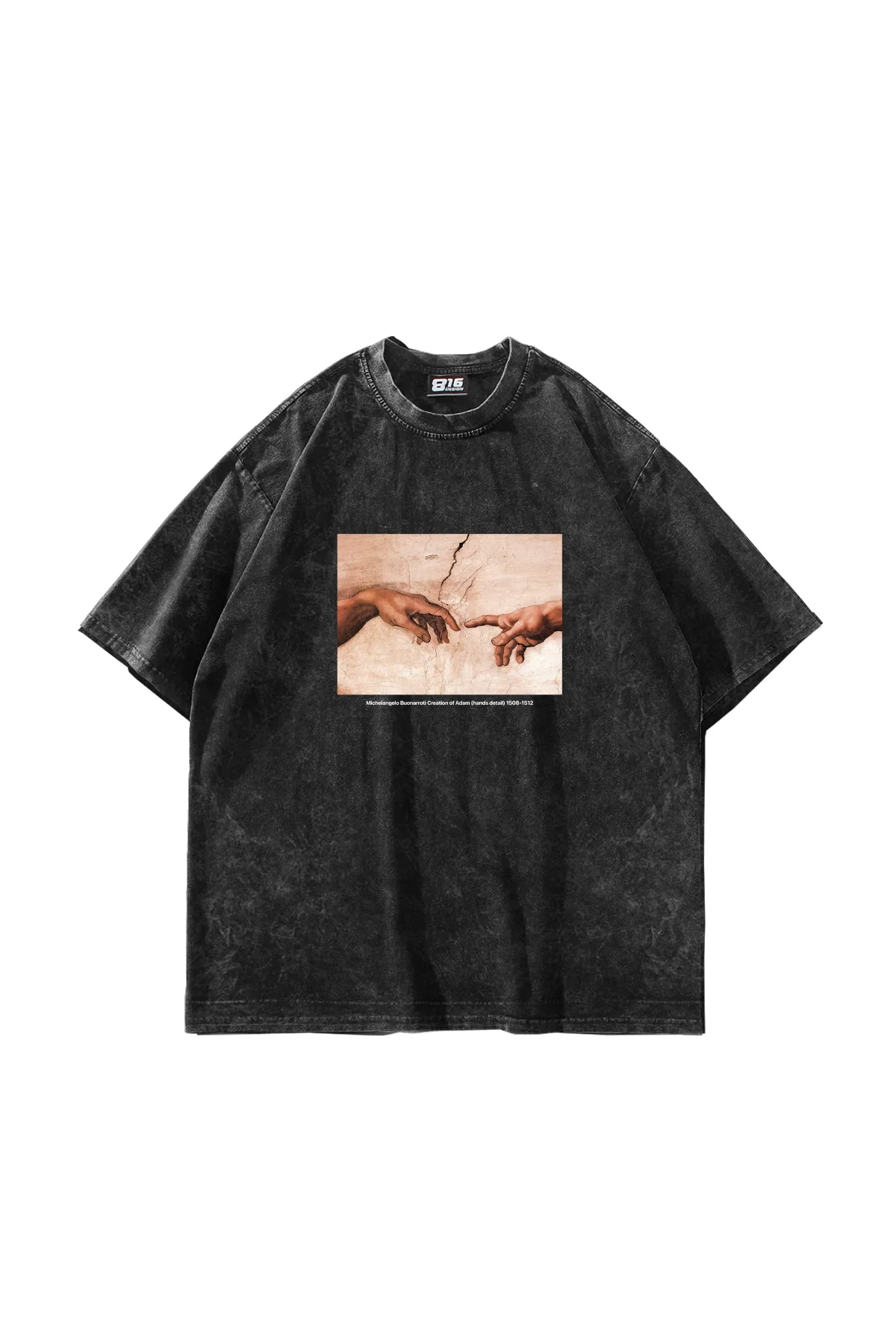 Bak Moda'nın özel koleksiyonundan, rahatlığı ve şıklığı bir arada sunan Creation of Adam baskılı oversize unisex yıkanmış siyah tshirt ile tarzınızı konuşturun!