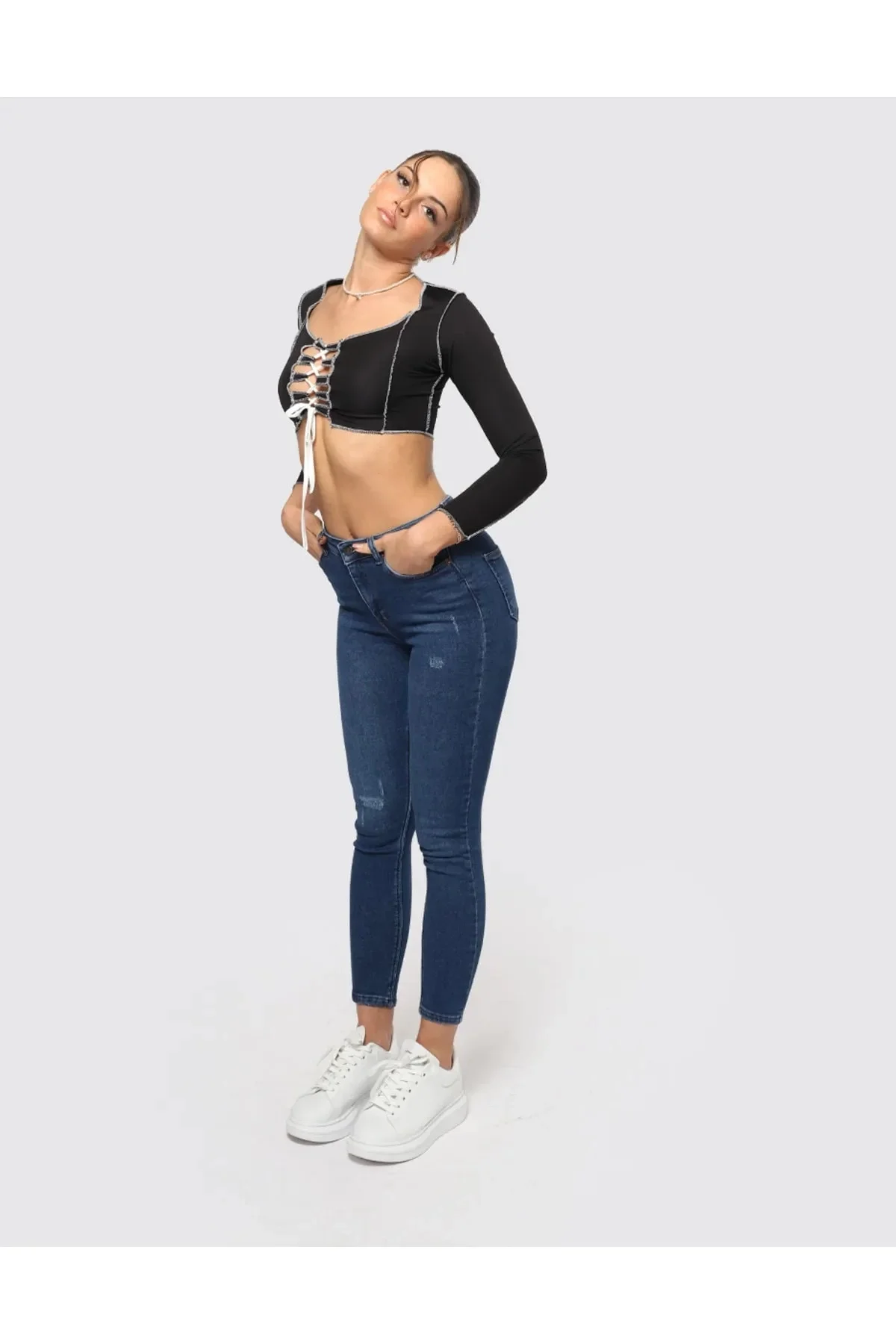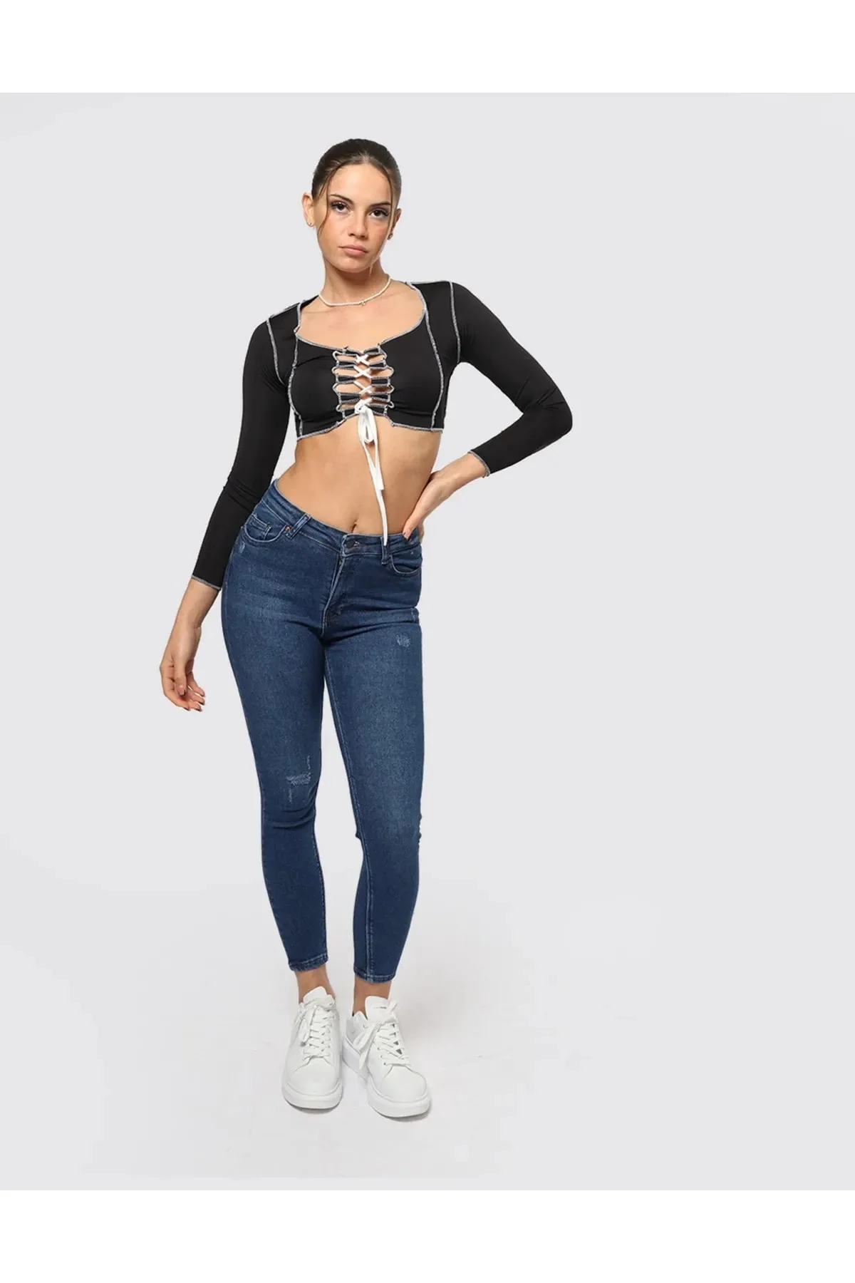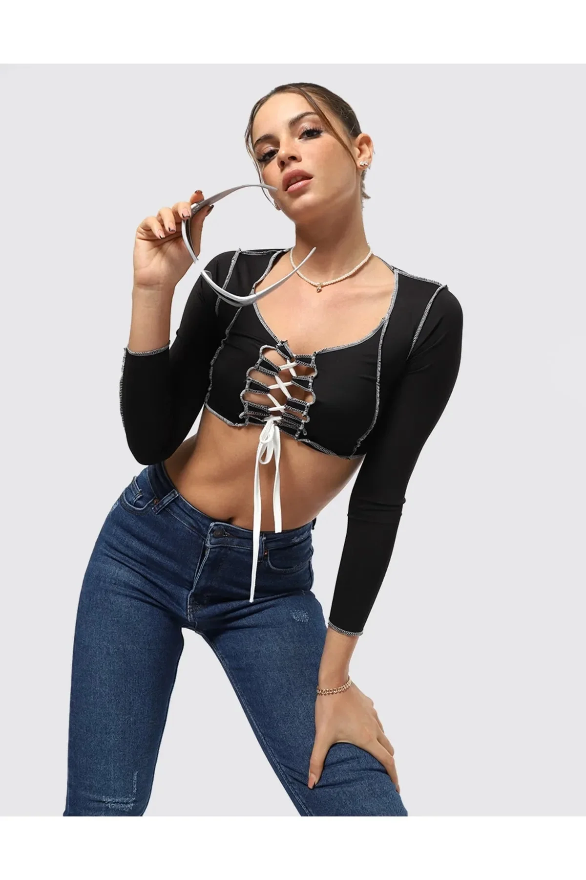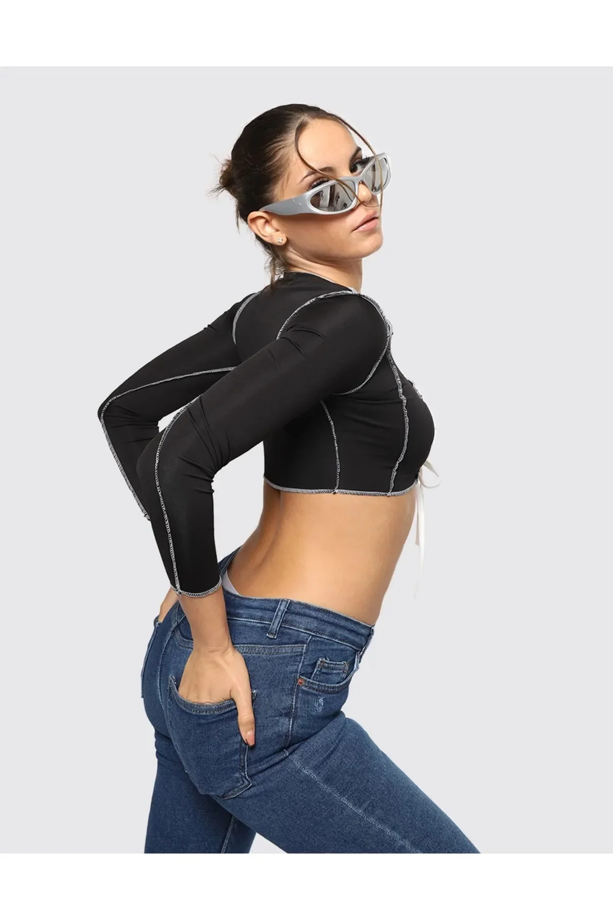 GÖĞÜS DEKOLTELİ TERS DİKİŞ SİYAH CROP