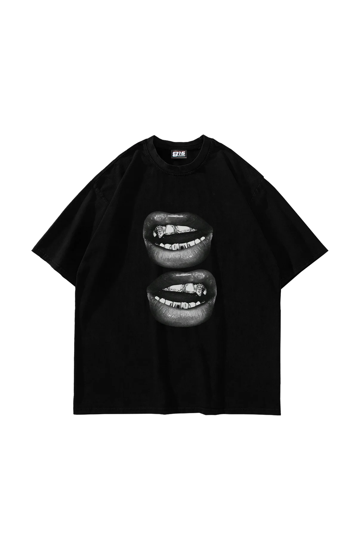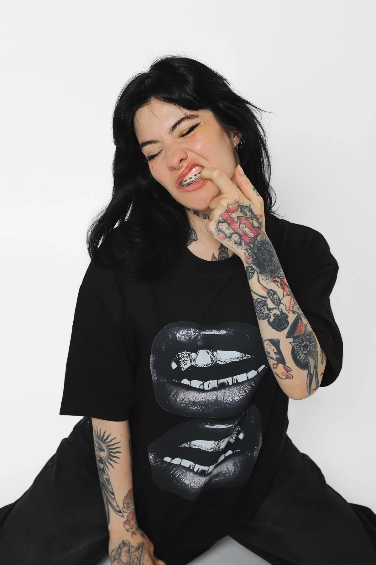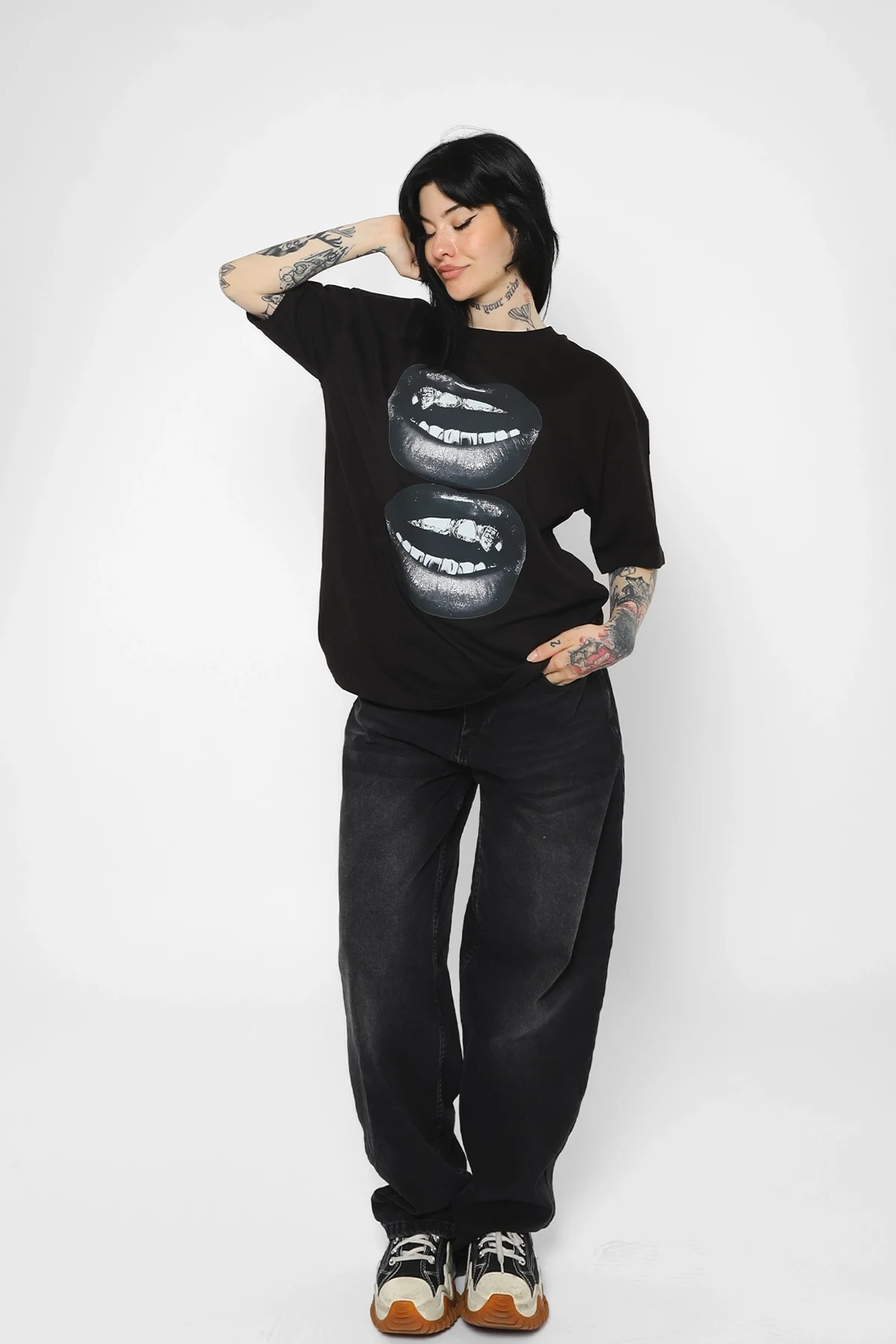 Lip Teeths Baskılı Oversize Unisex Siyah Tshirt, tarzınızı yansıtmak isteyenler için ideal bir seçenektir.