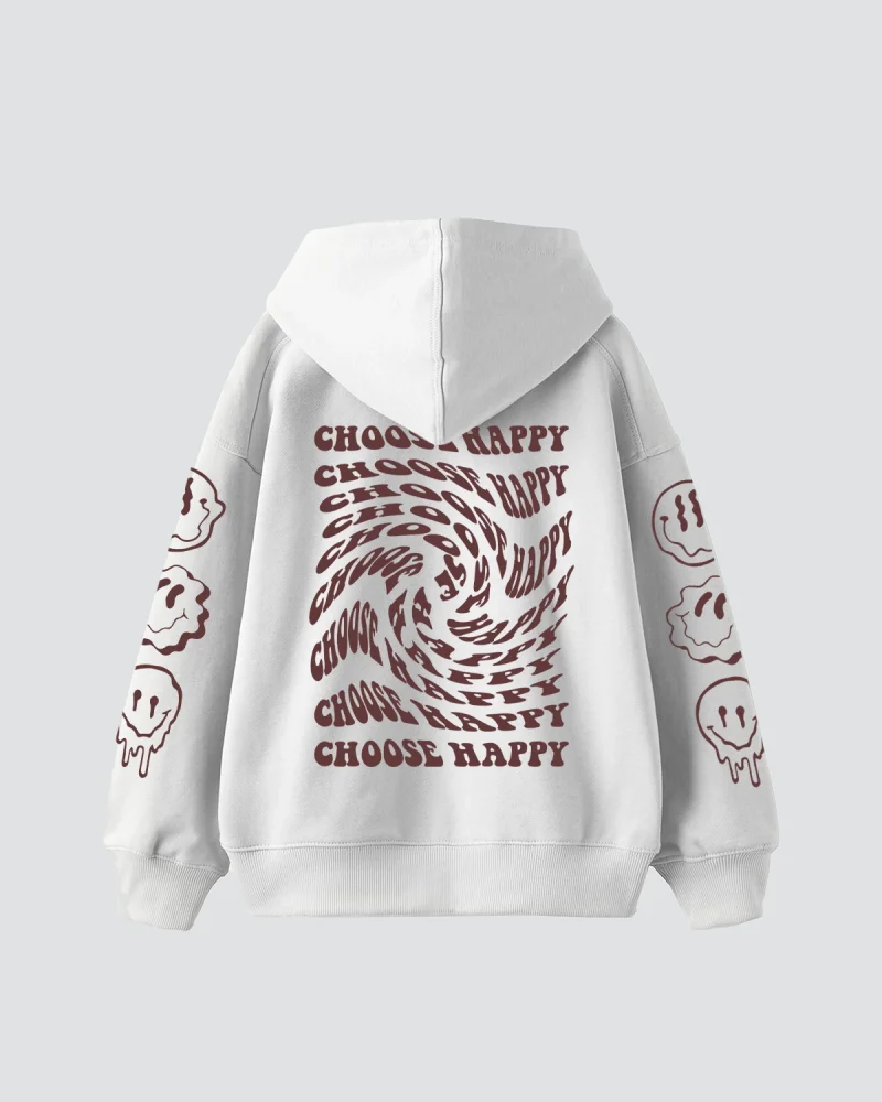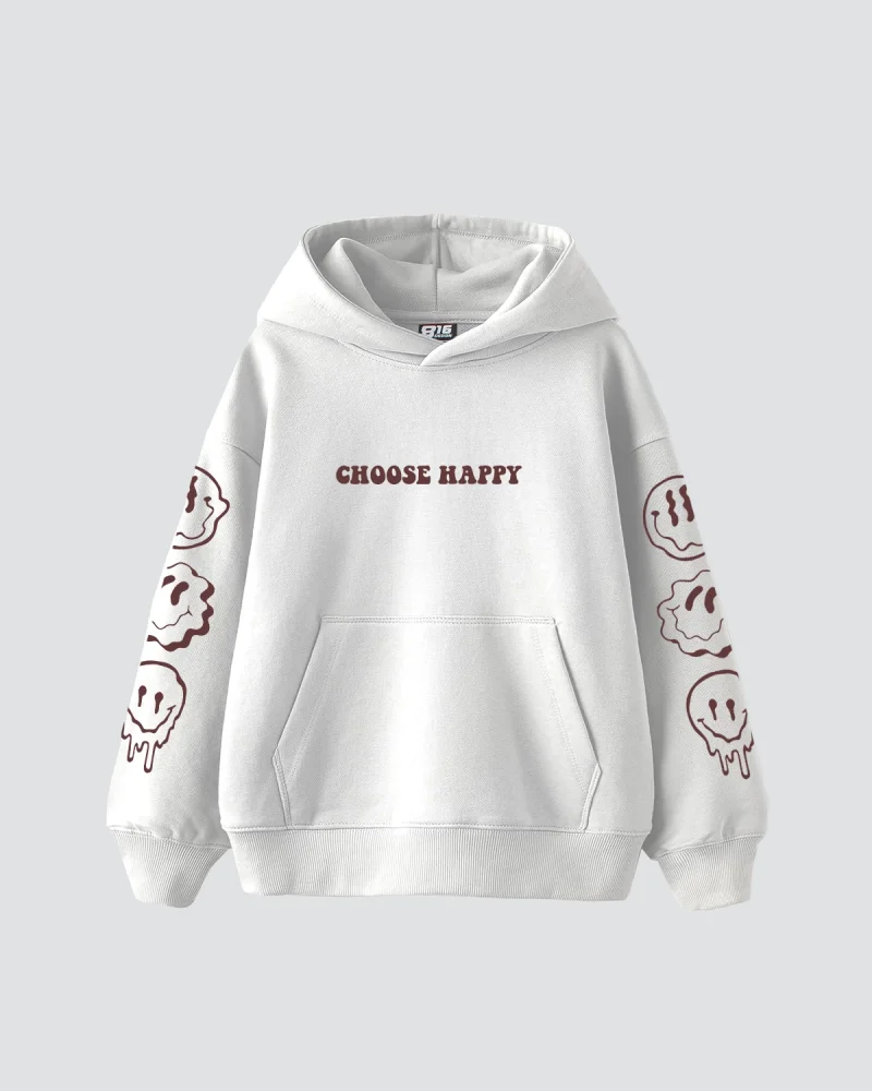 Choose Happy Baskılı Oversize Unisex Beyaz Hoodie