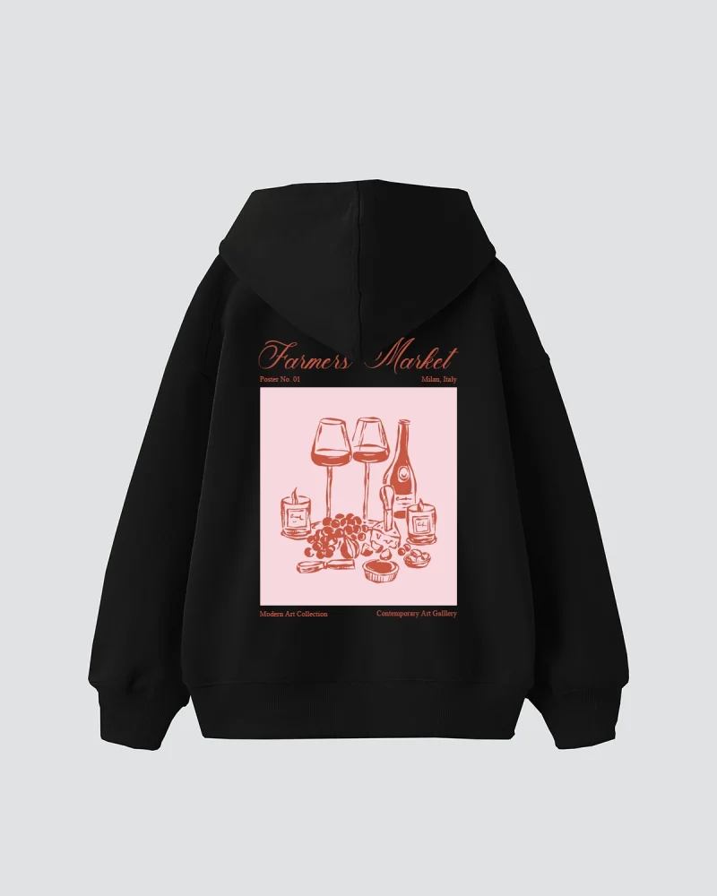 Farmers Market Baskılı Oversize Unisex Siyah Hoodie