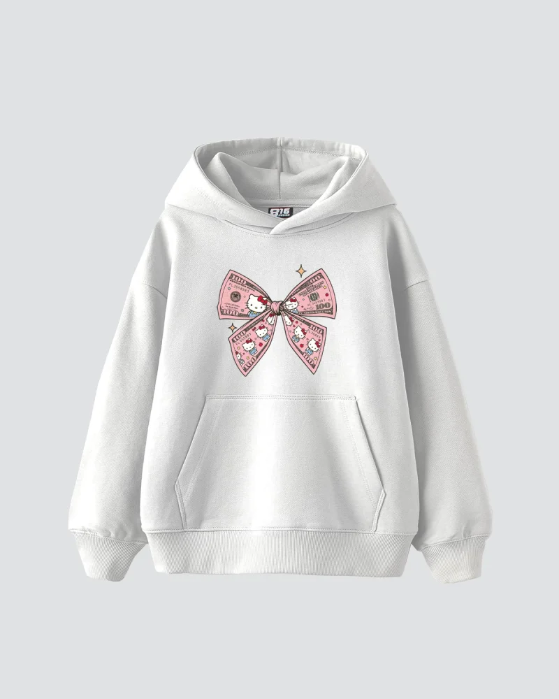 Hello Kitty Fiyonk Baskılı Oversize Unisex Beyaz Hoodie