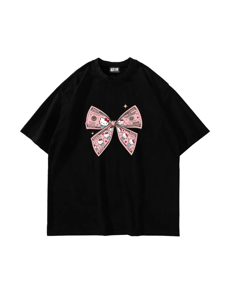 Hello Kitty Fiyonk Baskılı Oversize Unisex Siyah Tshirt