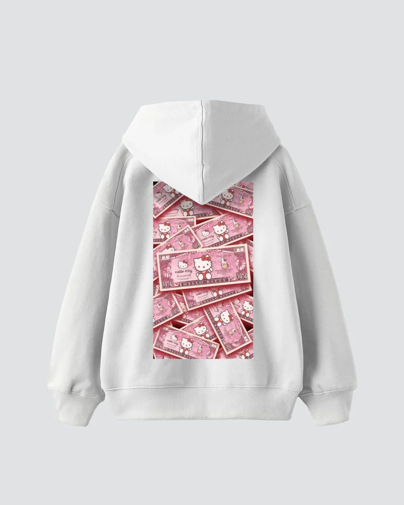 Hello Kitty Money Baskılı Oversize Unisex Beyaz Hoodie