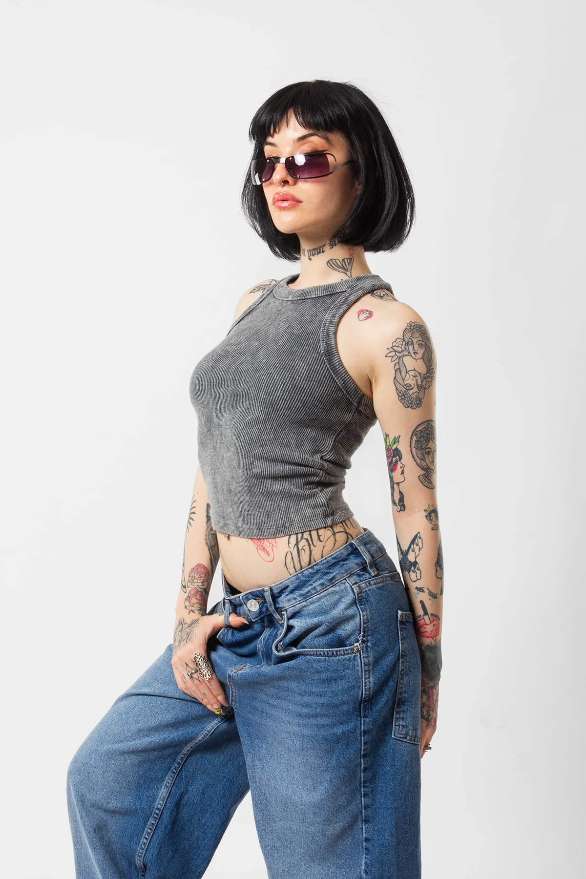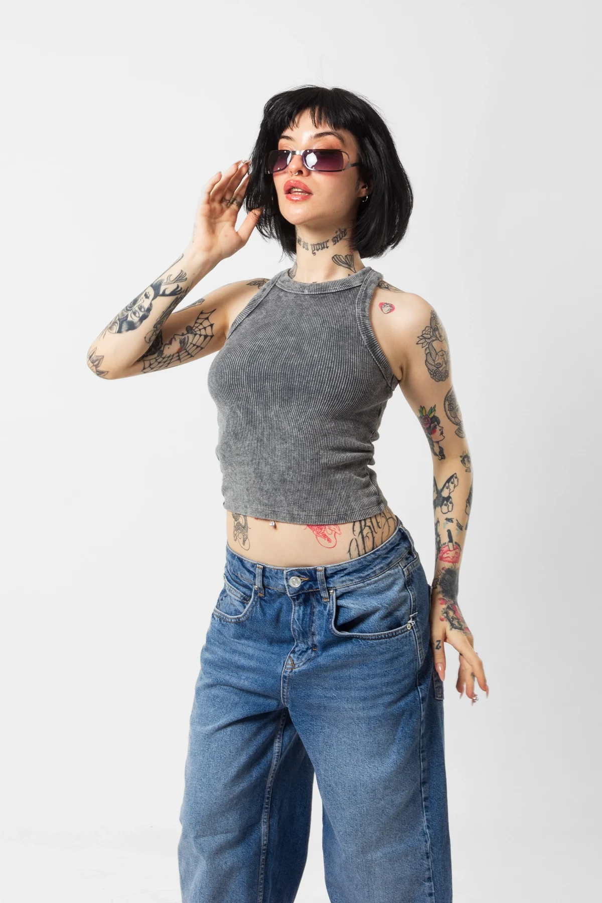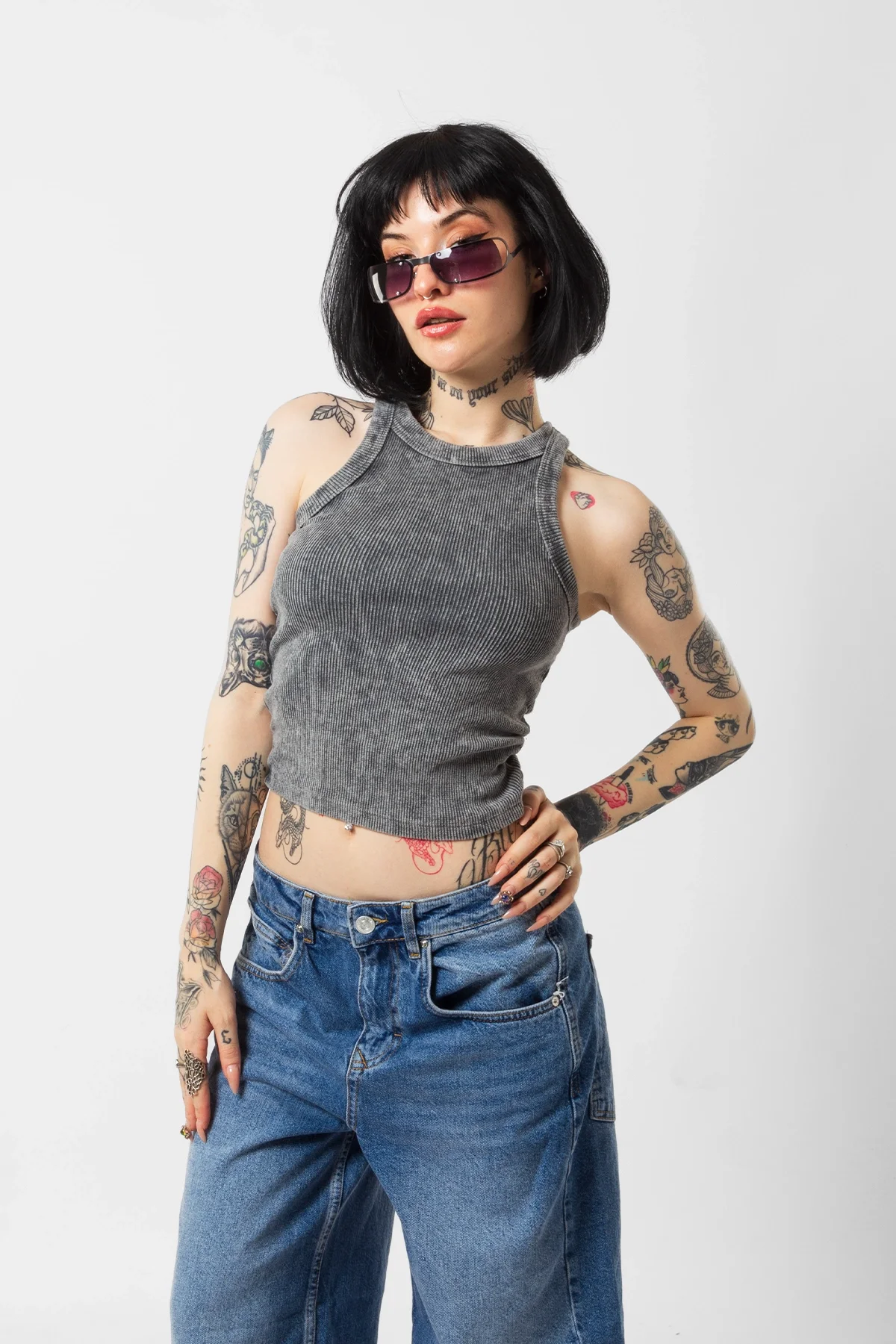 BASİC FİTİLLİ BATIK YIKAMALI FÜME SIFIR KOL CROP