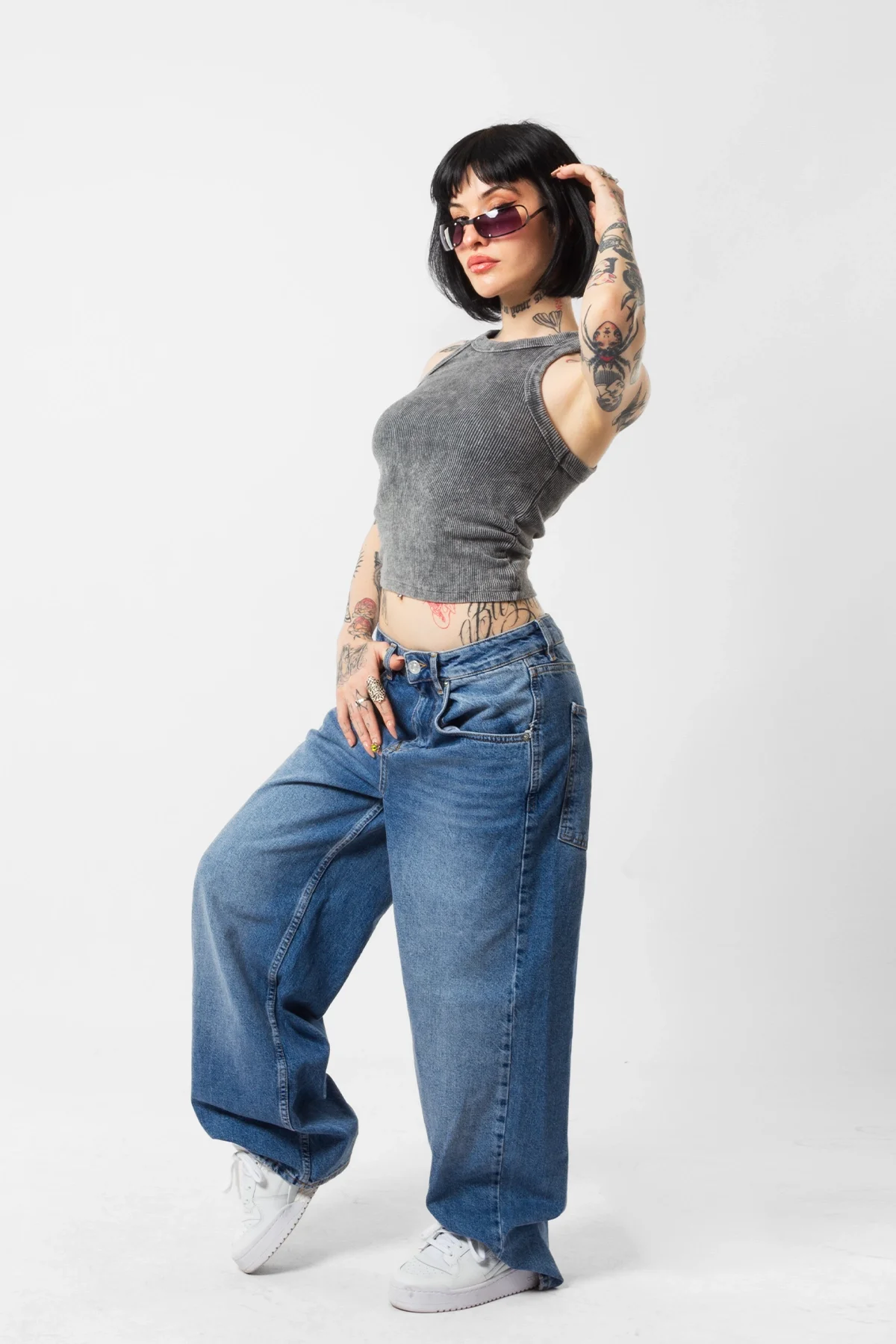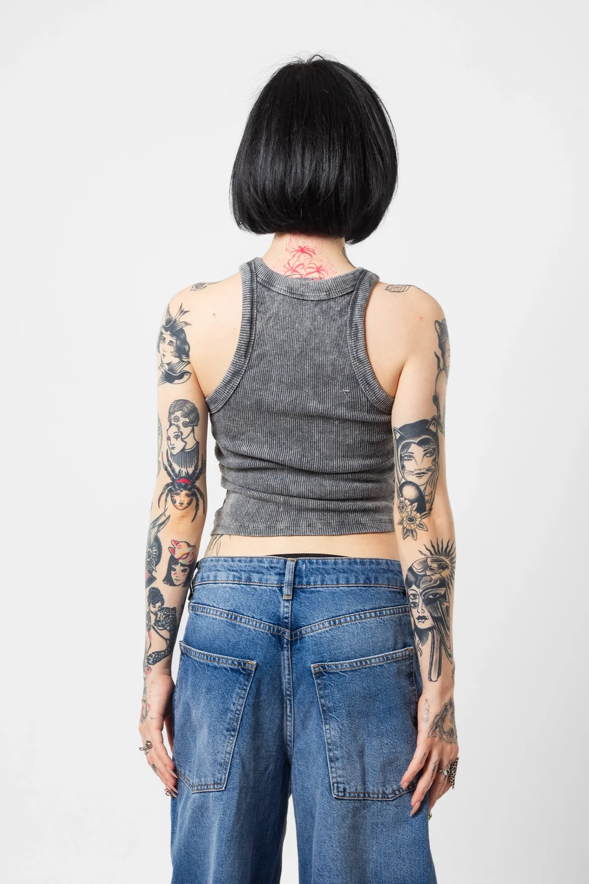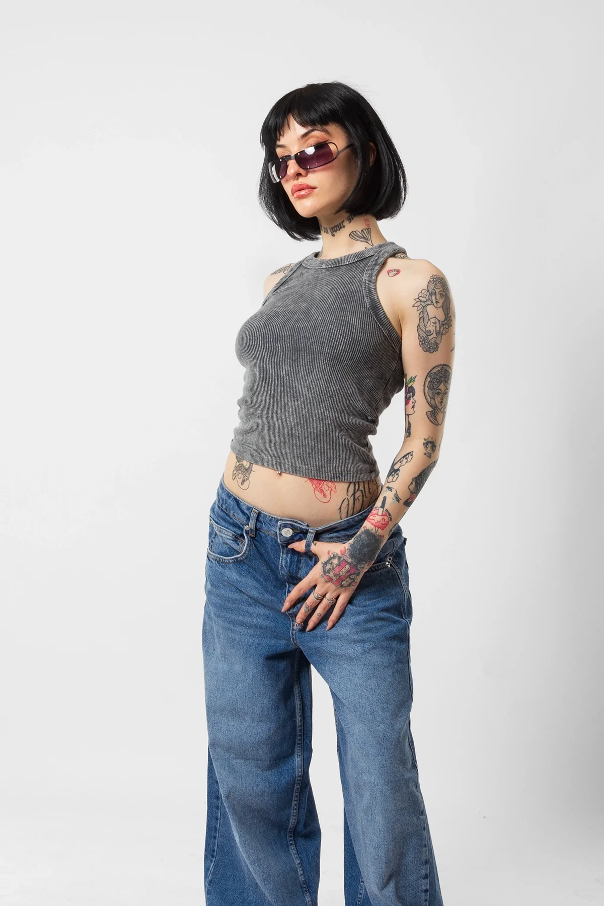 BASİC FİTİLLİ BATIK YIKAMALI FÜME SIFIR KOL CROP