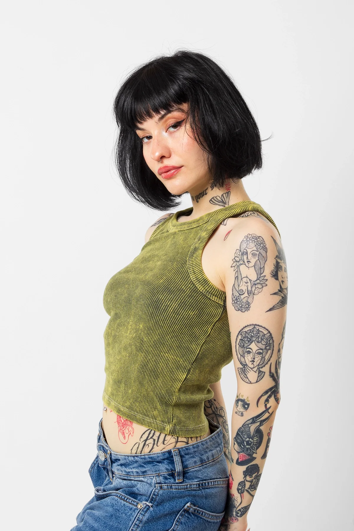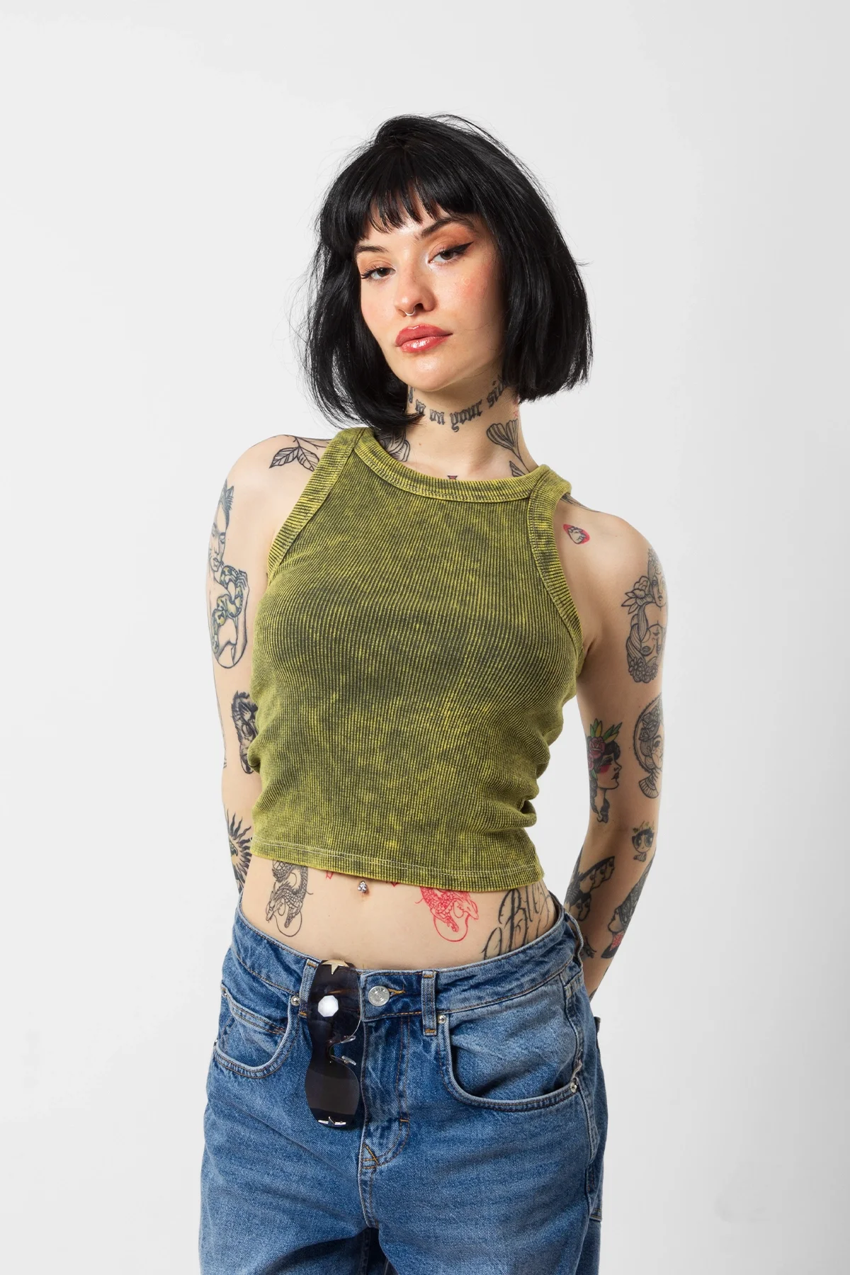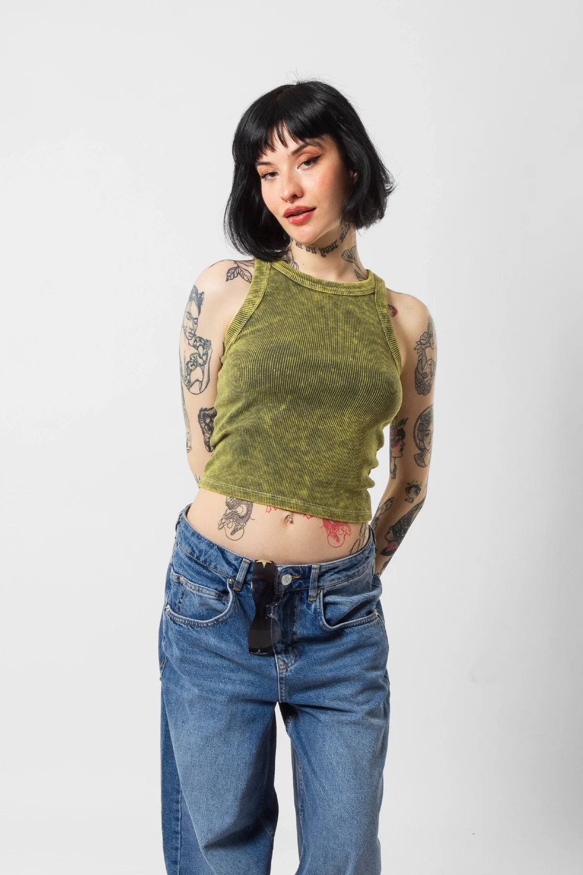 BASİC FİTİLLİ BATIK YIKAMALI YEŞİL SIFIR KOL CROP