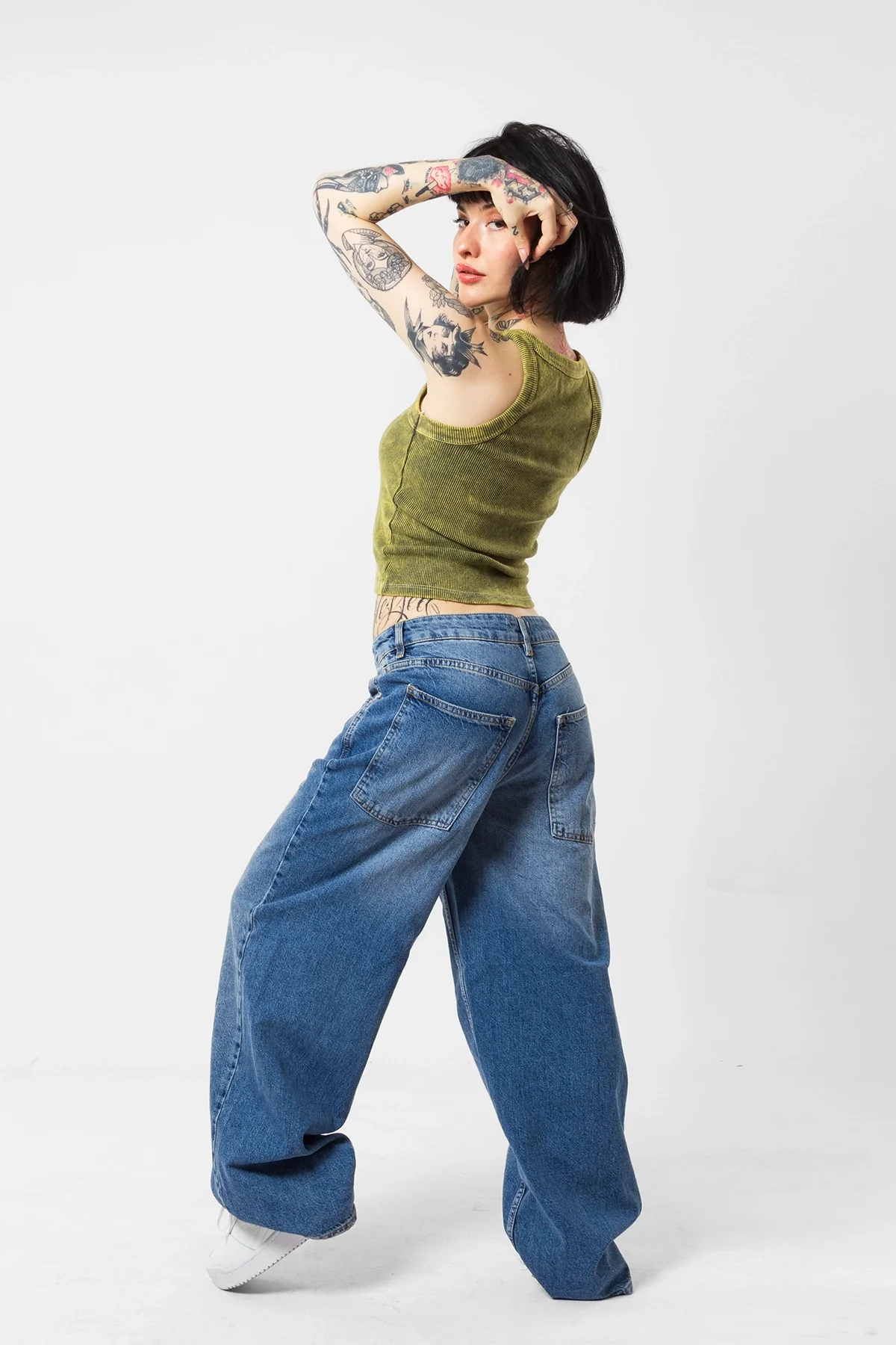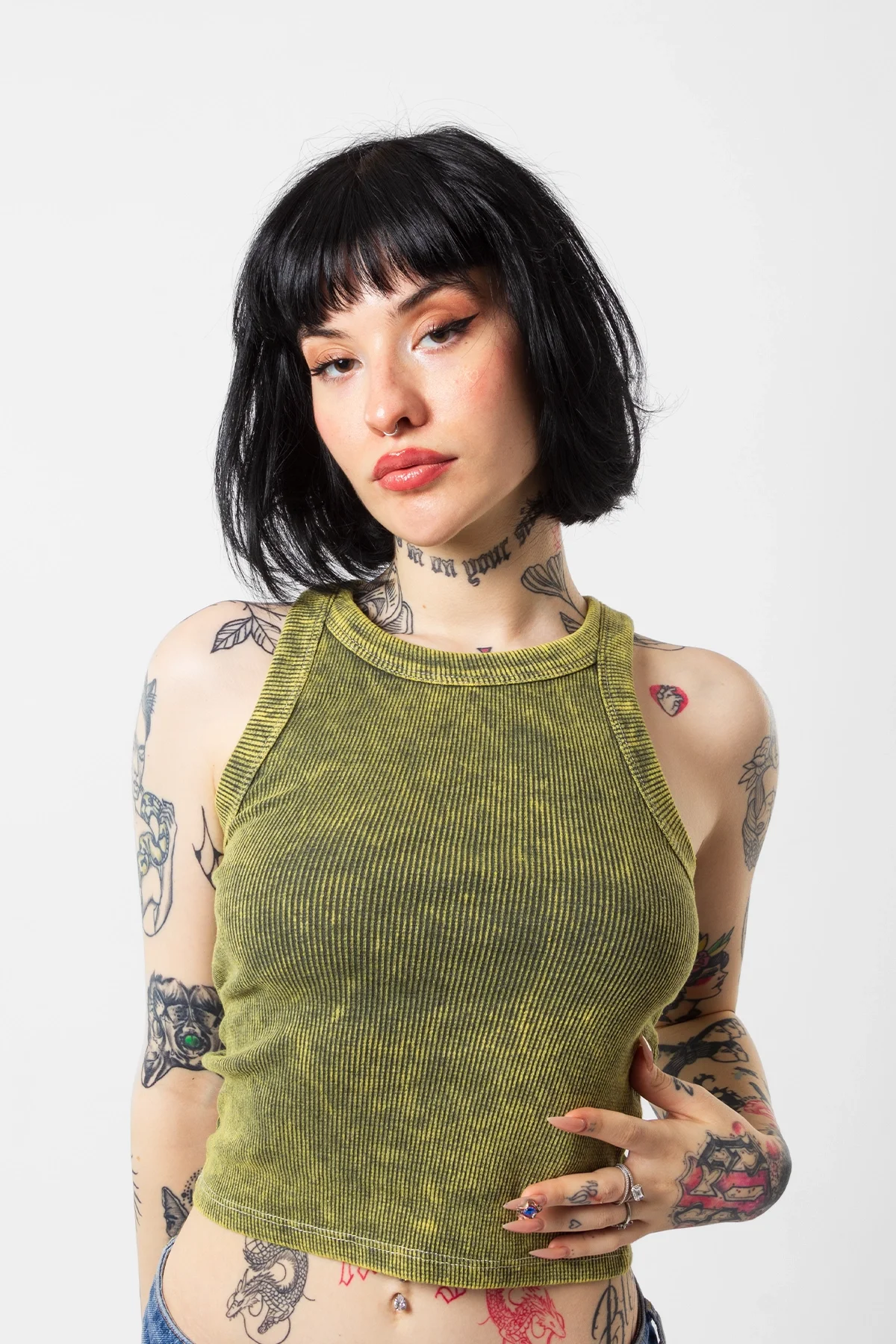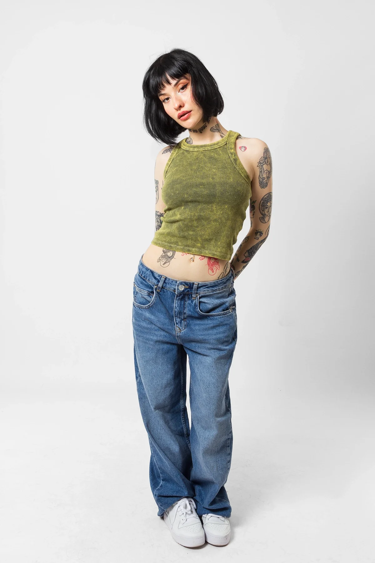 BASİC FİTİLLİ BATIK YIKAMALI YEŞİL SIFIR KOL CROP