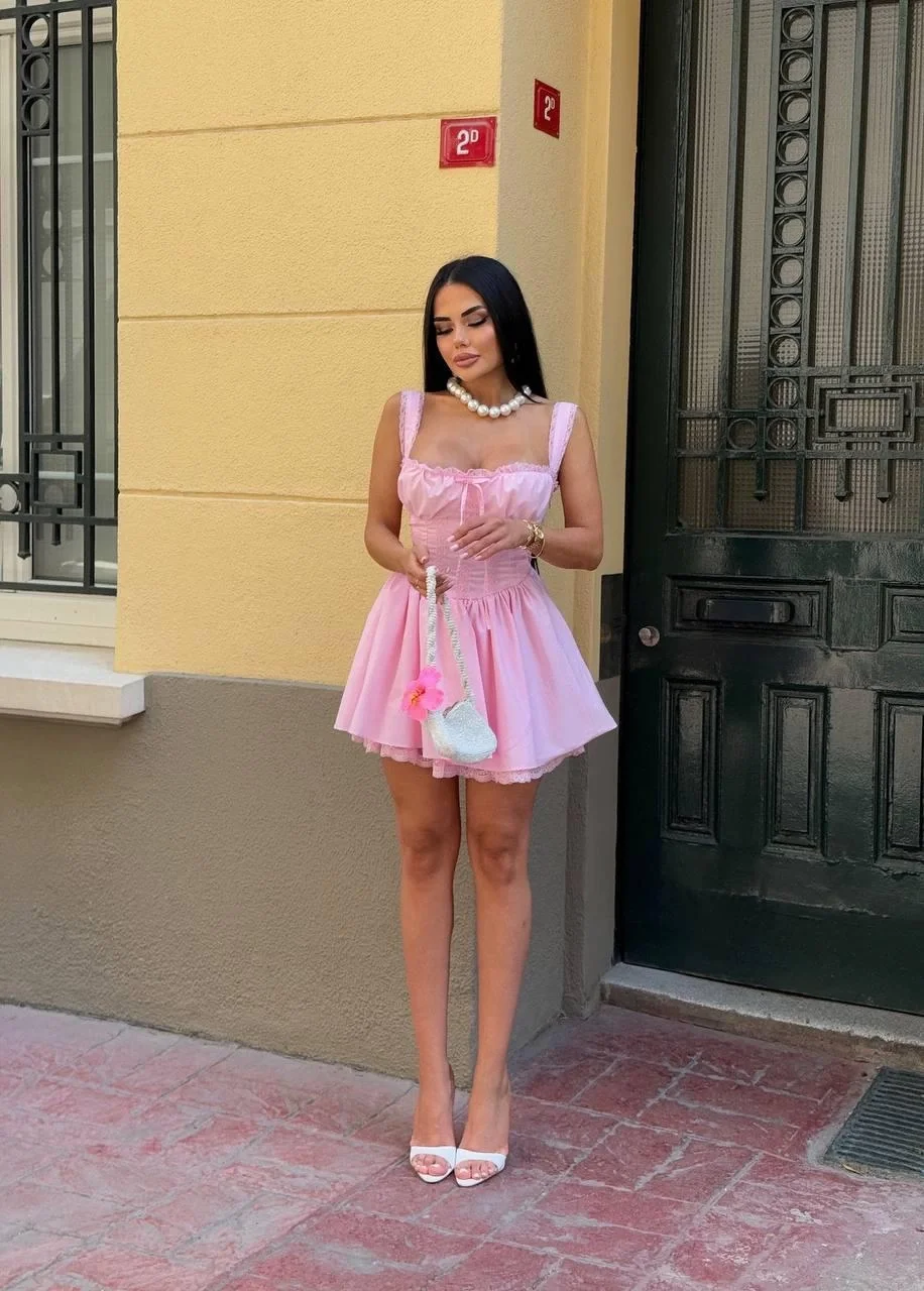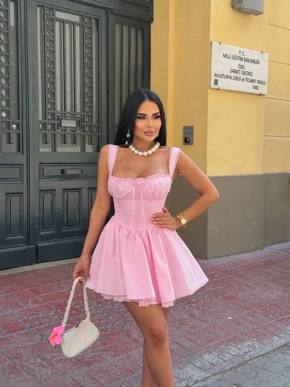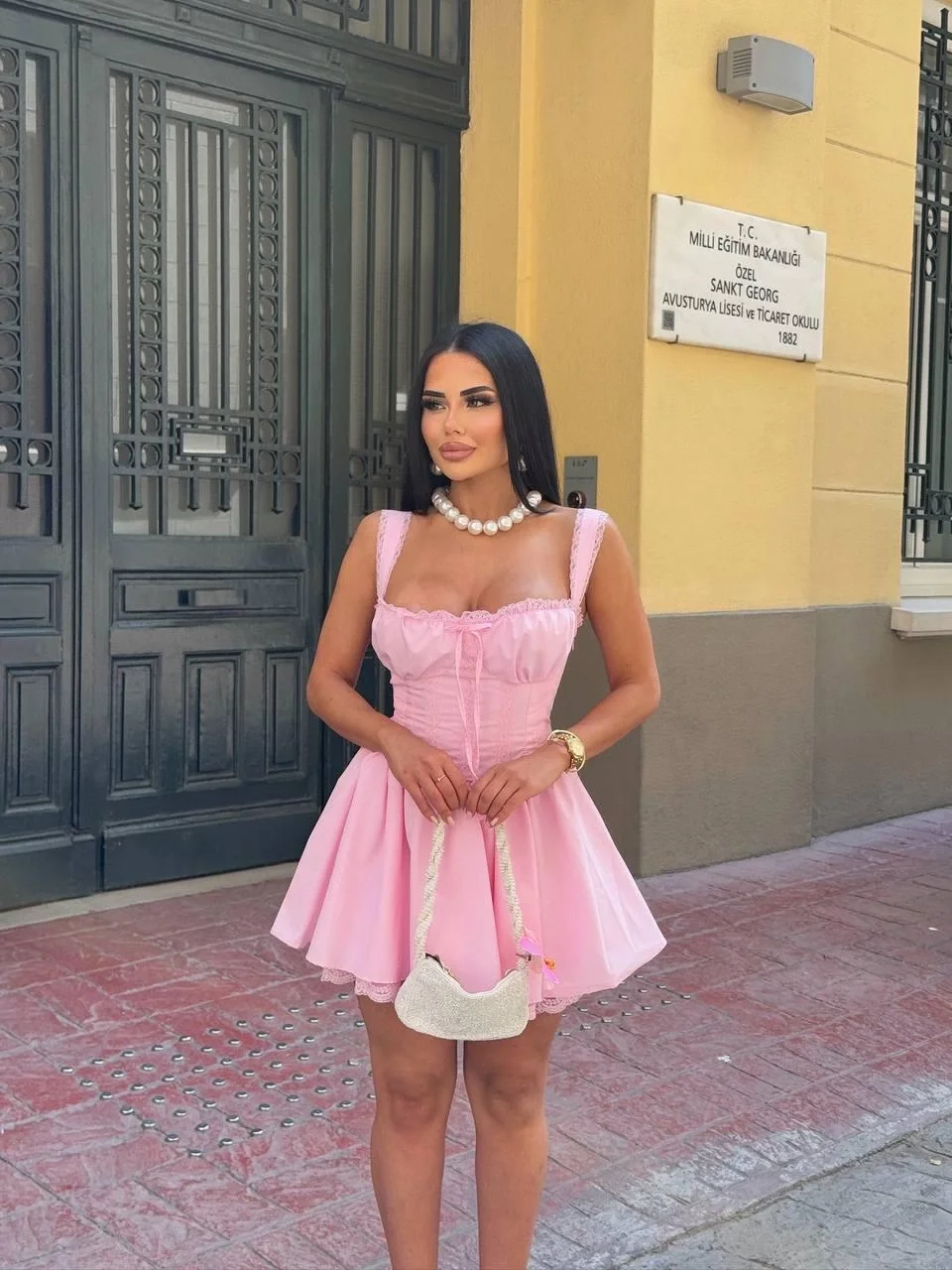 Zarafet ve şıklığın buluştuğu bu askılı dantel işlemeli elbise, özel günlerin vazgeçilmezi olacak. İnce askıları ve vücudu saran kesimiyle feminen bir siluet sunarken, özenle işlenmiş dantel detaylar romantik ve sofistike bir hava katıyor.