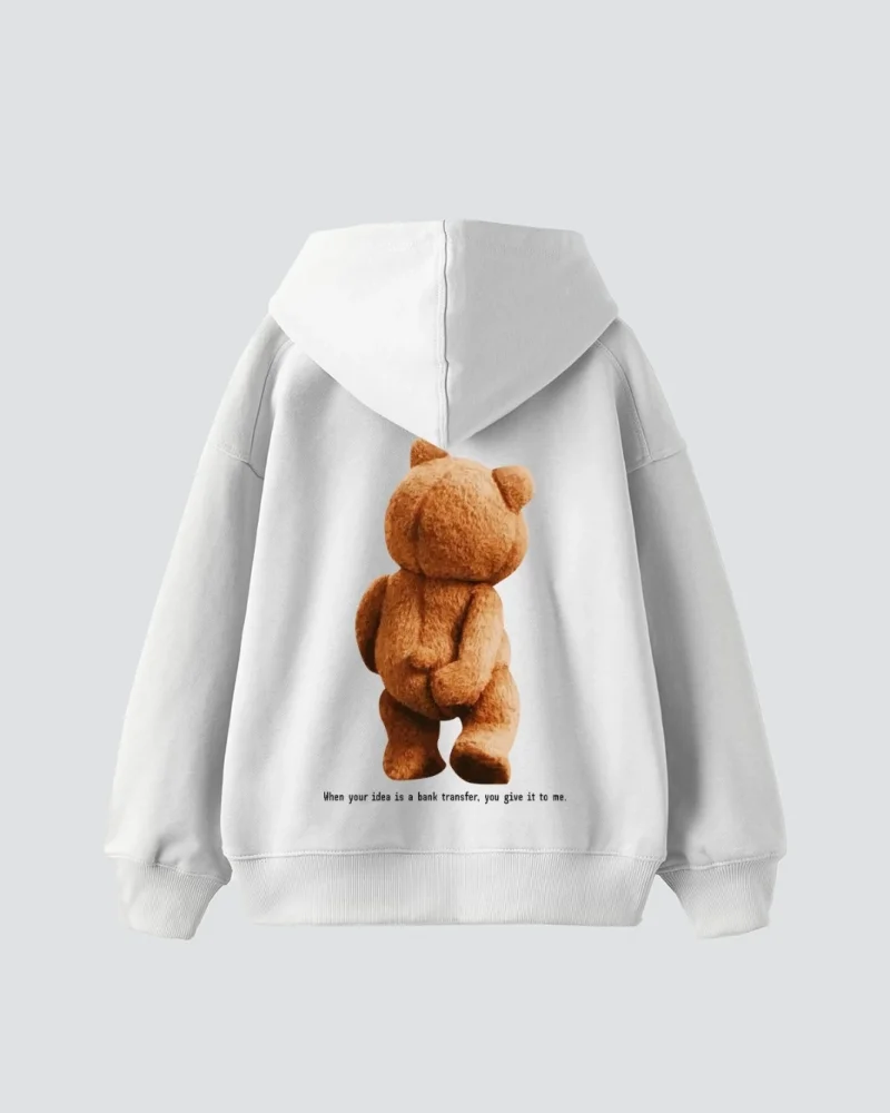 Bear Sırt Baskılı Oversize Unisex Beyaz Hoodie