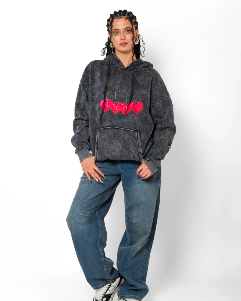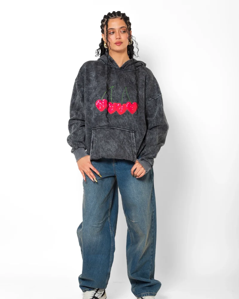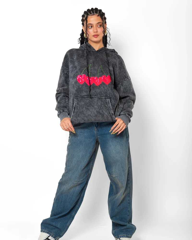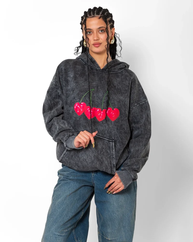 Cherry Nude Baskılı Oversize Unisex Premium Yıkamalı Siyah Hoodie