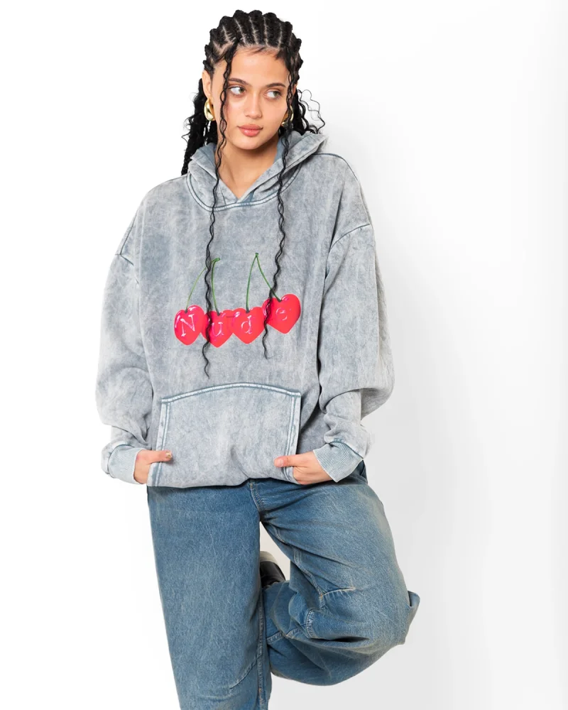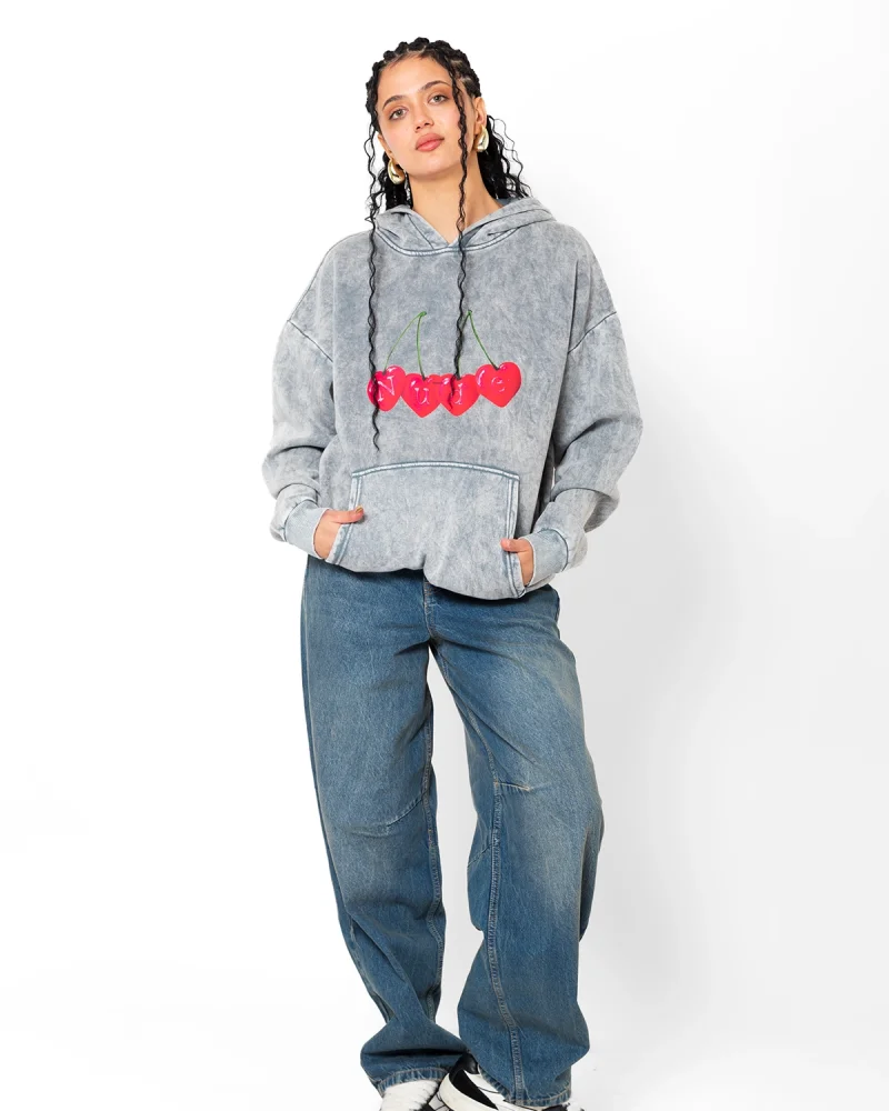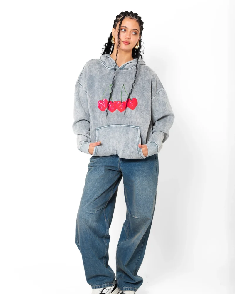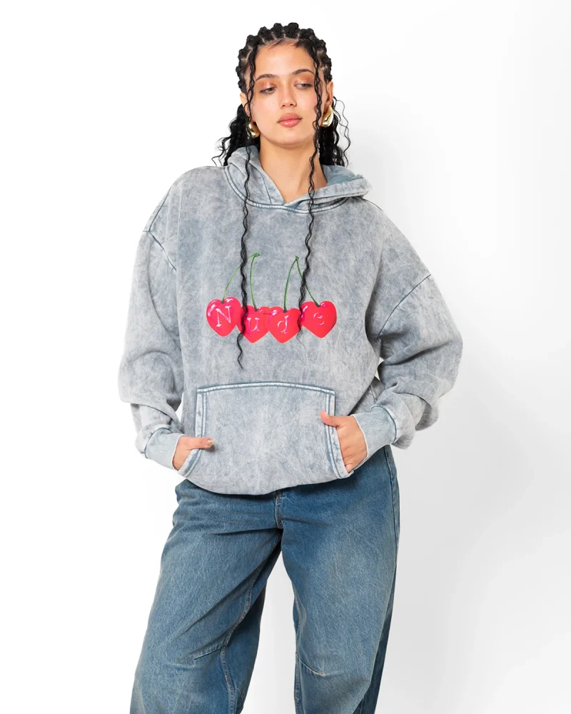 Cherry Nude Baskılı Oversize Unisex Premium Yıkamalı Siyah Hoodie