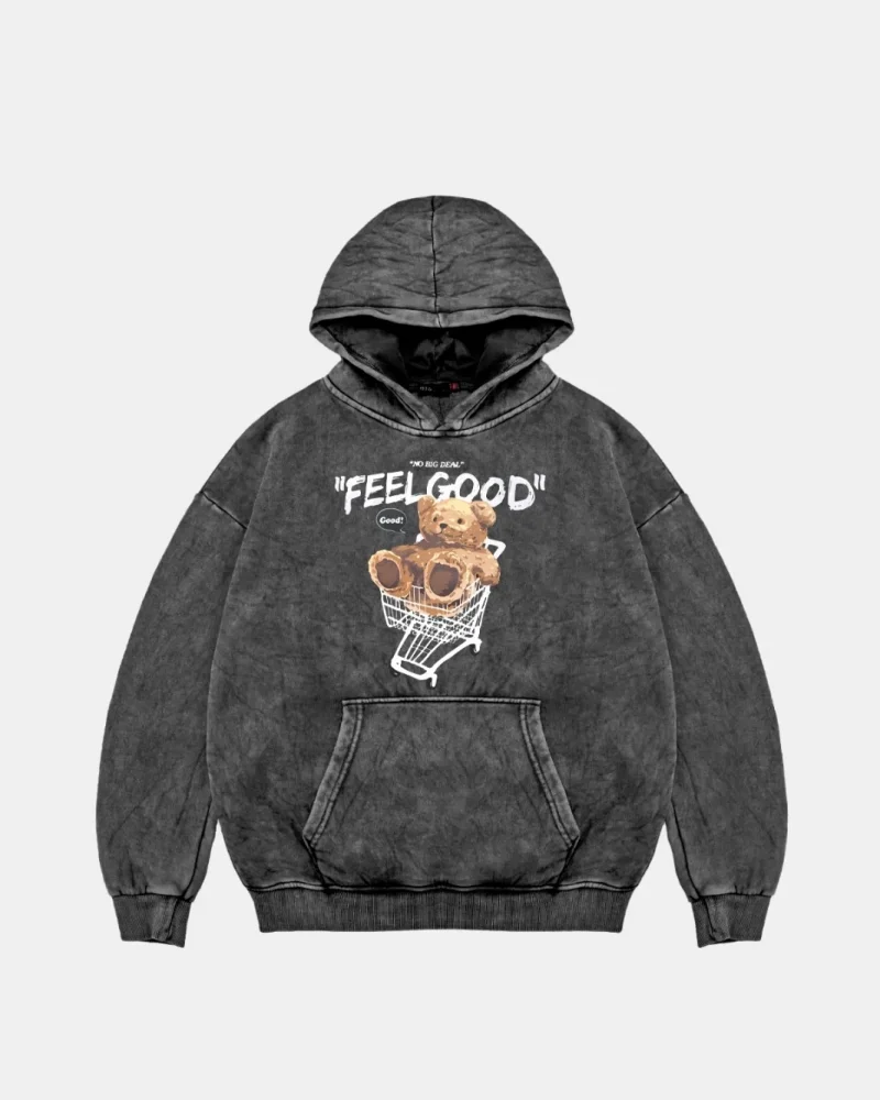 Feel Good Baskılı Oversize Unisex Yıkamalı Siyah Hoodie