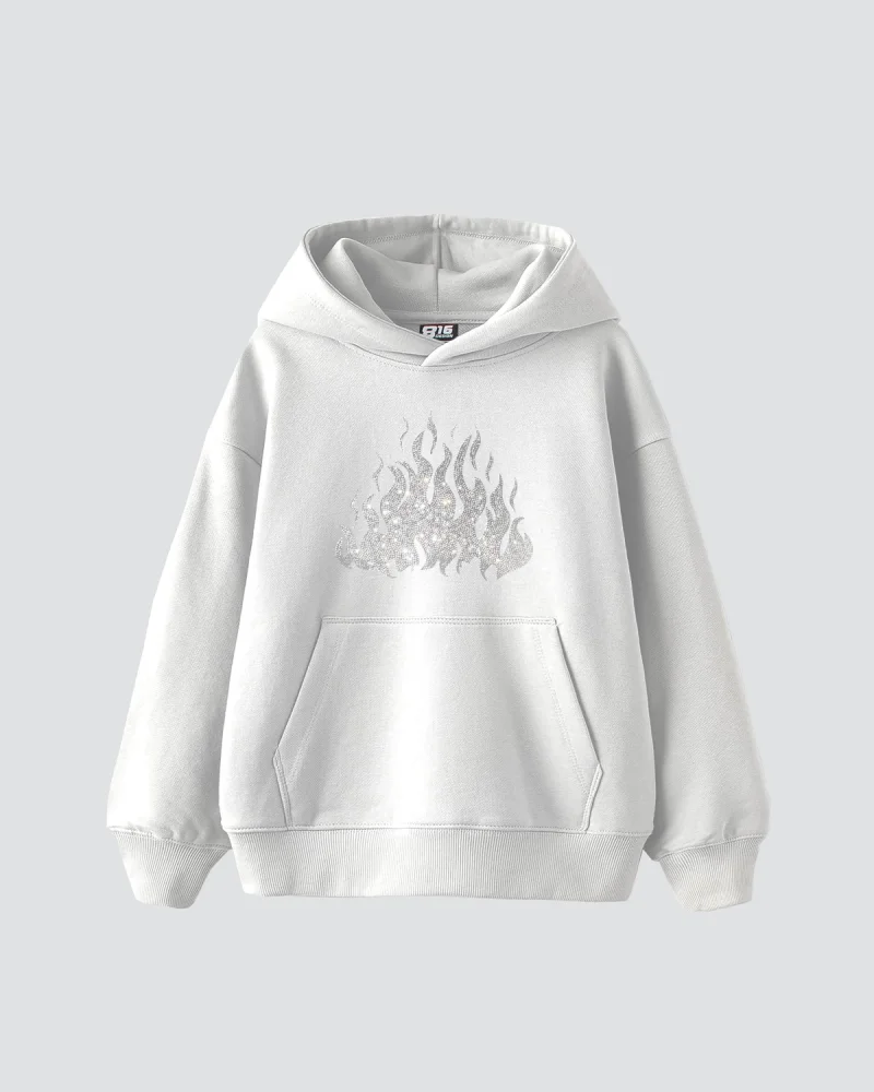 Flame Taş Baskılı Oversize Unisex Beyaz Hoodie