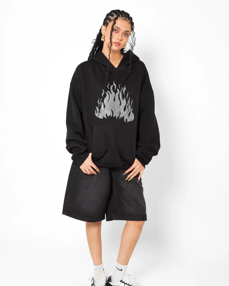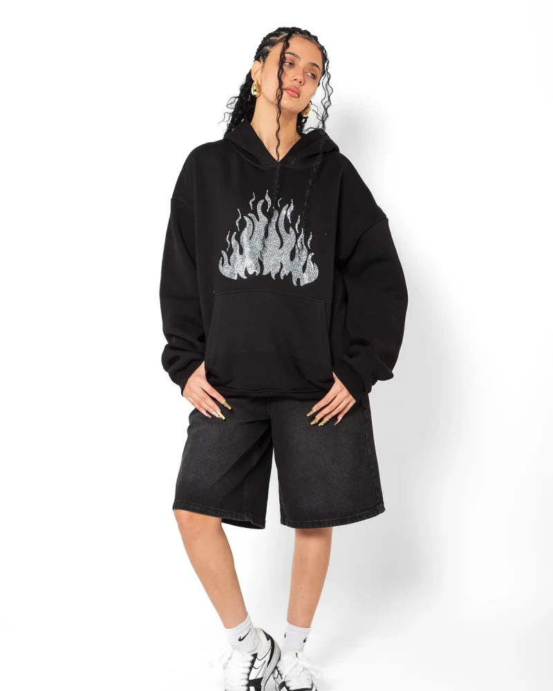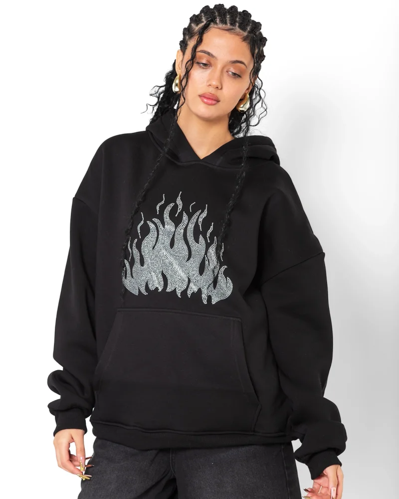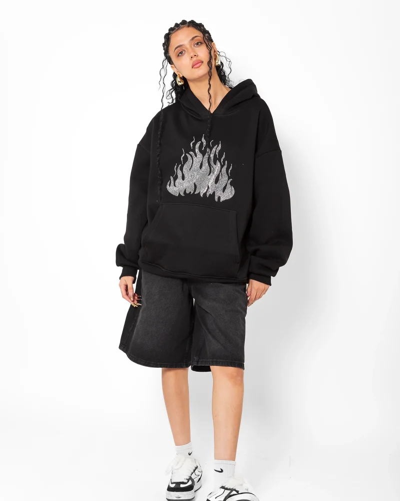Flame Taş Baskılı Oversize Unisex Siyah Hoodie