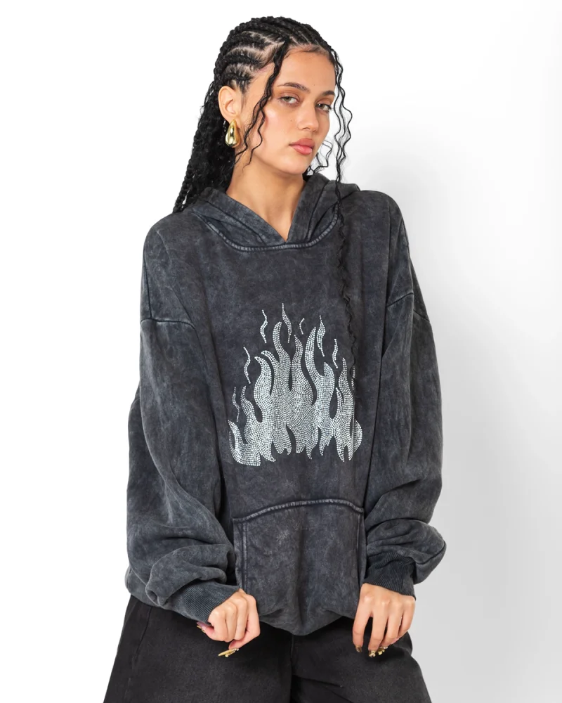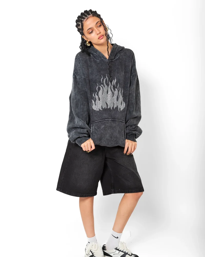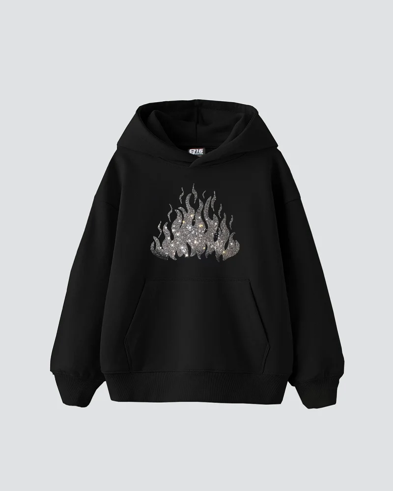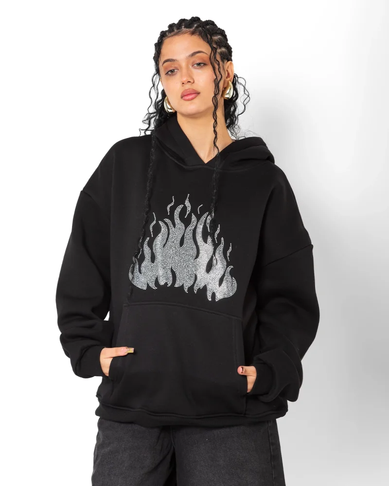 Flame Taş Baskılı Oversize Unisex Siyah Hoodie