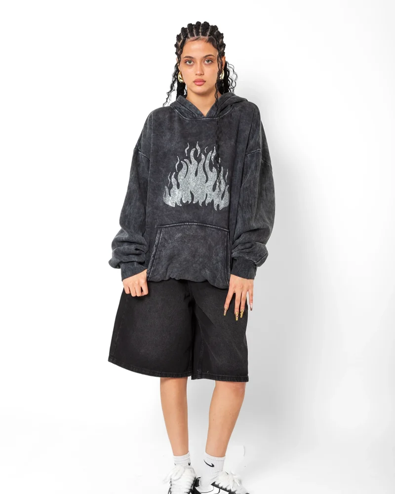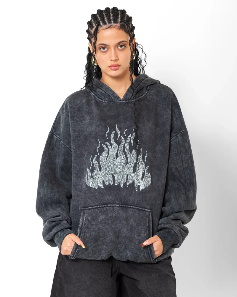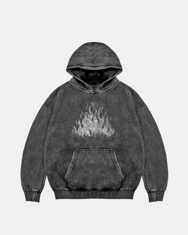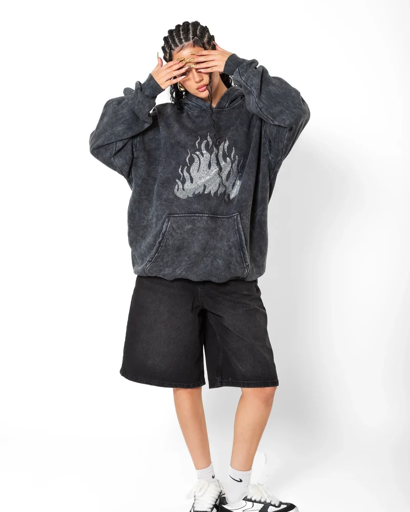 Flame Taş Baskılı Oversize Unisex Yıkamalı Siyah Hoodie